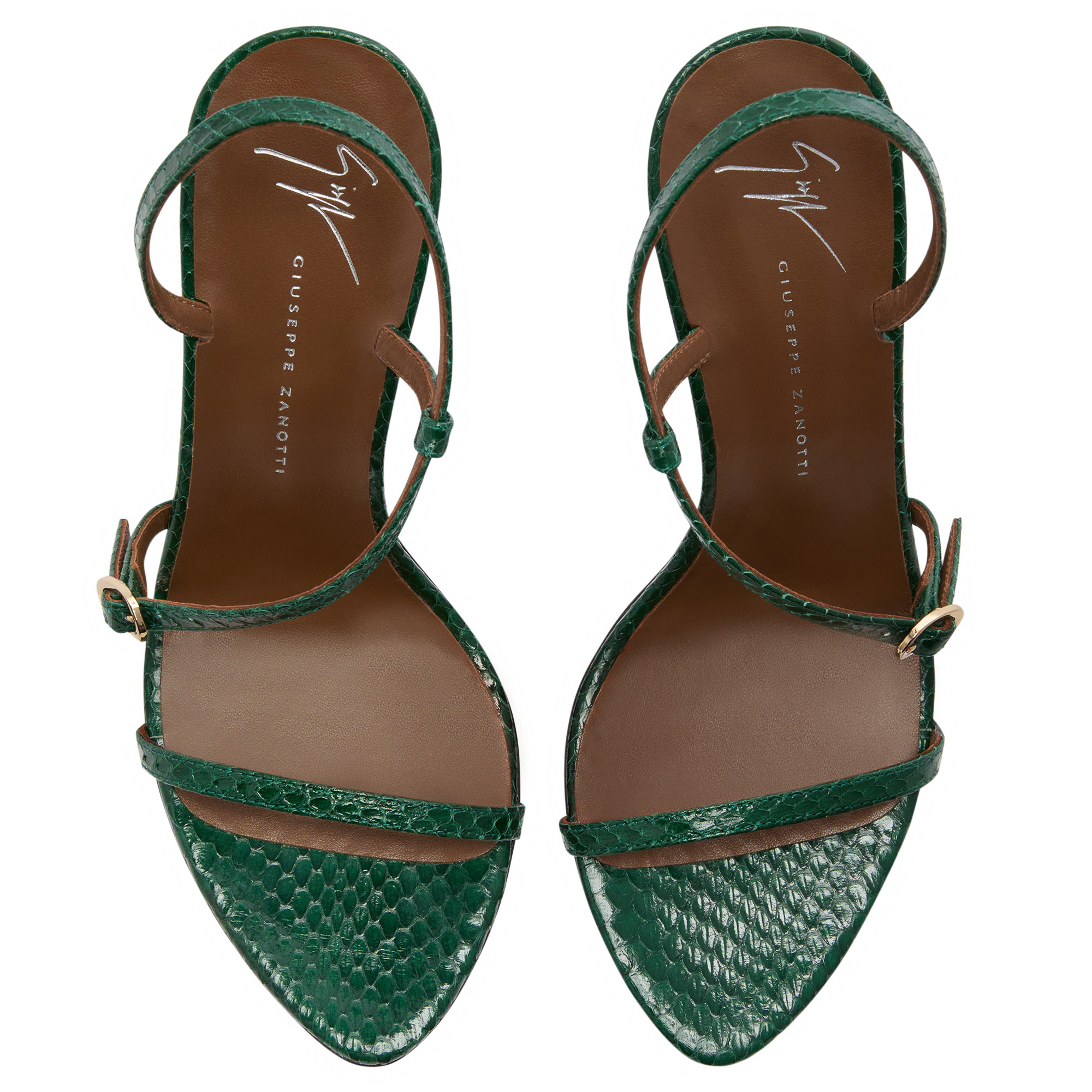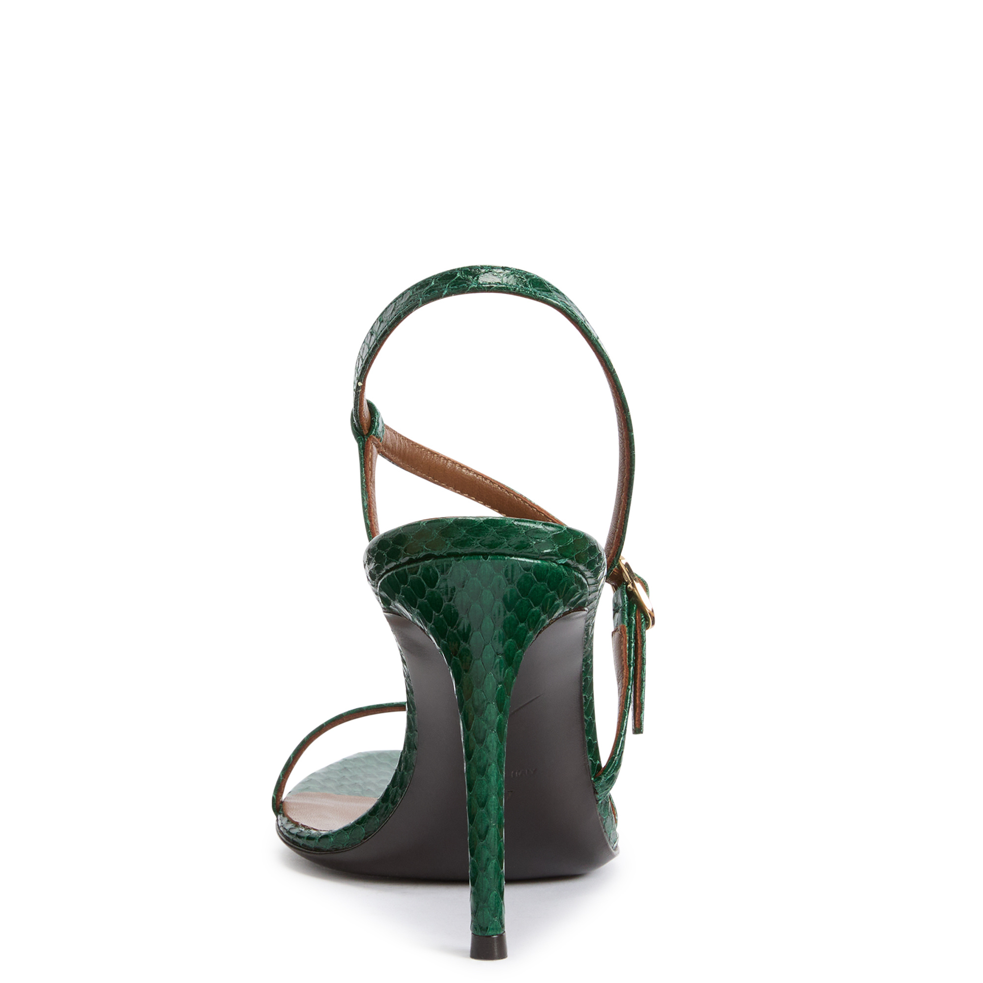 Sandals in Elaphe Carinata snakeskin with thin straps, metal buckles and stiletto heel.
