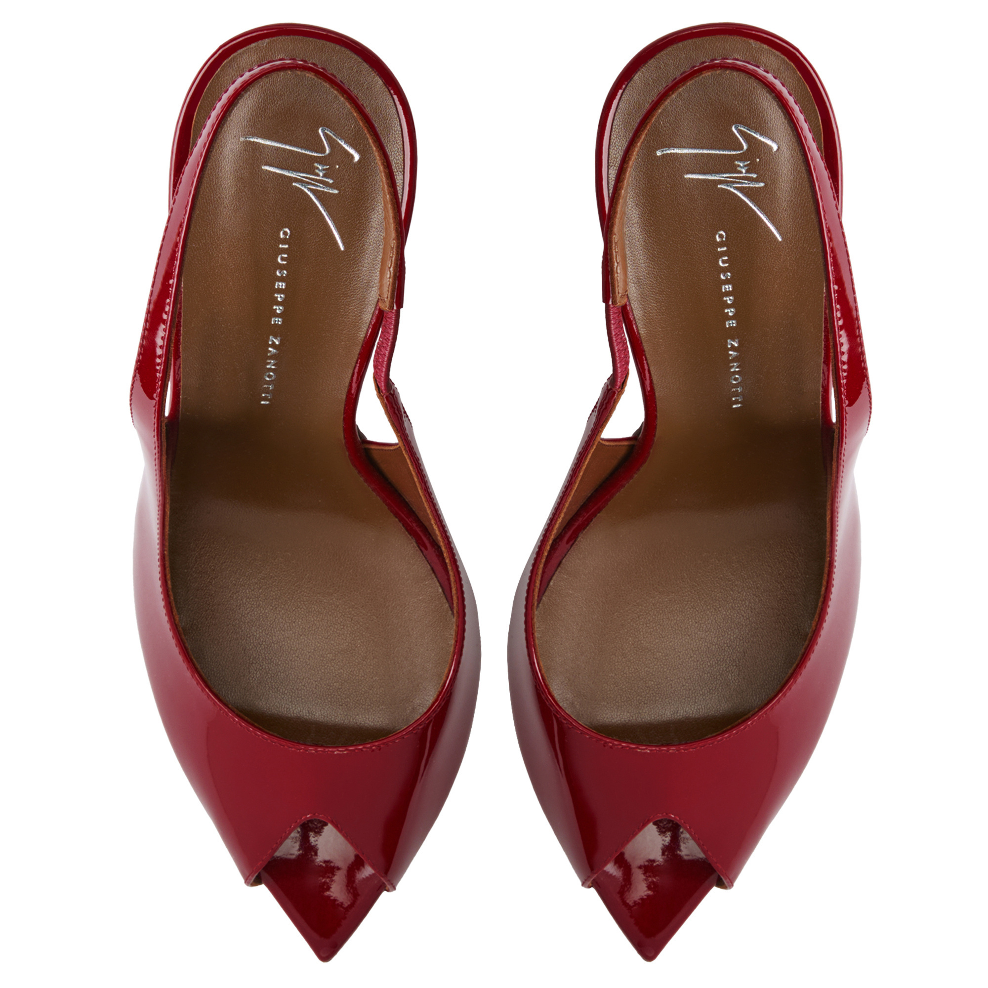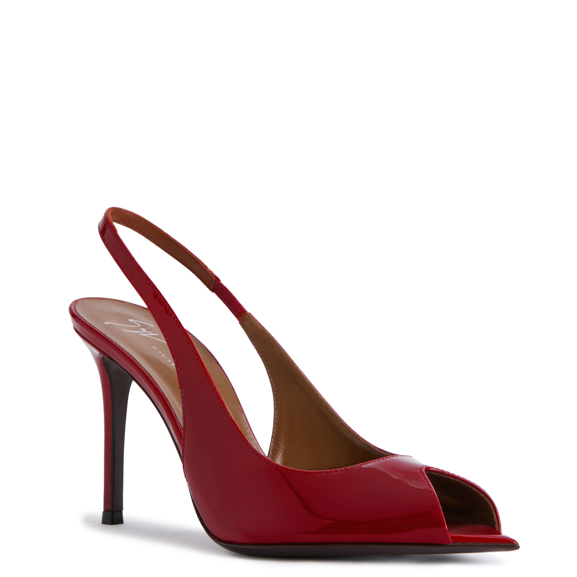 Open-toe slingback sandals in patent leather with geometric topline, pointed insole and stiletto heel.