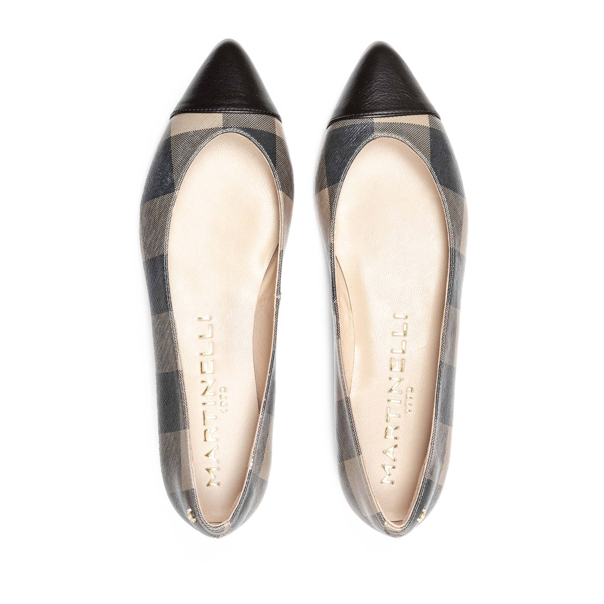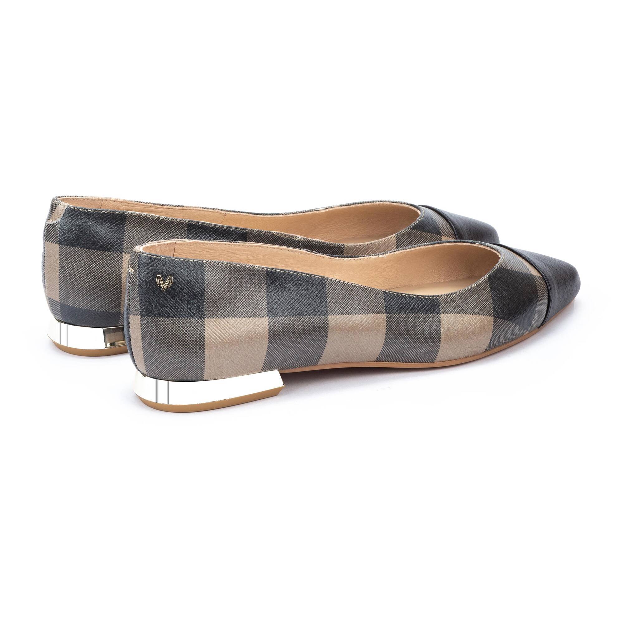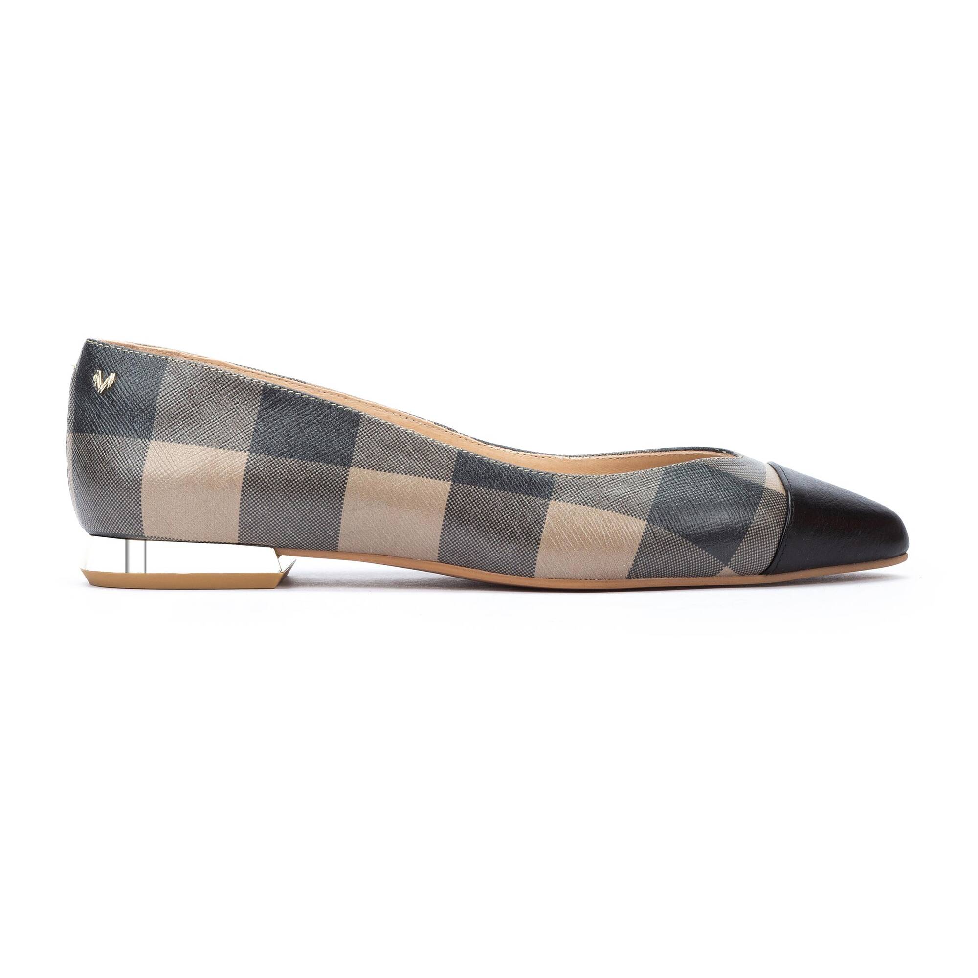 Su diseño print de cuadros vichy de esta temporada y su tacón bajo metalizado de 2,5 cm de altura, hace de esta bailarina un básico de lo más elegante.