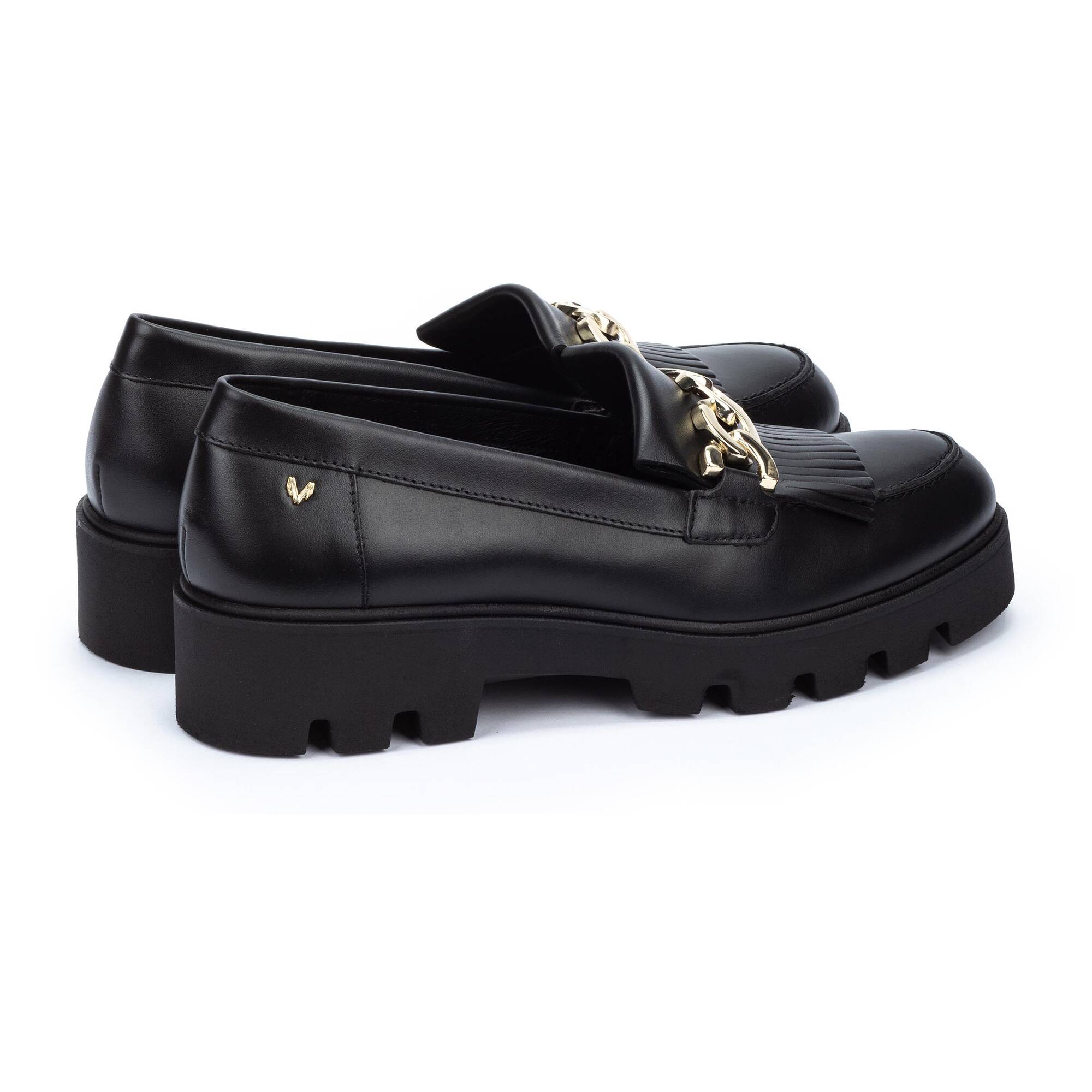 Mocasín en color negro con suela dentada y adorno de cadena metálico.