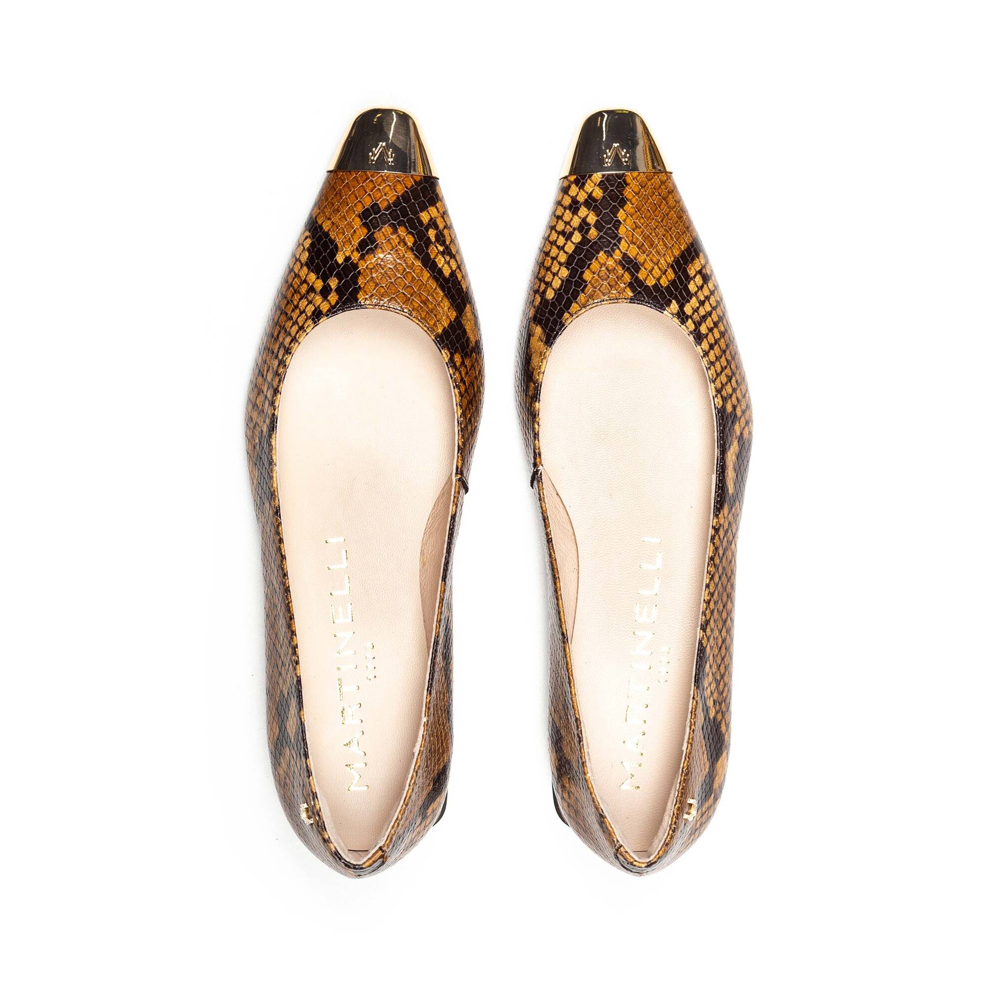Detalle metálico dorado en la punta y estampado de serpiente.