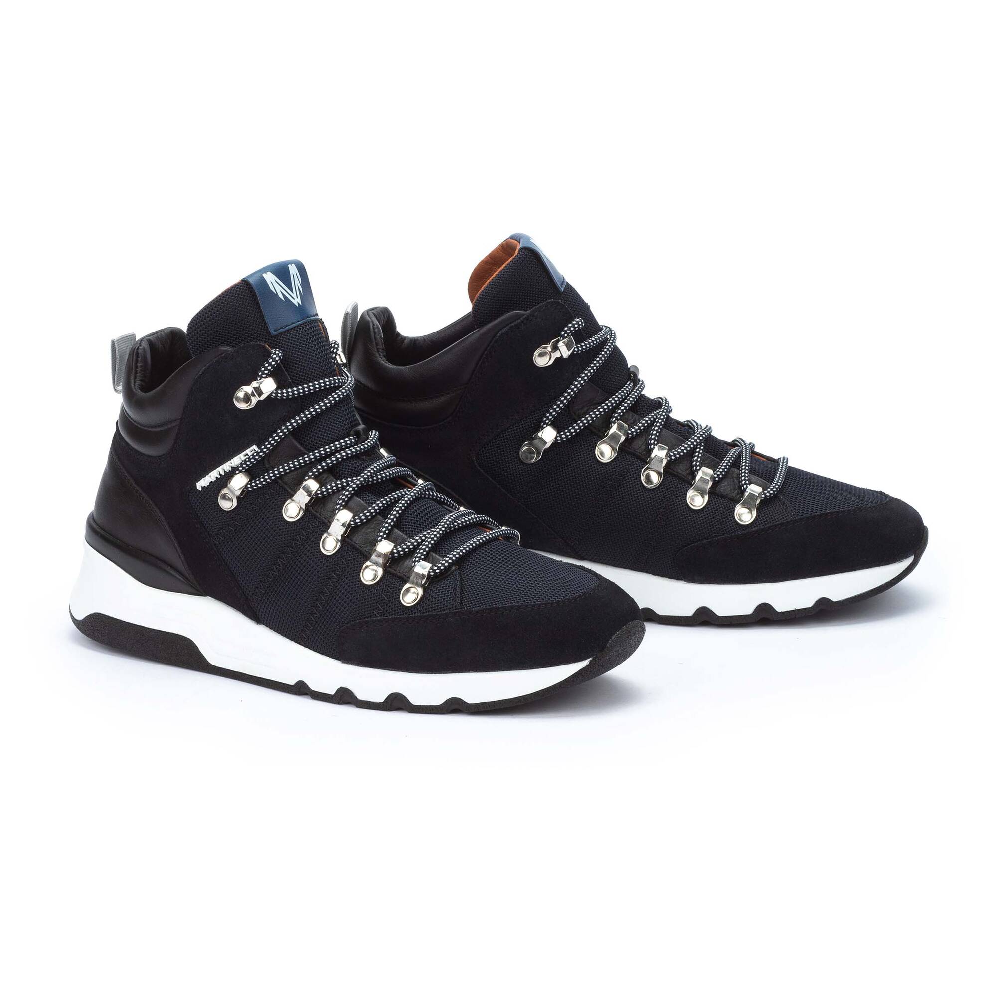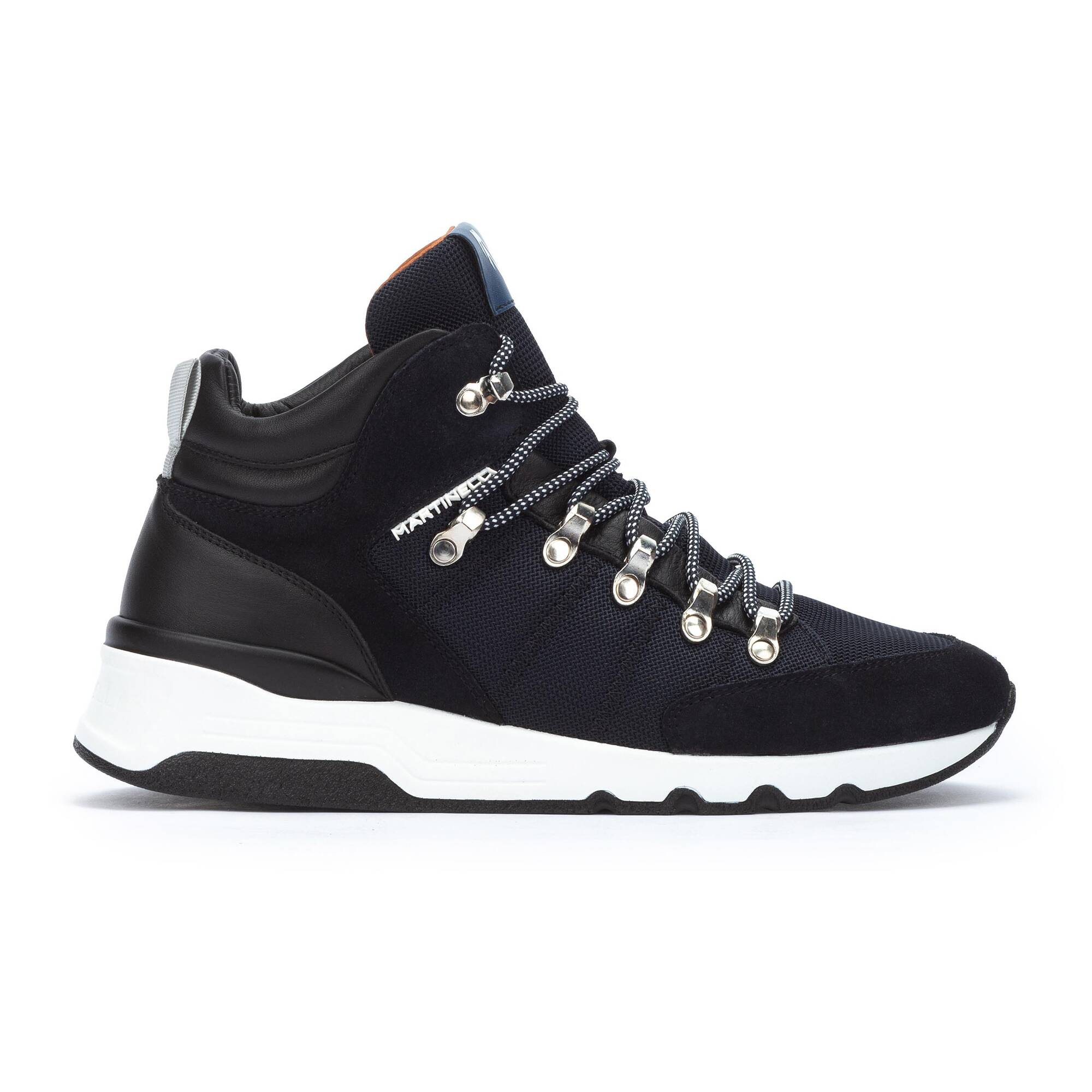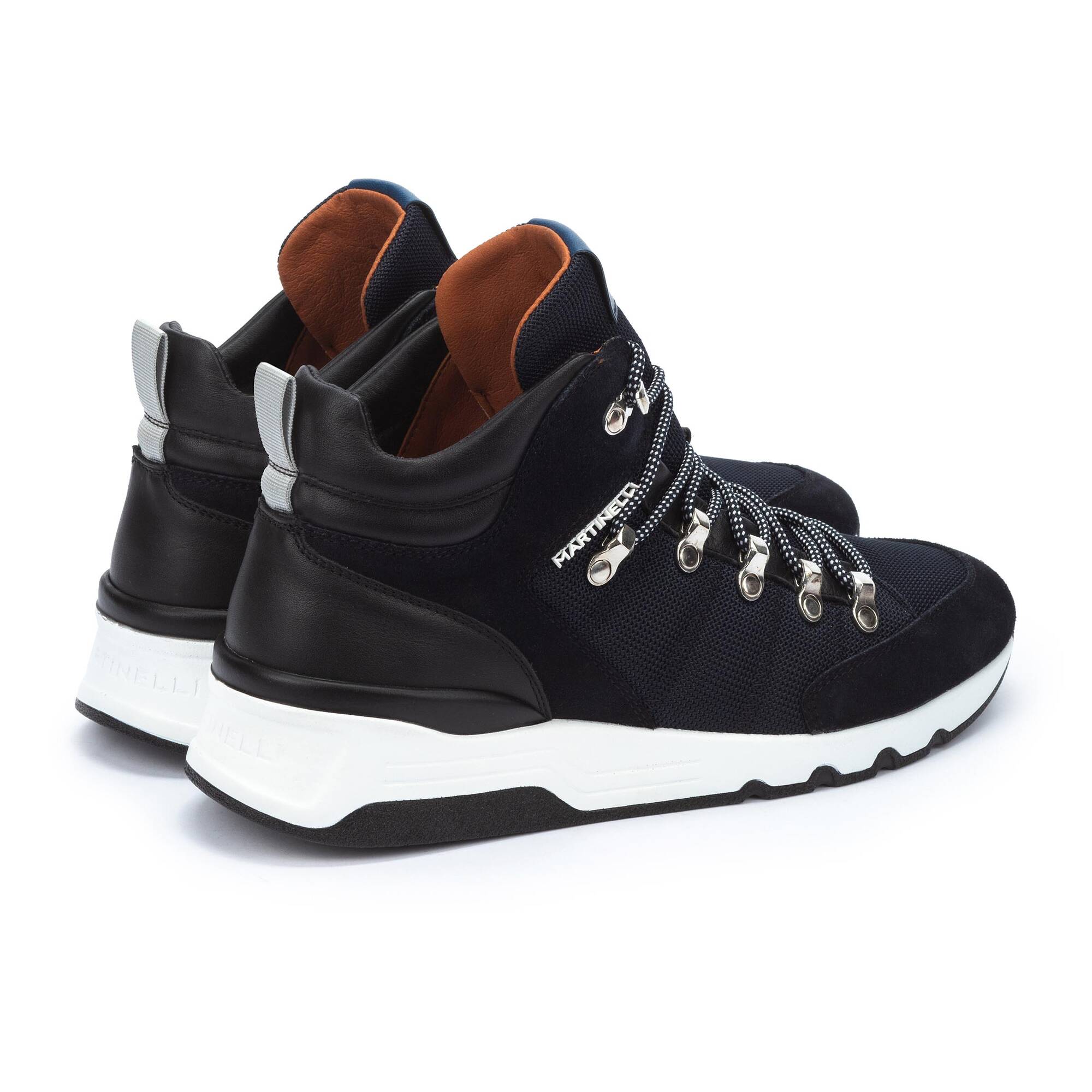 Tendencia trekking representada en un modelo botín, donde los apliques montañeros y la combinación de los materiales de serrajes y tejidos técnicos acercan el mundo de la montaña al look casual Martinelli.