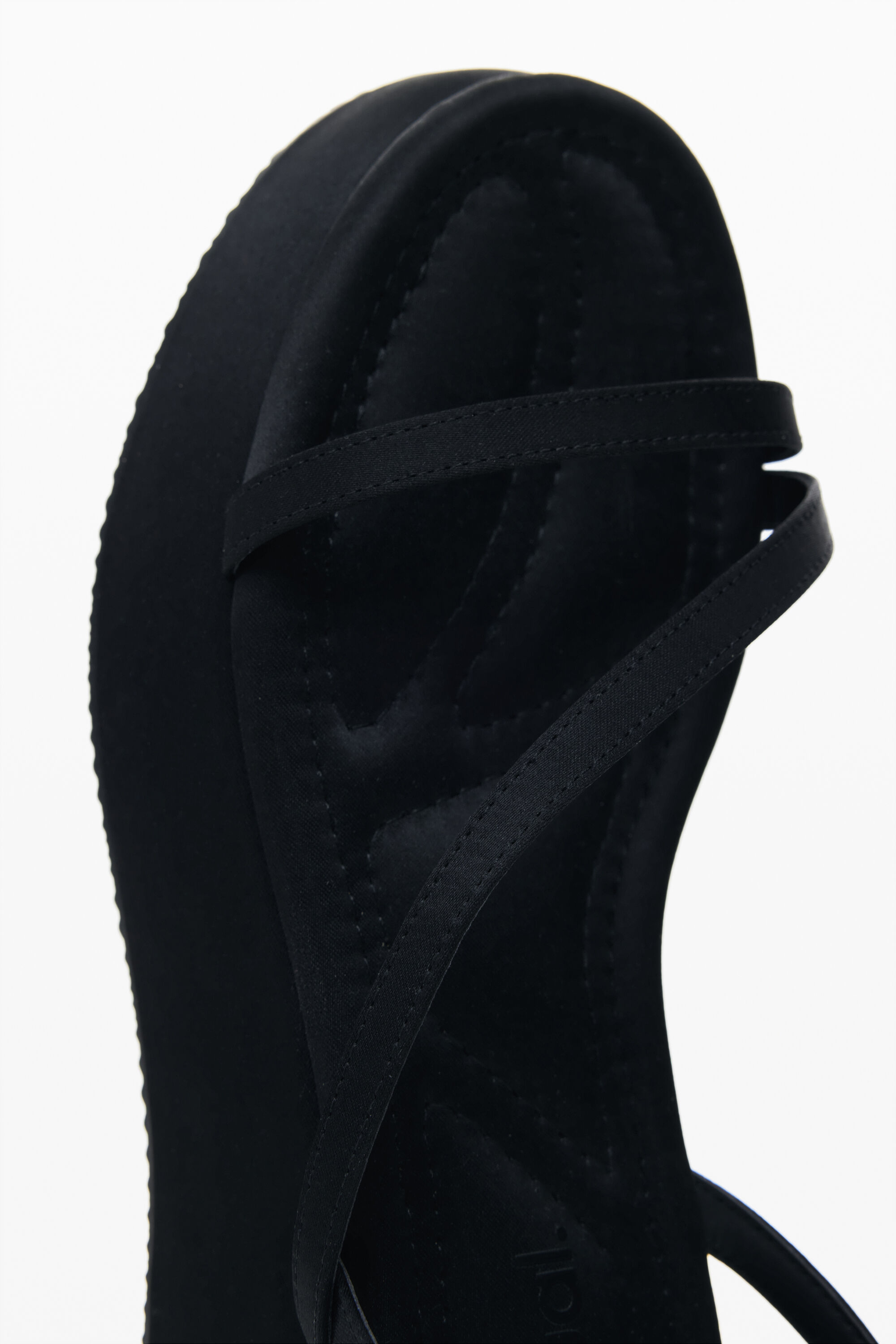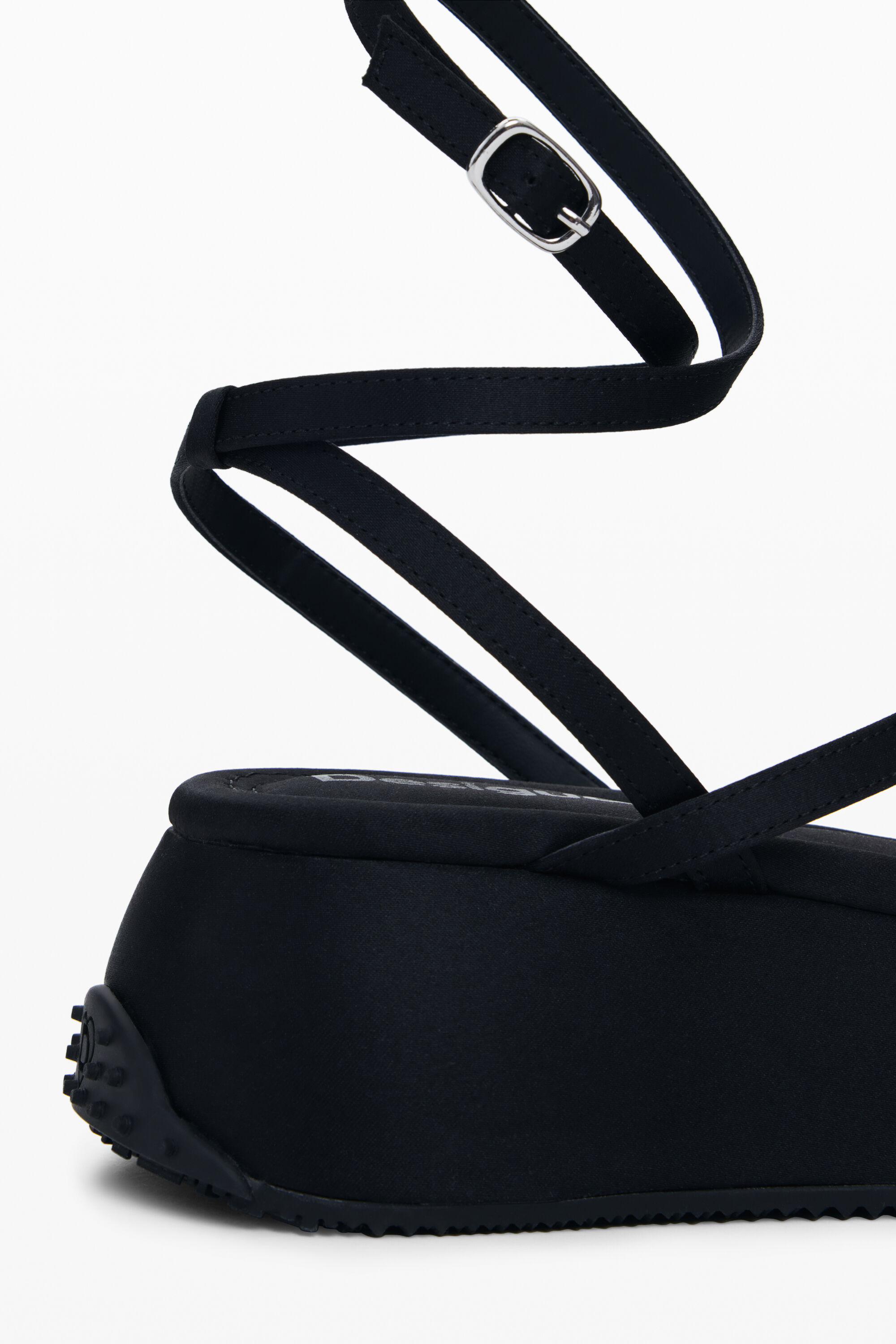 Sandali in gomma, con ampia piattaforma, a fasce, con lacci legati alla caviglia in colore tinta unita.Nastri legati alla cavigliaCon plateau