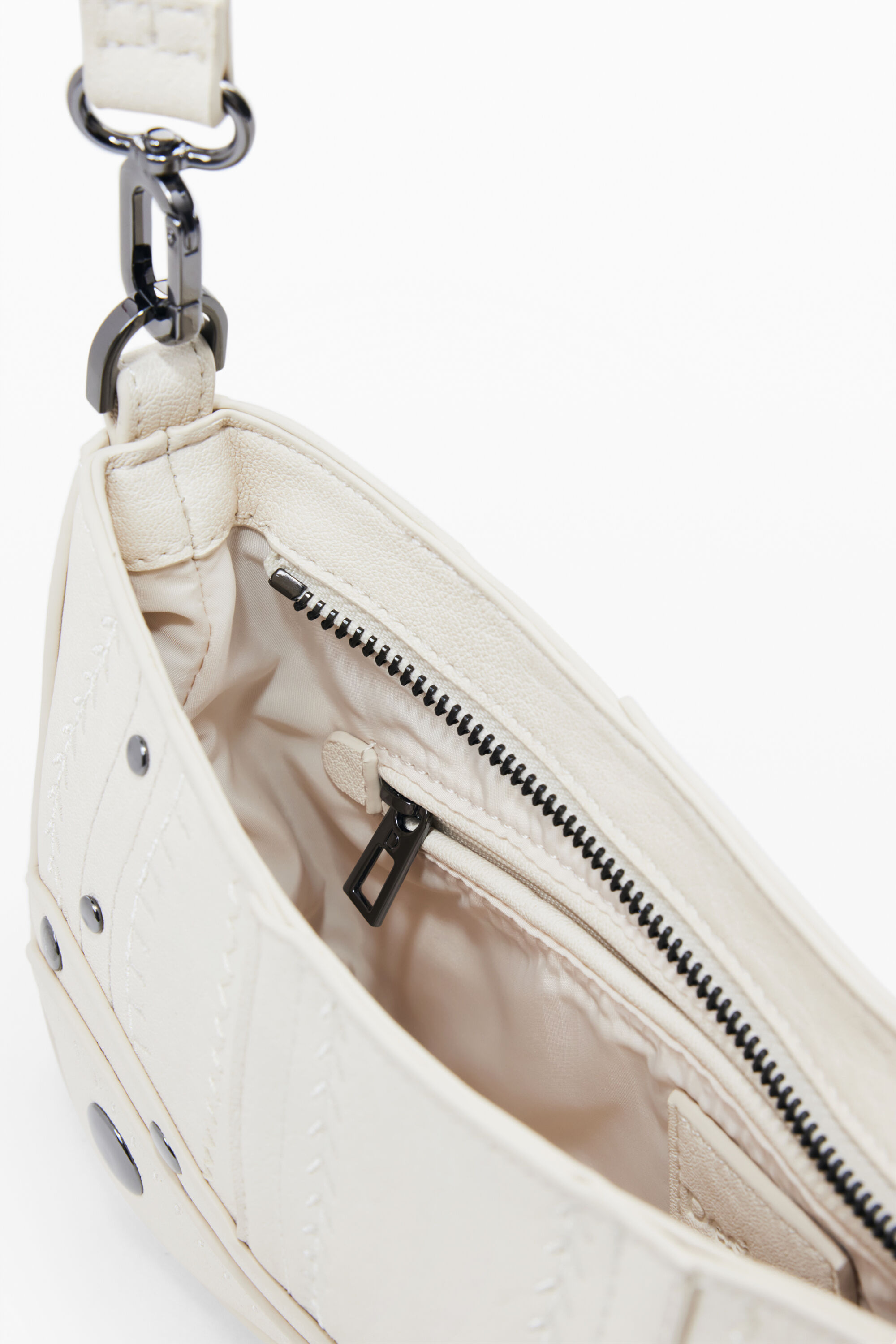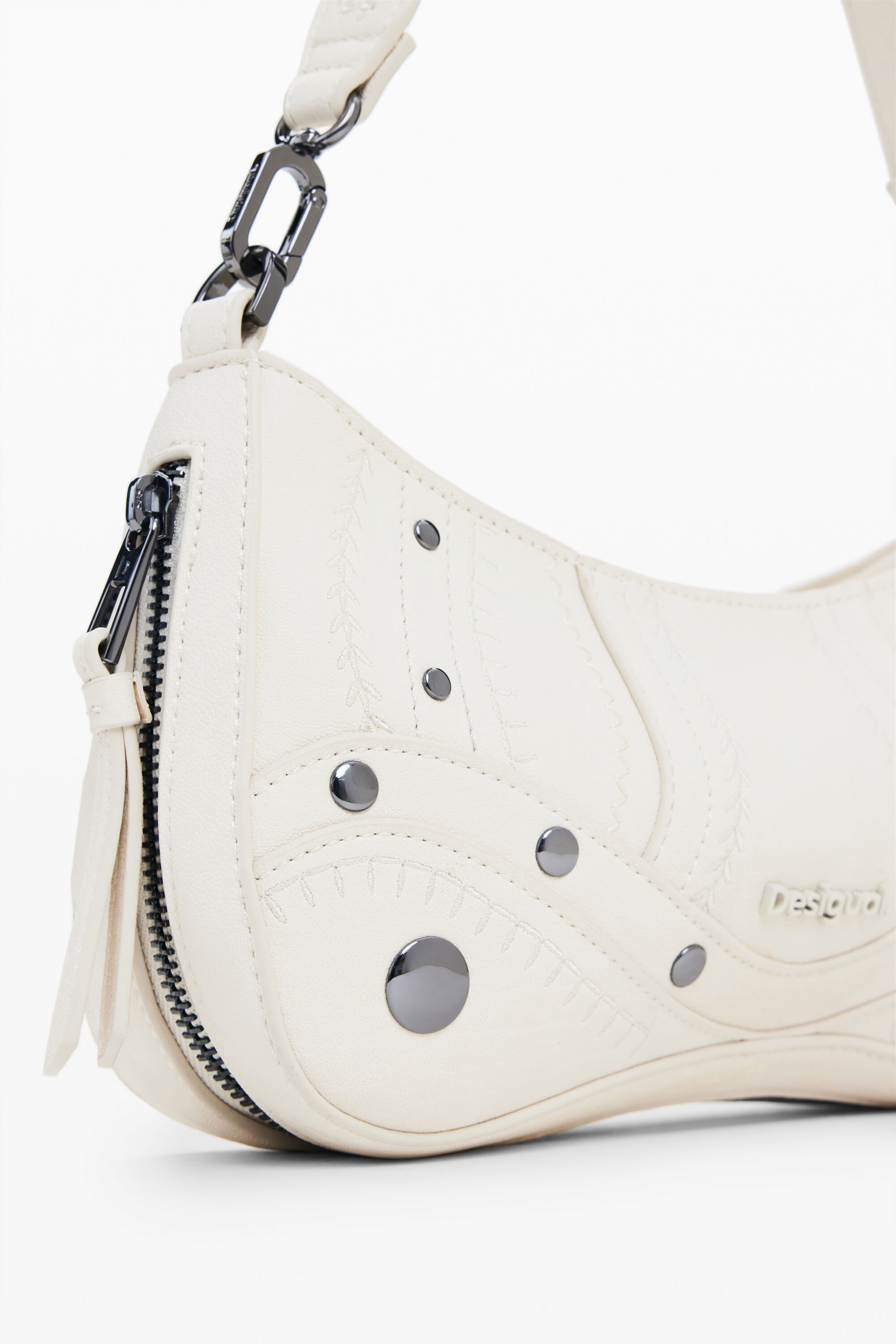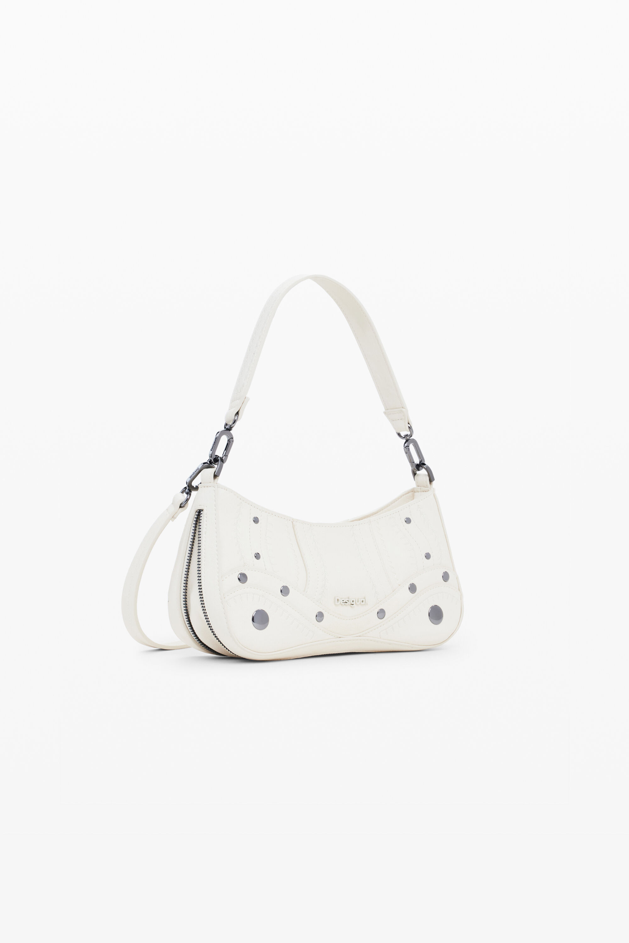 Borsa piccola in tessuto effetto pelle, chiusura con cerniera e dettaglio di ricami e applicazioni metalliche.
