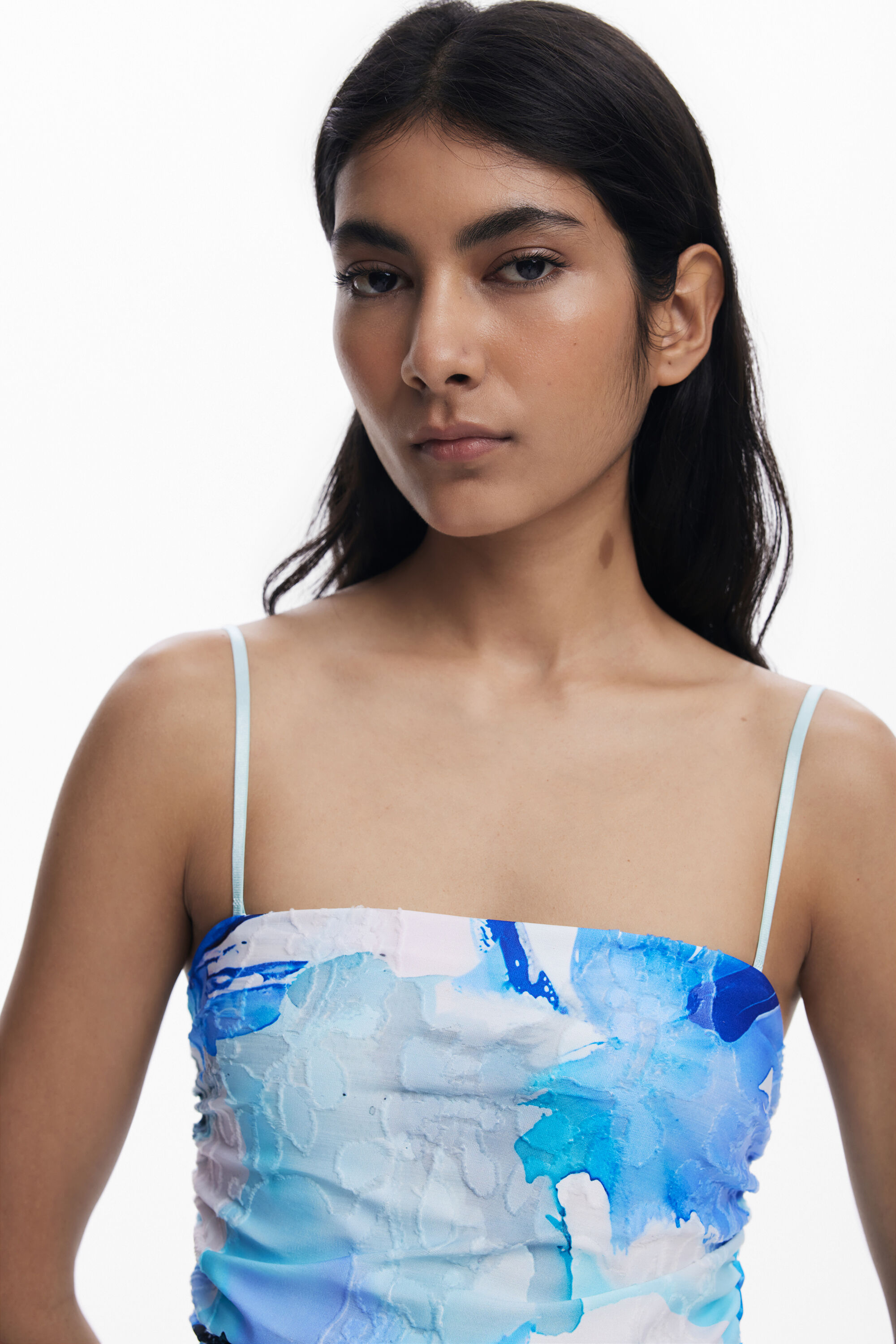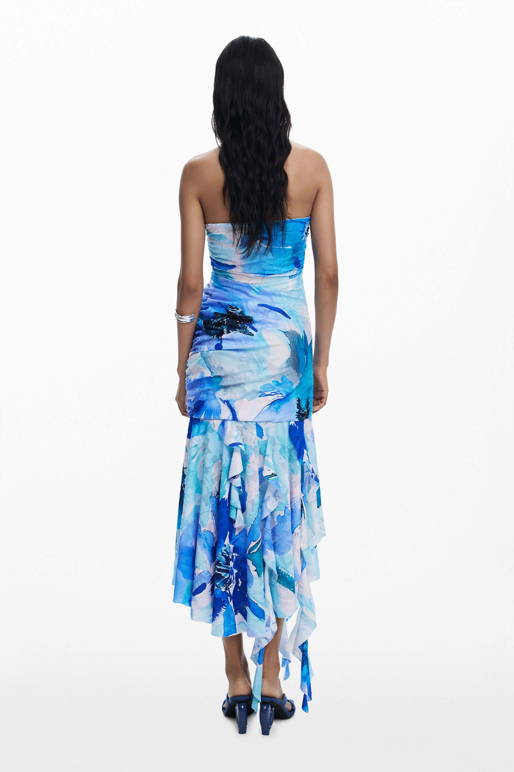Abito con scollo a fascia, spalline sottili regolabili e rimovibili, con drappeggio e gonna asimmetrica con volant e stampa floreale in tonalità azzurre.Stampa florealeFit: RegularCollo: BandeauSpalline sottili rimovibiliLunghezza: MidiDrappeggio frontaleOrlo asimmetricoDettaglio di volant sulla gonnaProgettato a Barcellona