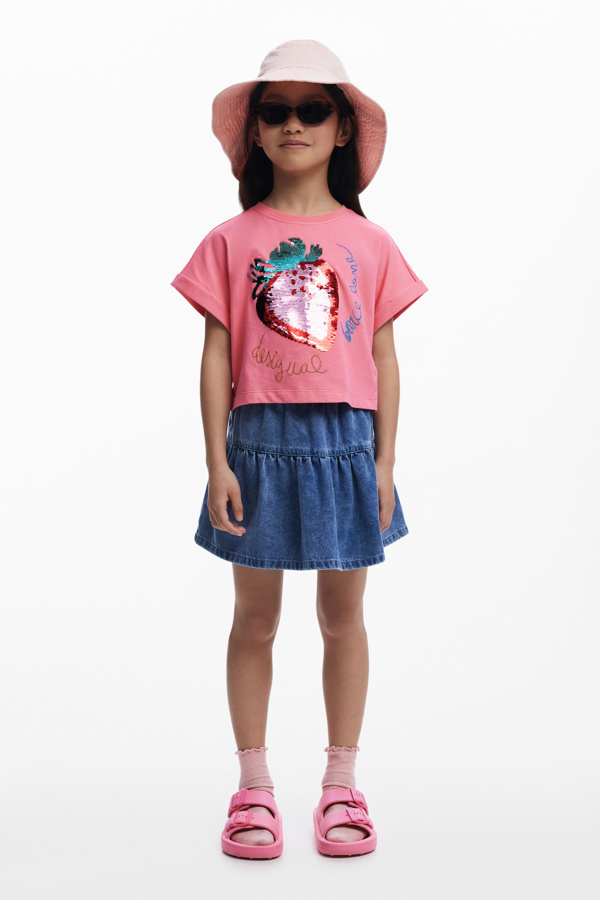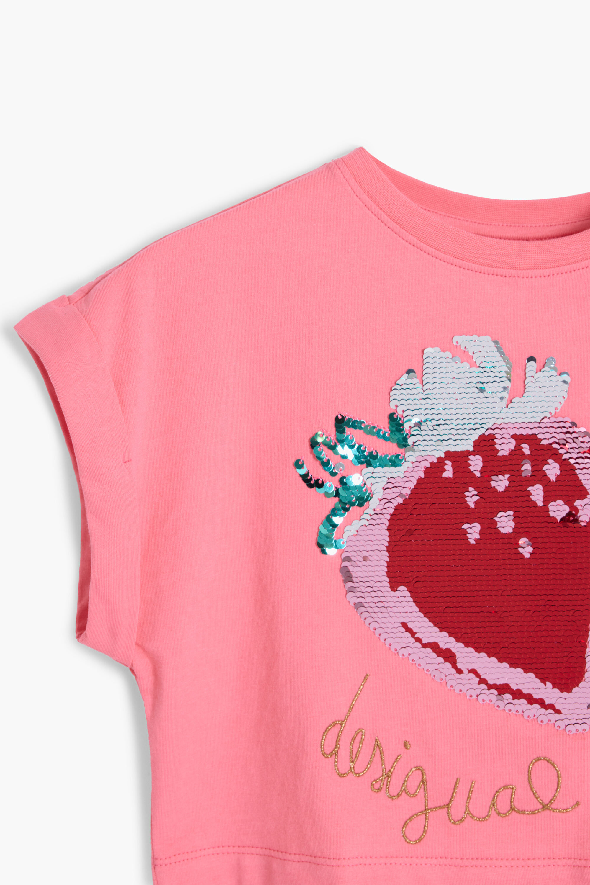 Maglietta a maniche corte con dettaglio risvoltato, corta, scollo rotondo in colore tinta unita con fragola in applicazioni di paillettes e dettaglio di logo ricamato.Vestibilità: CropCollo: rotondoManica: cortaDettagli ricamatiApplicazioni di paillettesCollezione AW25Progettato a BarcellonaAcquistando prodotti in cotone di Desigual, stai sostenendo il nostro investimento in Better Cotton.