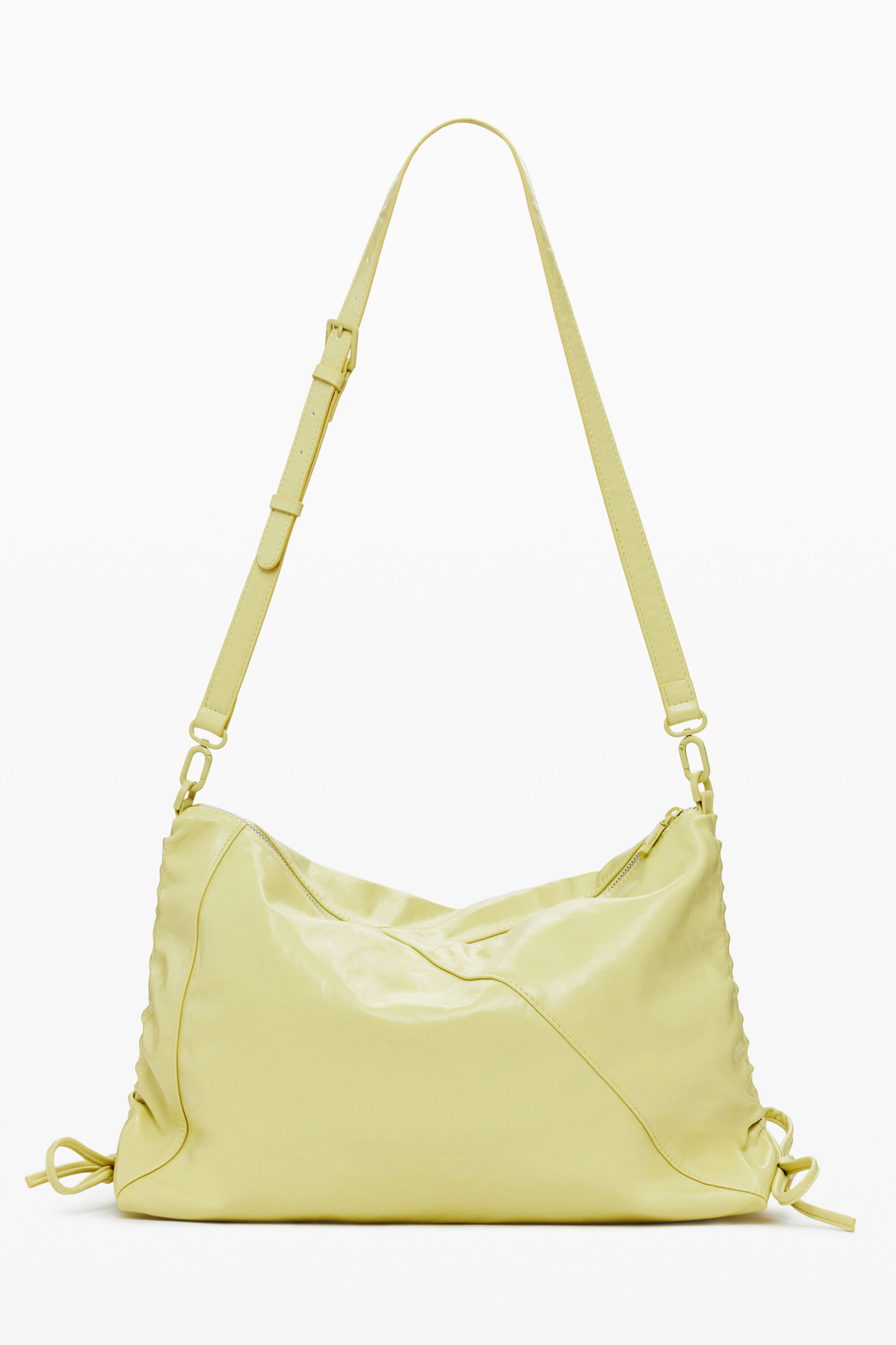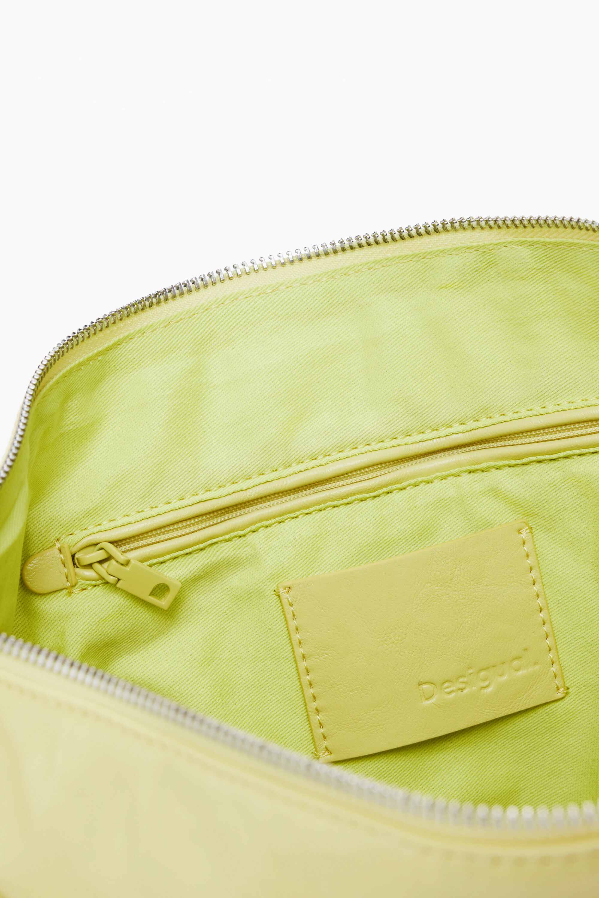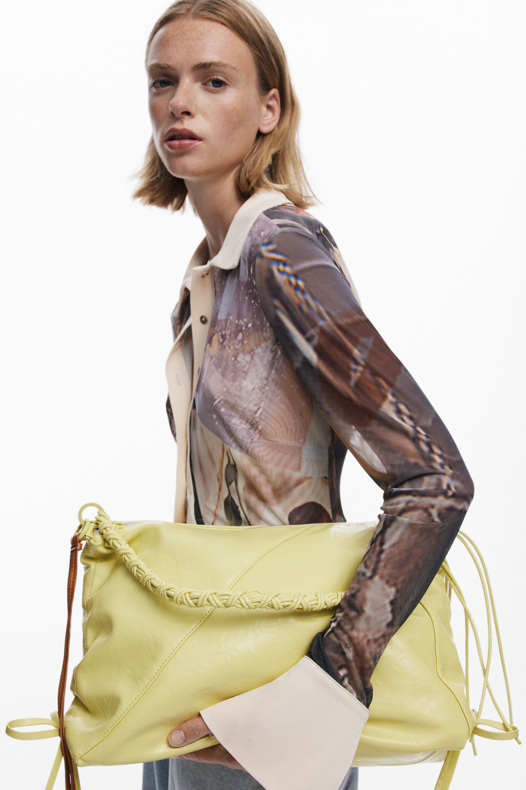 Borsa media a tinta unita con arricciature laterali, lacci effetto pelle e tracolle intercambiabili.Colore: Tinta unitaChiusura: con lacciCinturino corto: 55x2 cmCintura lunga: 90x4 cmArricciato con lacci lateraliScomparti interniProgettato a BarcellonaMisure: 39,60x12,60x34 cmPU riciclato