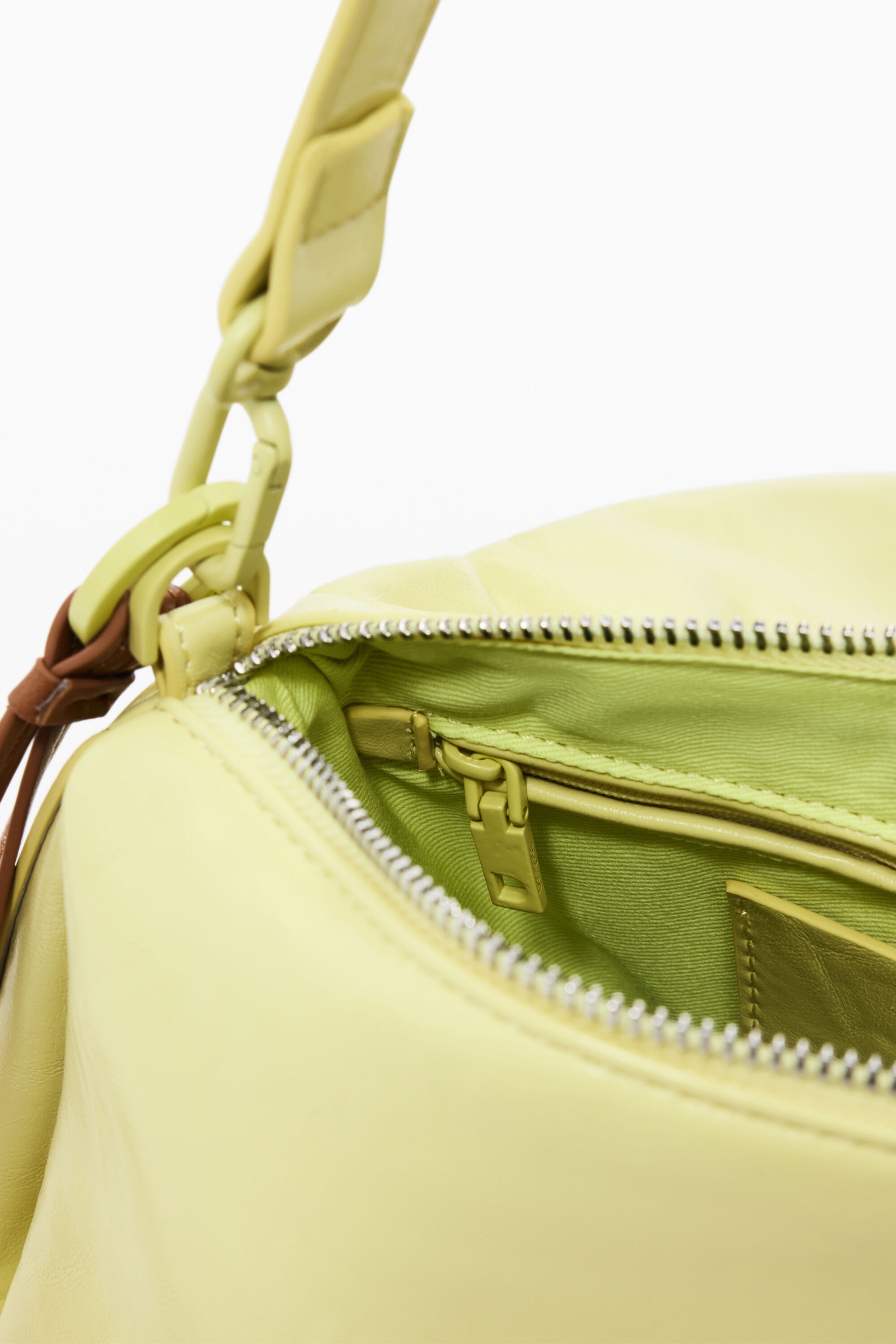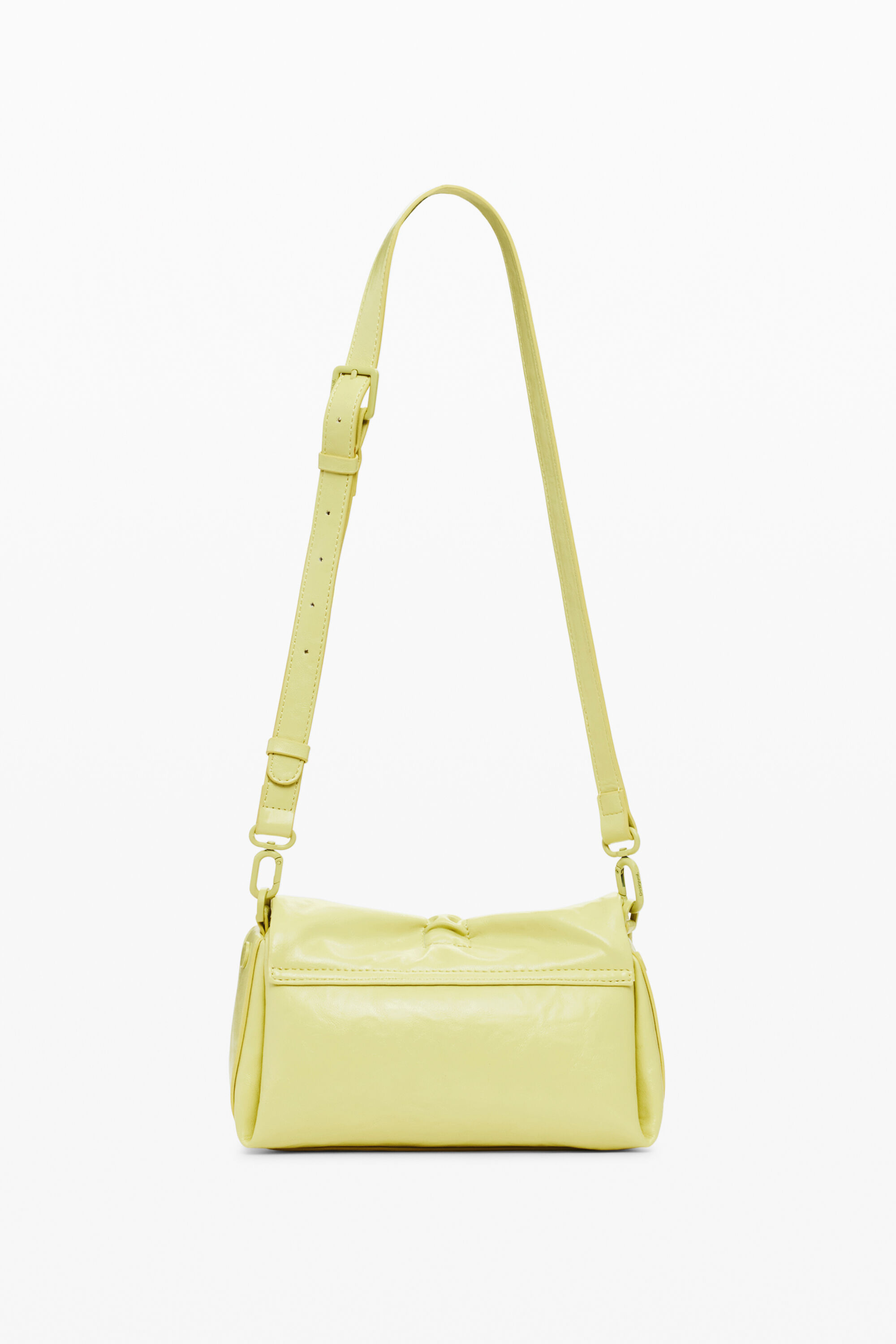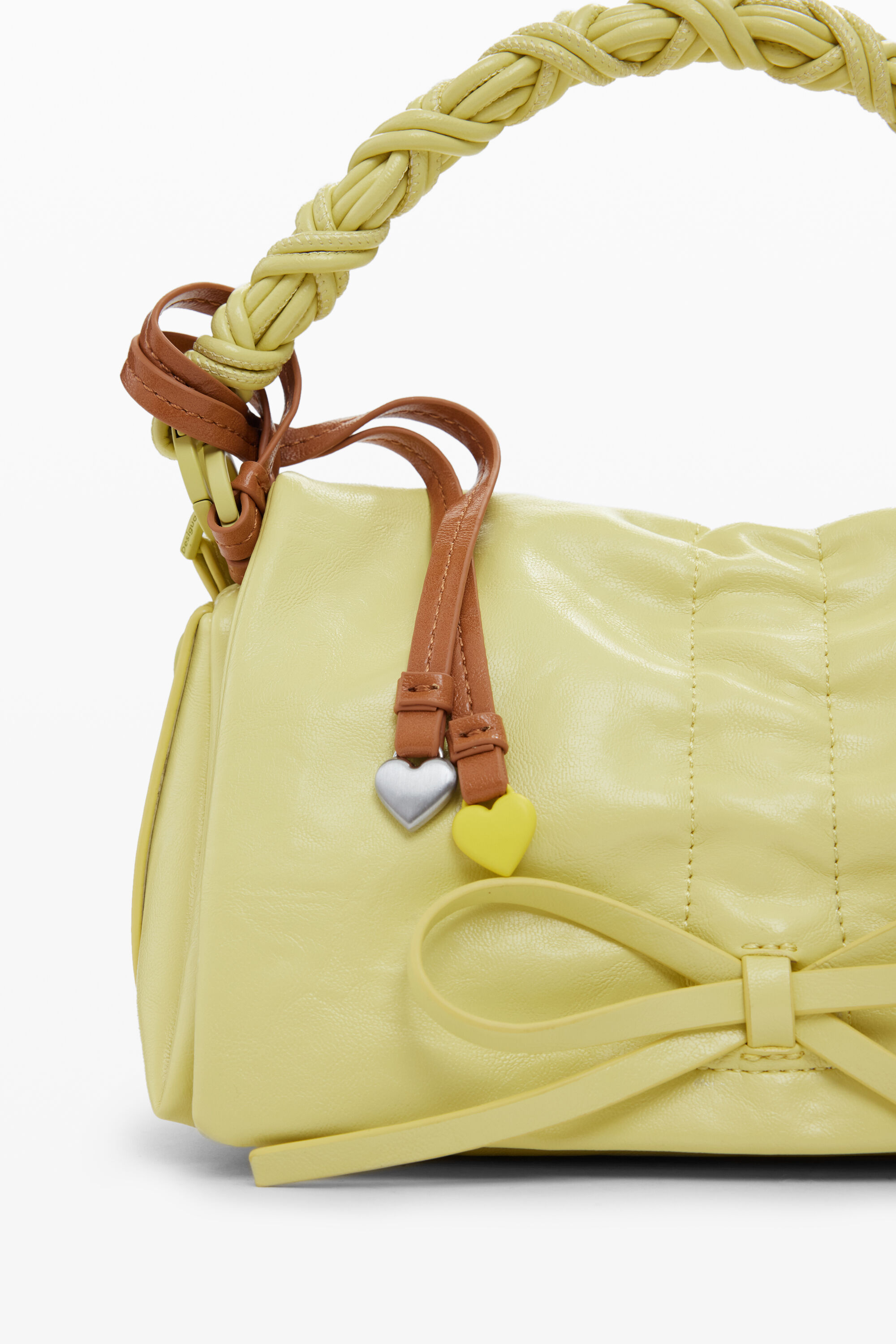 Piccola borsa a tracolla effetto pelle, con finitura lucida, dettaglio fiocco, manici intercambiabili e portachiavi rimovibile.Colore: Tinta unitaChiusura: con cerniera e pattaTasca internaManico corto con finitura arricciata (Lunghezza: 66 cm)Portachiavi estraibileEffetto pelleFinitura lucidaProgettato a BarcellonaMisure: 23,50 x 10 x 10,70 cm