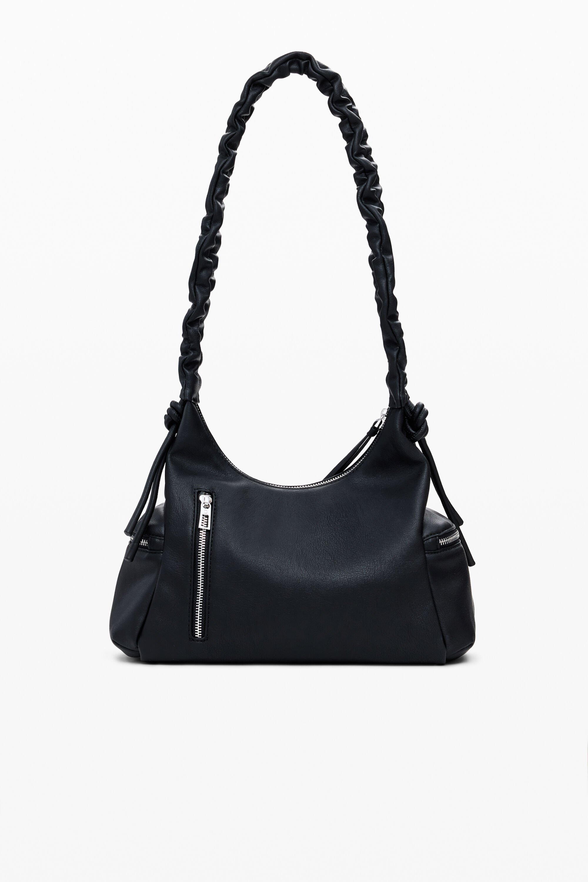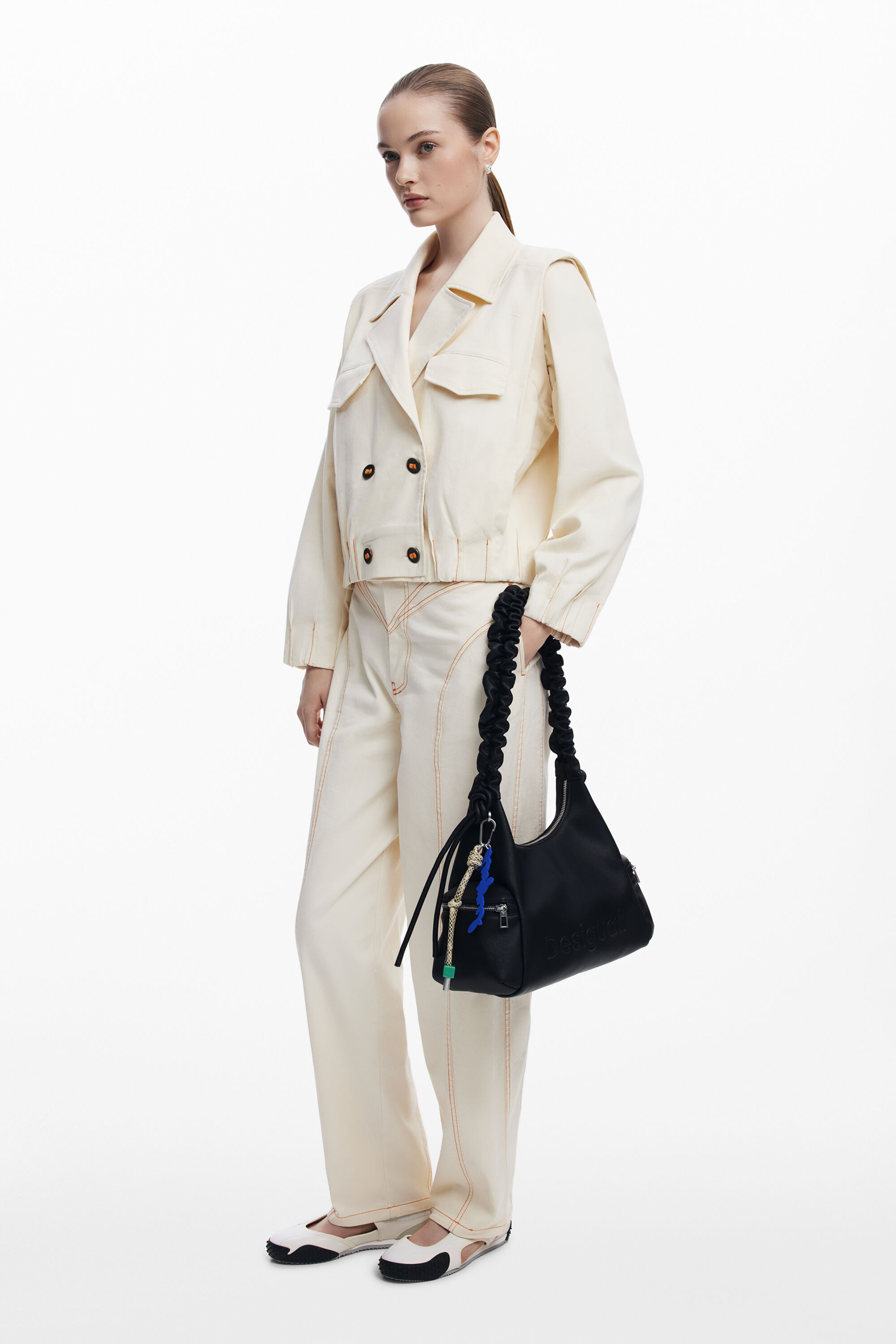 Borsa a mano di medie dimensioni, in tessuto effetto pelle a tinta unita, logo effetto 3D, manico regolabile con arricciatura e dettaglio di portachiavi rimovibileColore: Tinta unitaTasche lateraliTasca interna con cernieraChiusura: con cernieraManico arricciato regolabileLogo effetto 3DPortachiavi rimovibileEffetto pelleProgettato a BarcellonaMisure: 29,50 x 14 x 19 cm