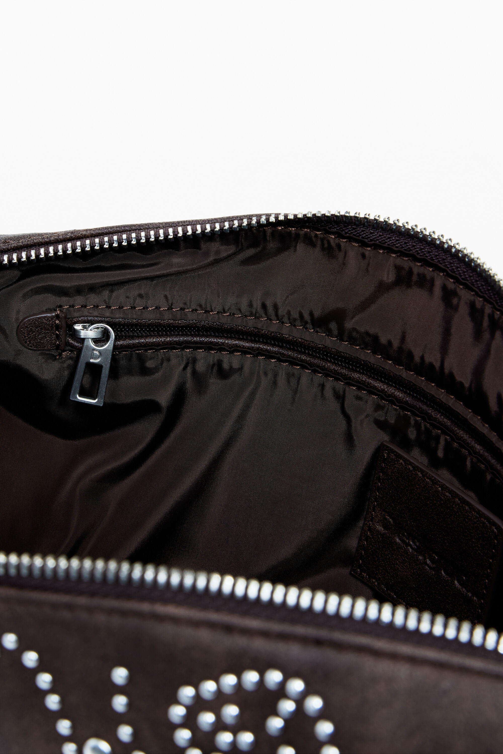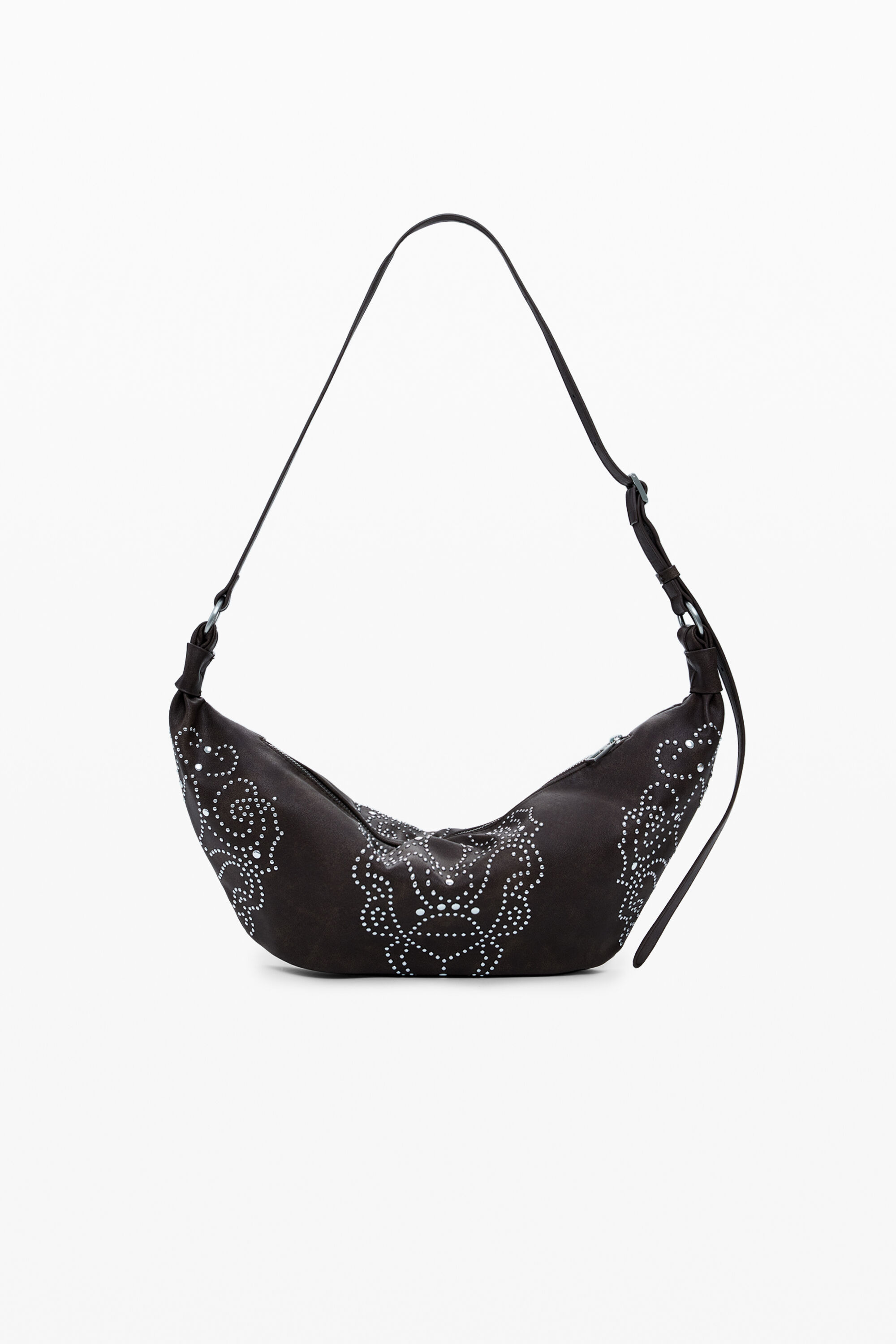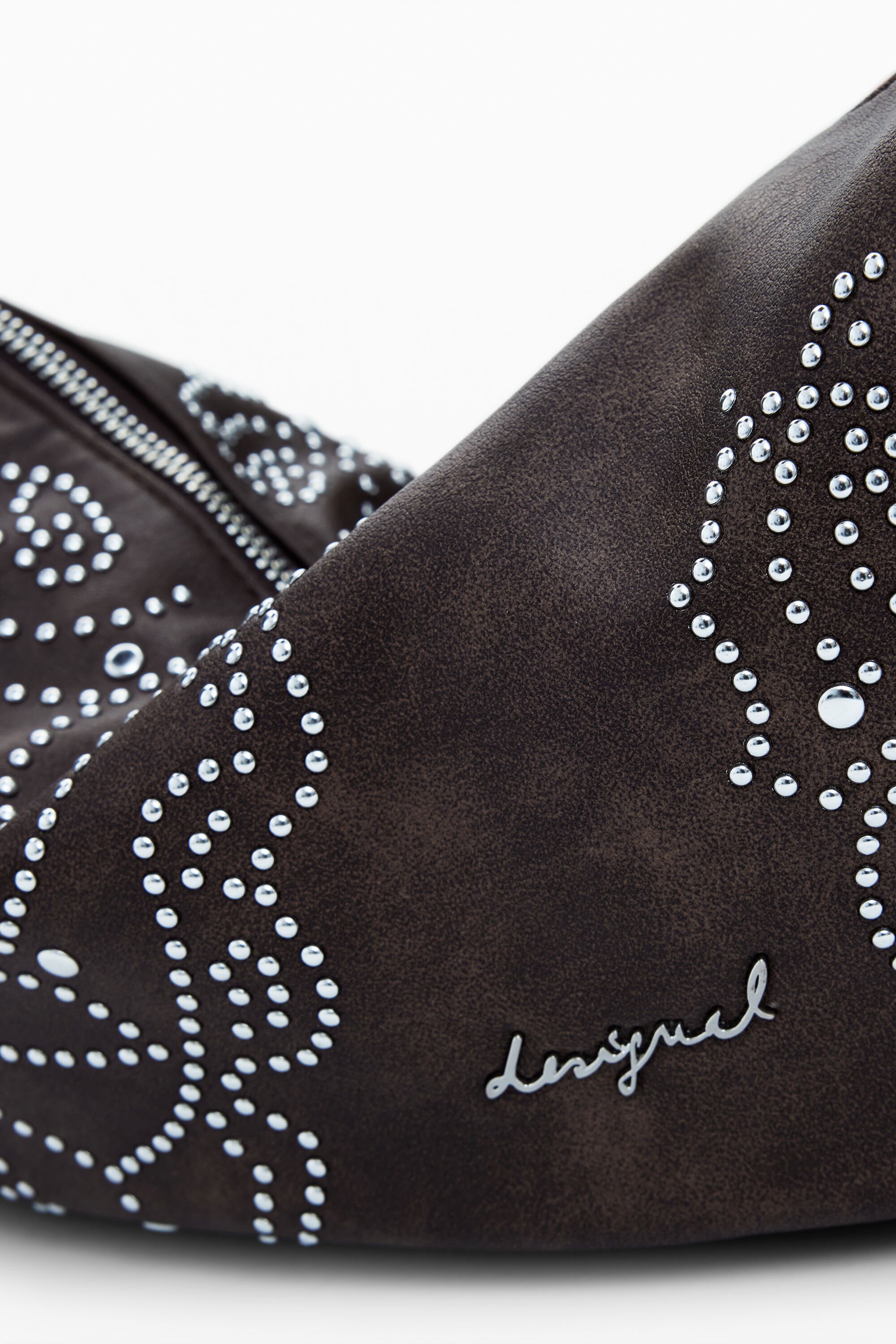Borsa a mano a forma di banana, in tessuto effetto pelle, con dettaglio di borchie metalliche, chiusura con cerniera e manico regolabile.Tasca interna con cernieraChiusura: con cernieraManico regolabileDettaglio del logo in applicazione metallicaDettaglio di borchie metallicheEffetto pelleProgettato a BarcellonaMisure: 9 x 17,90 x 33 cm