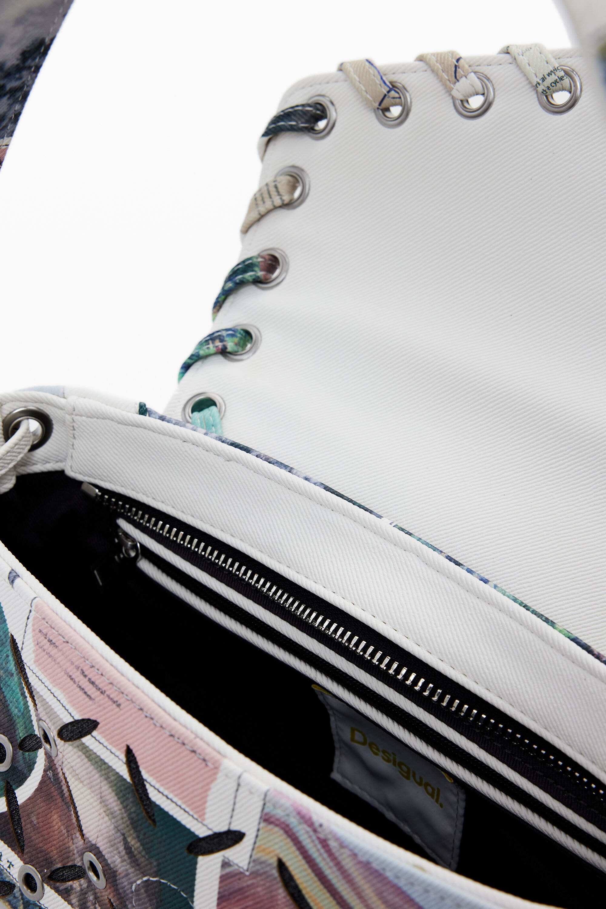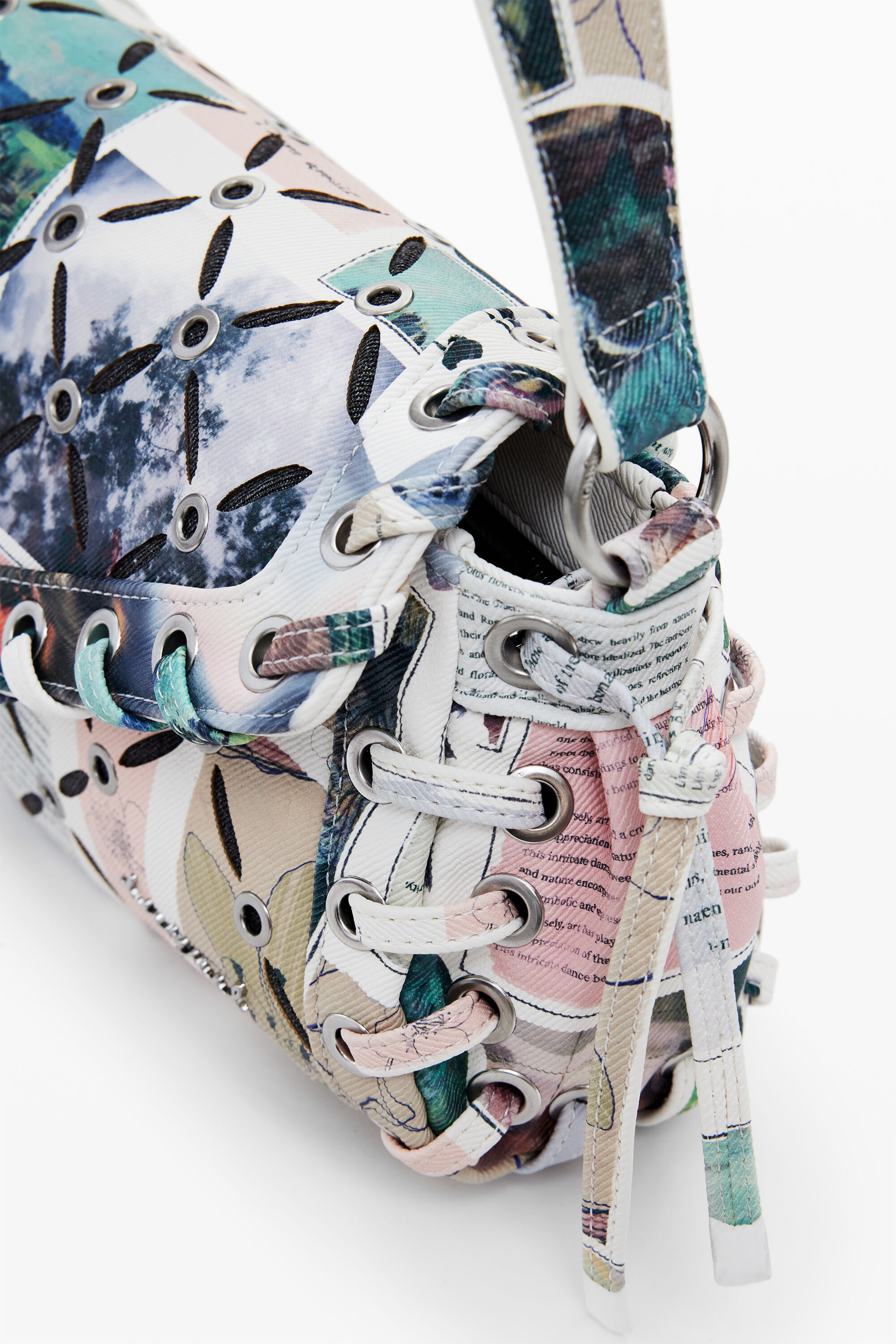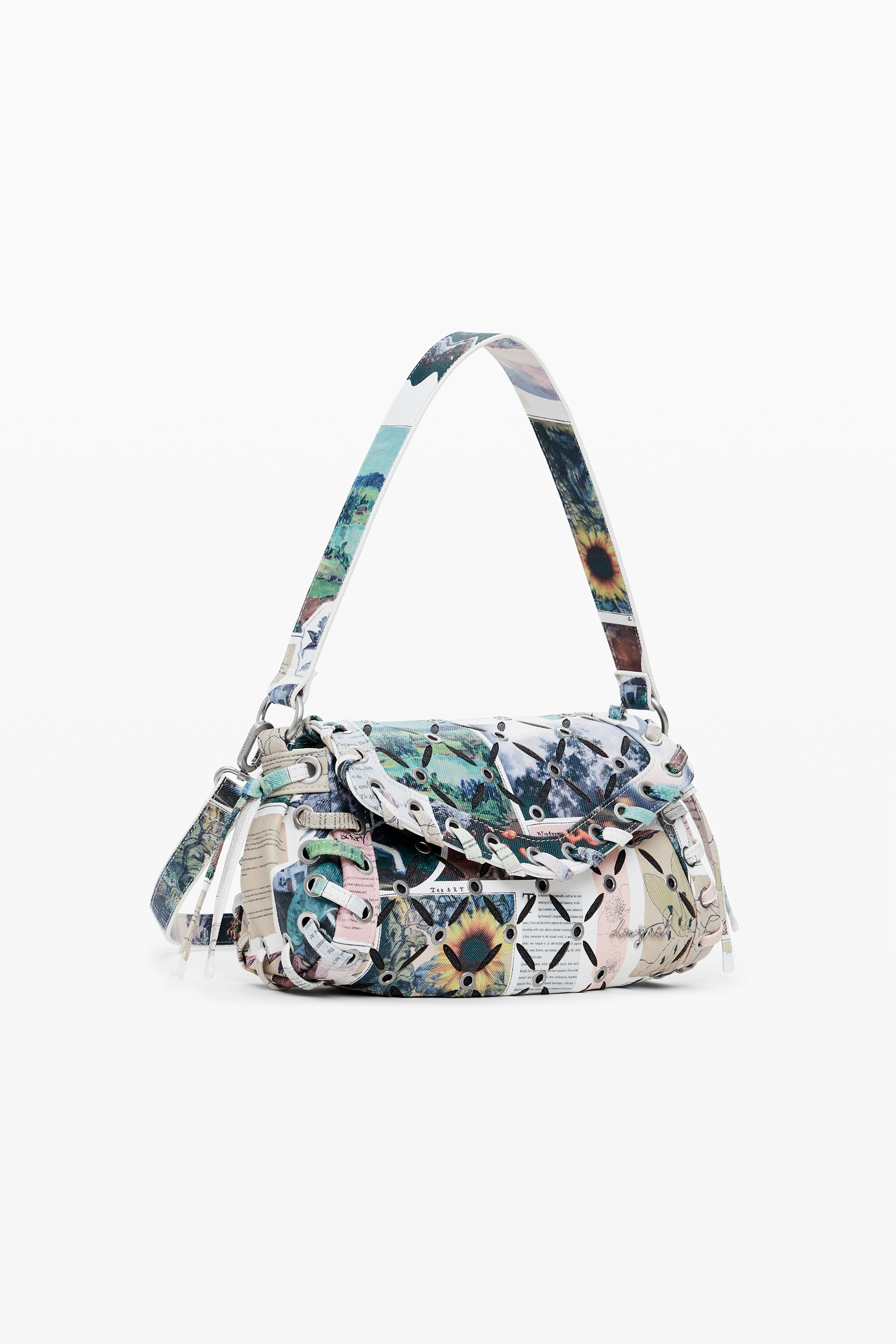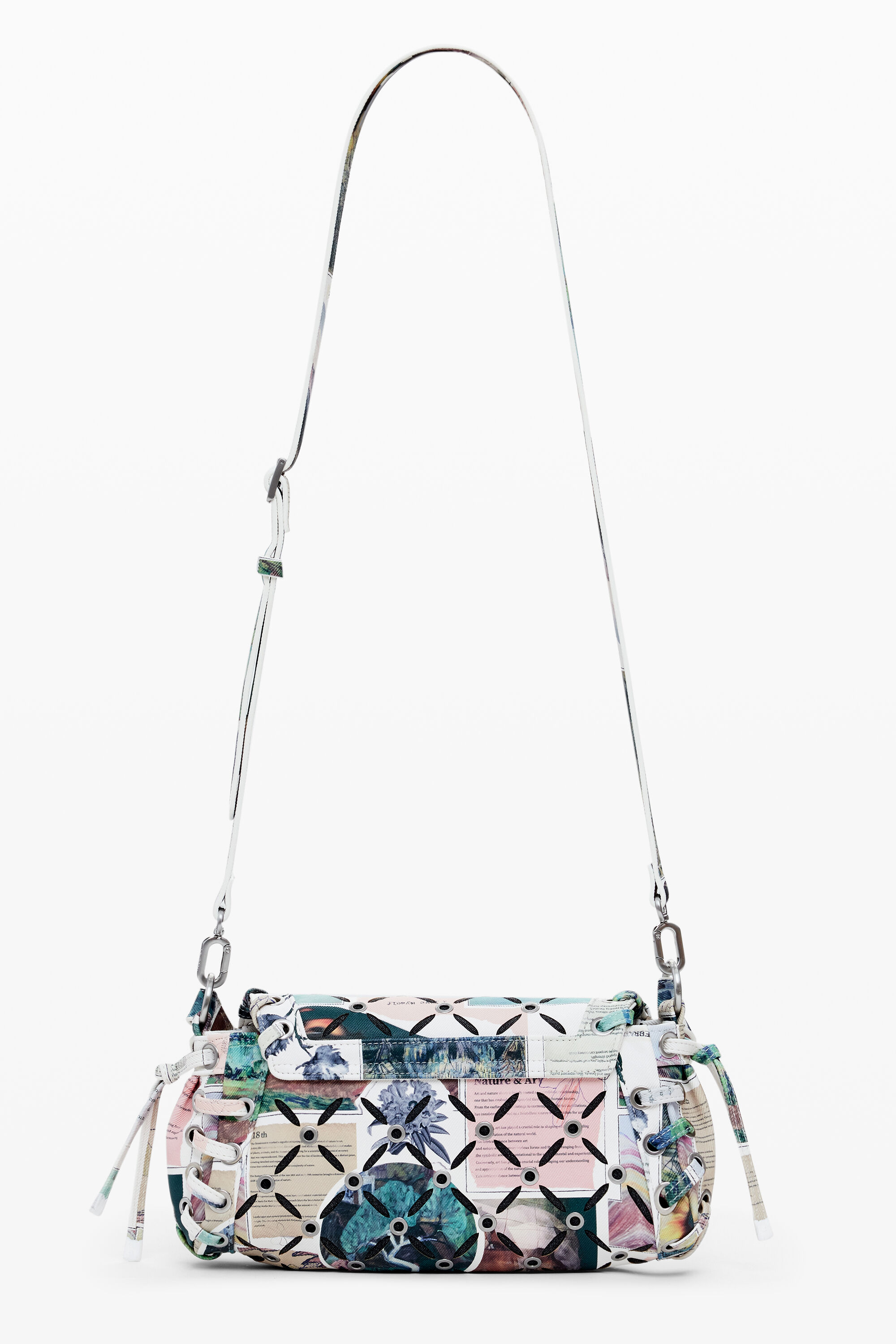Borsa piccola, con patta magnetica, manici intercambiabili e stampa stile giornale con frammenti di testi e immagini.Colore: MulticoloreChiusura: con magnete e cernieraTasca interna con cernieraManici intercambiabili: 50x4/119x2cmDettagli di finitura con occhielli e cordoncino sulla patta e sui latiApplicazioni metallicheCollezione AW25Progettato a BarcellonaMisure: 28x10,5x12 cmPoliestere riciclato