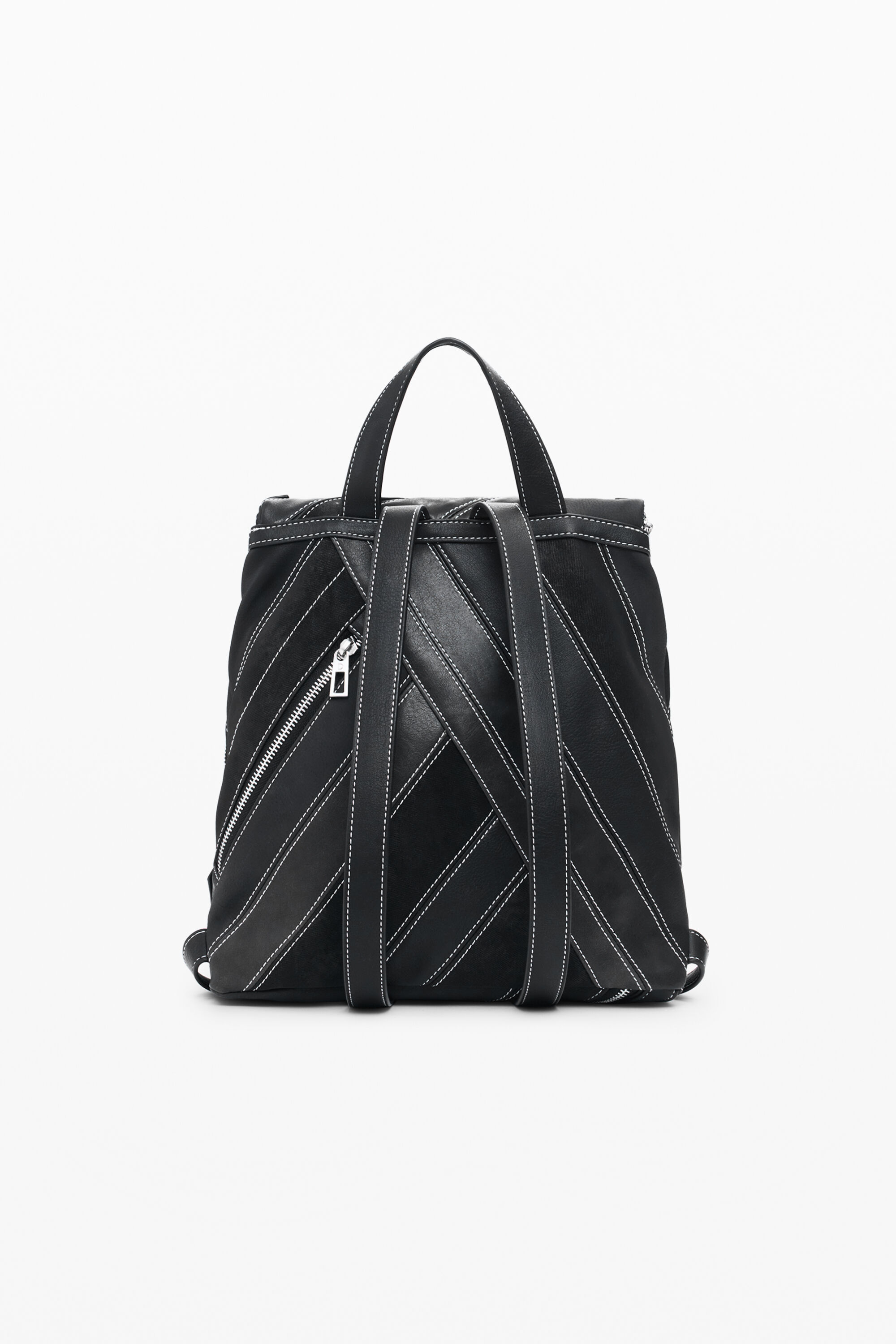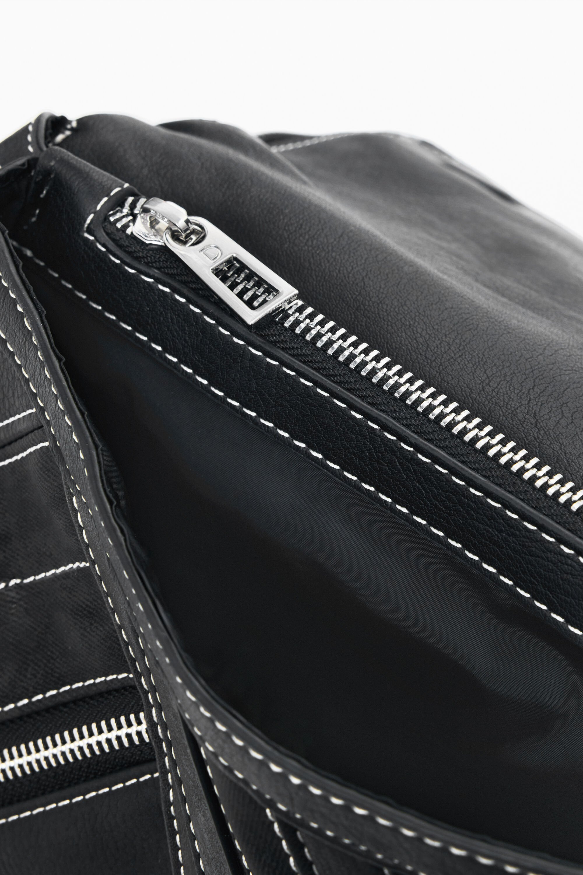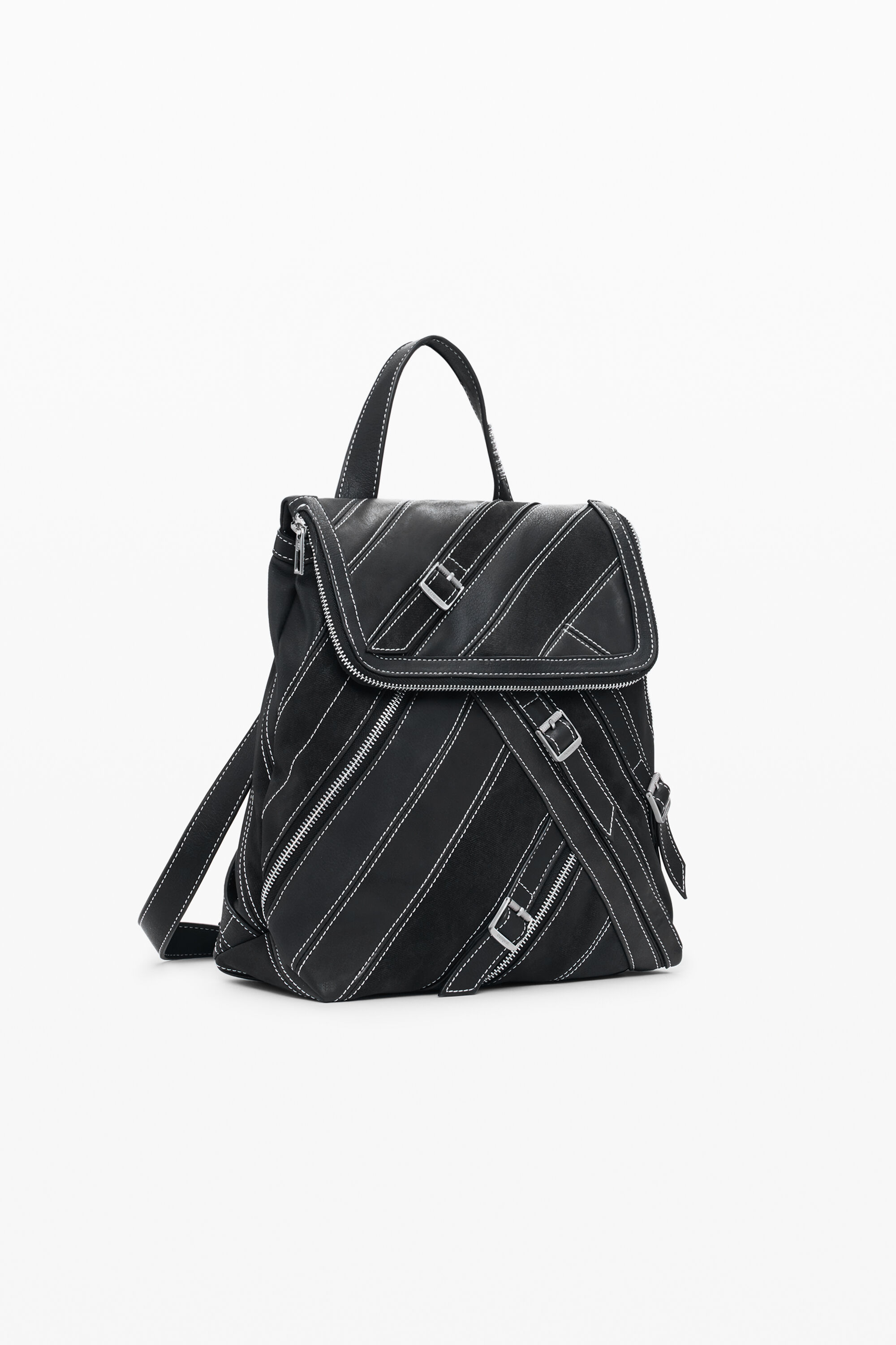 Zaino piccolo in effetto pelle con patta e dettagli di cerniere, impunture e fibbie.Chiusura: patta, magnete e cernieraVari scomparti interniImpunture a contrastoDettaglio di fibbie decorativeEffetto pelleProgettato a BarcellonaMisure: 27,20 x 11,70 x 28 cm