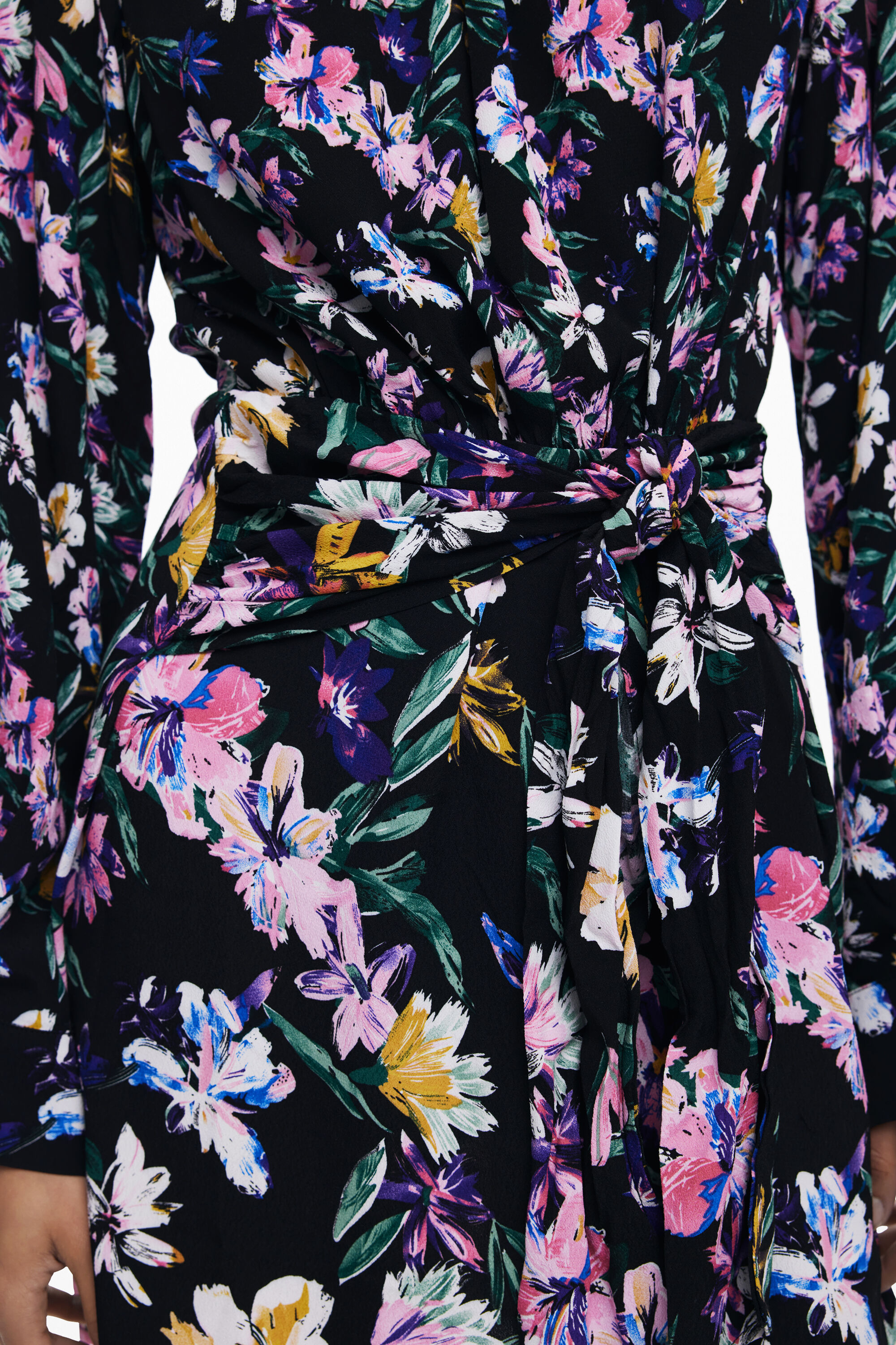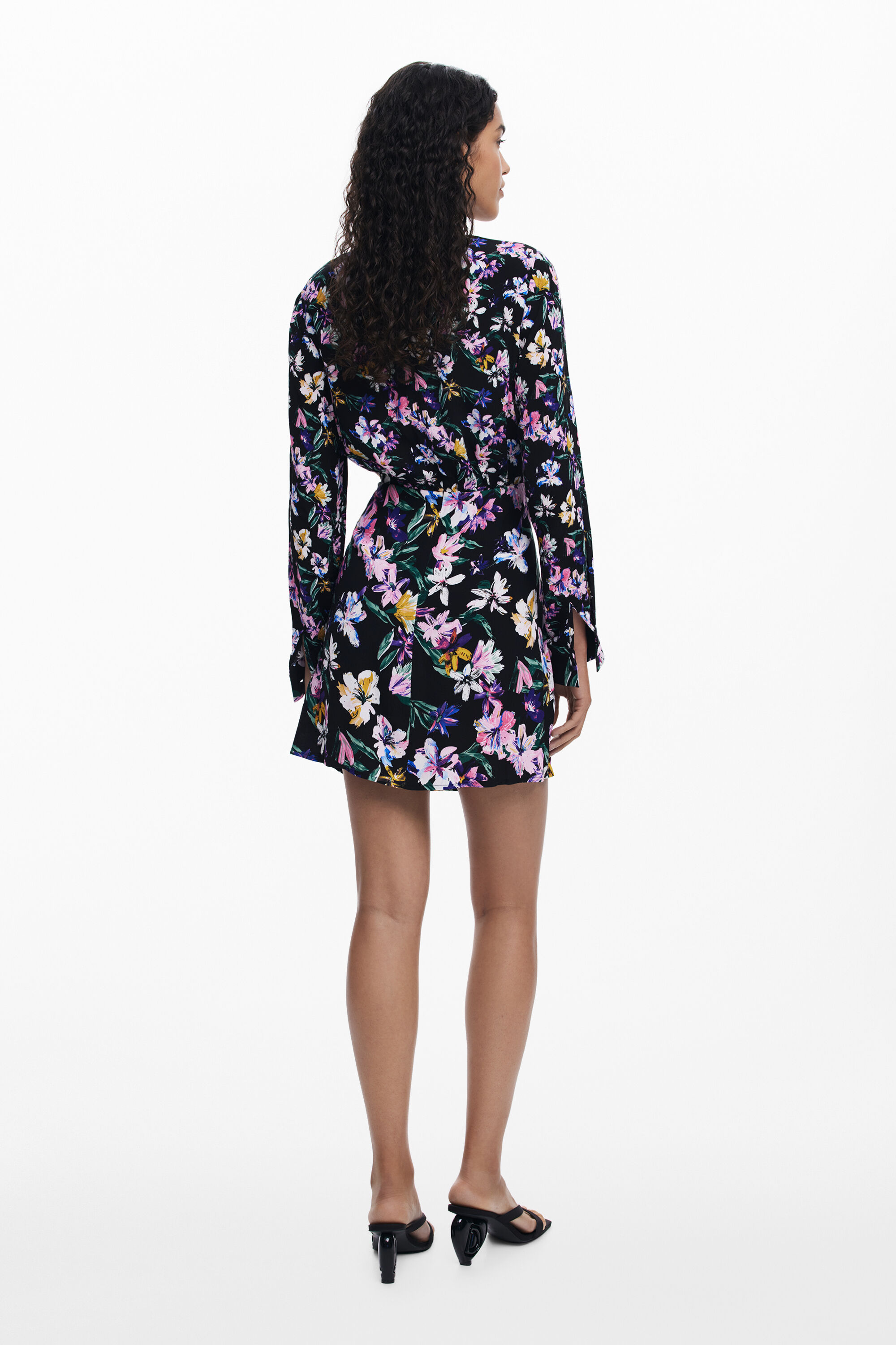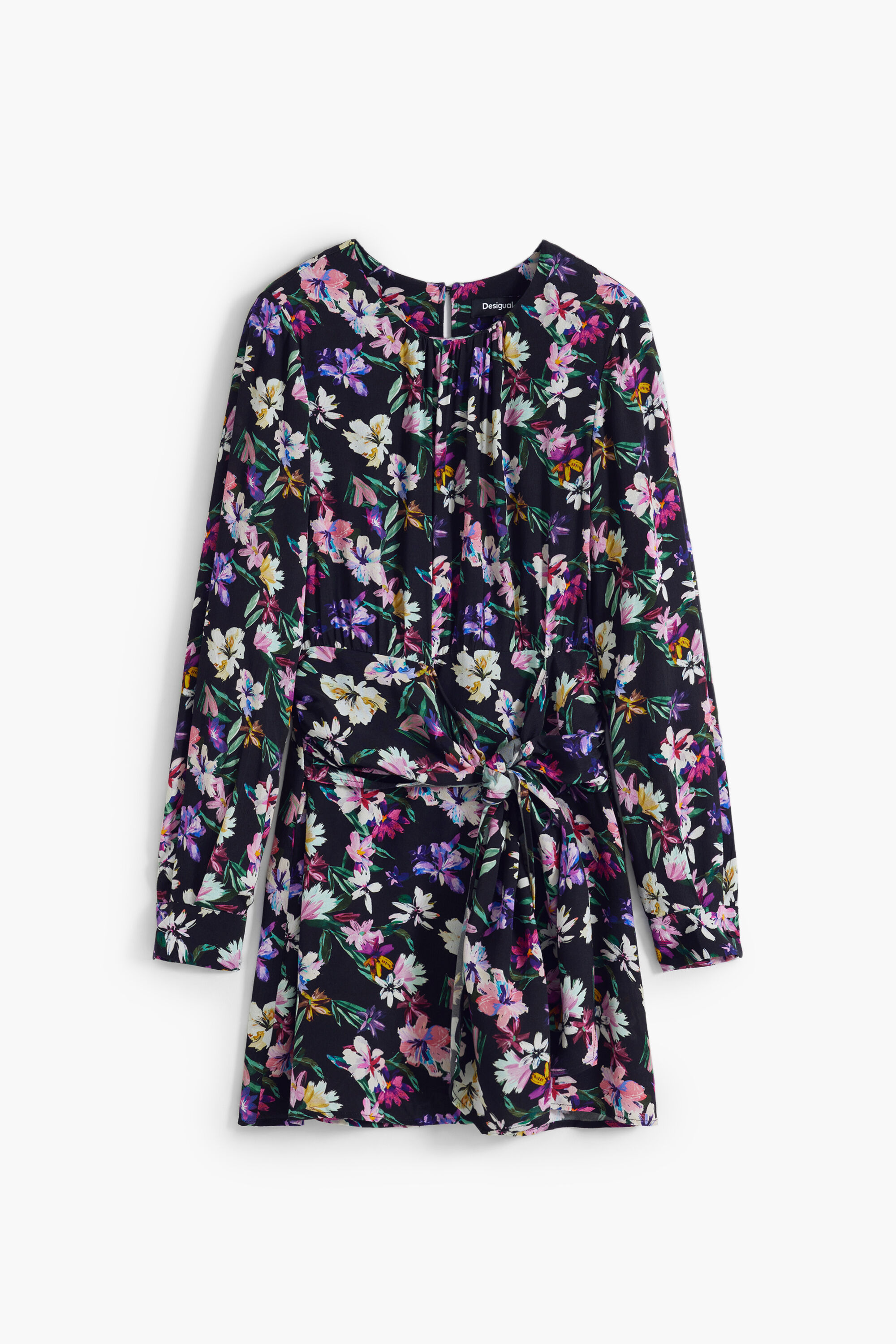 Abito corto a maniche lunghe, collo rotondo, dettaglio annodato in vita e stampa floreale.Stampa florealeFit: RegularCollo: rotondoManica: LungaLunghezza: CortoChiusura: con cerniera e bottoneDettaglio di nodo in vitaRealizzato con materiali sostenibiliCollezione AW25Progettato a BarcellonaViscosa Lenzing™ EcoVero™