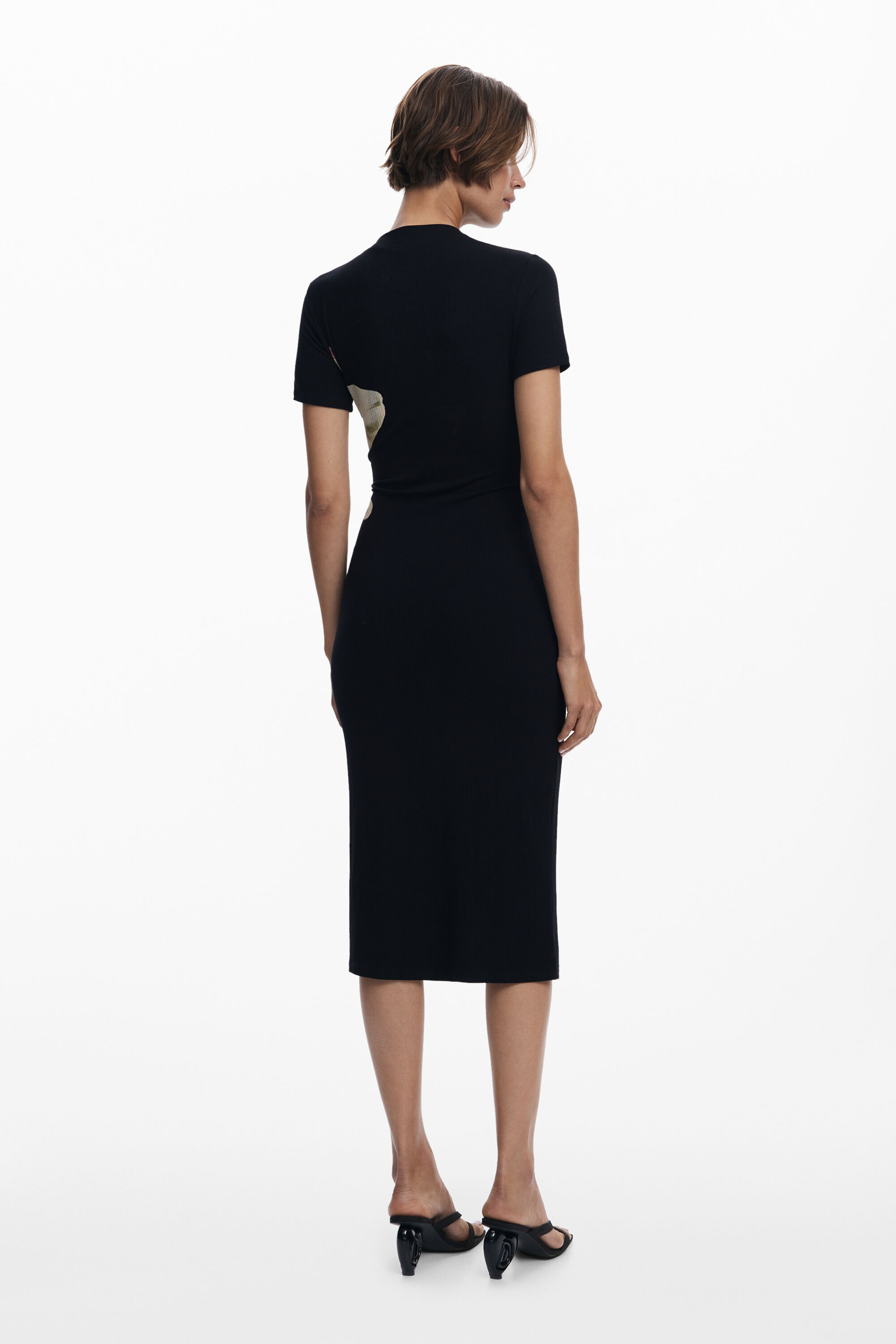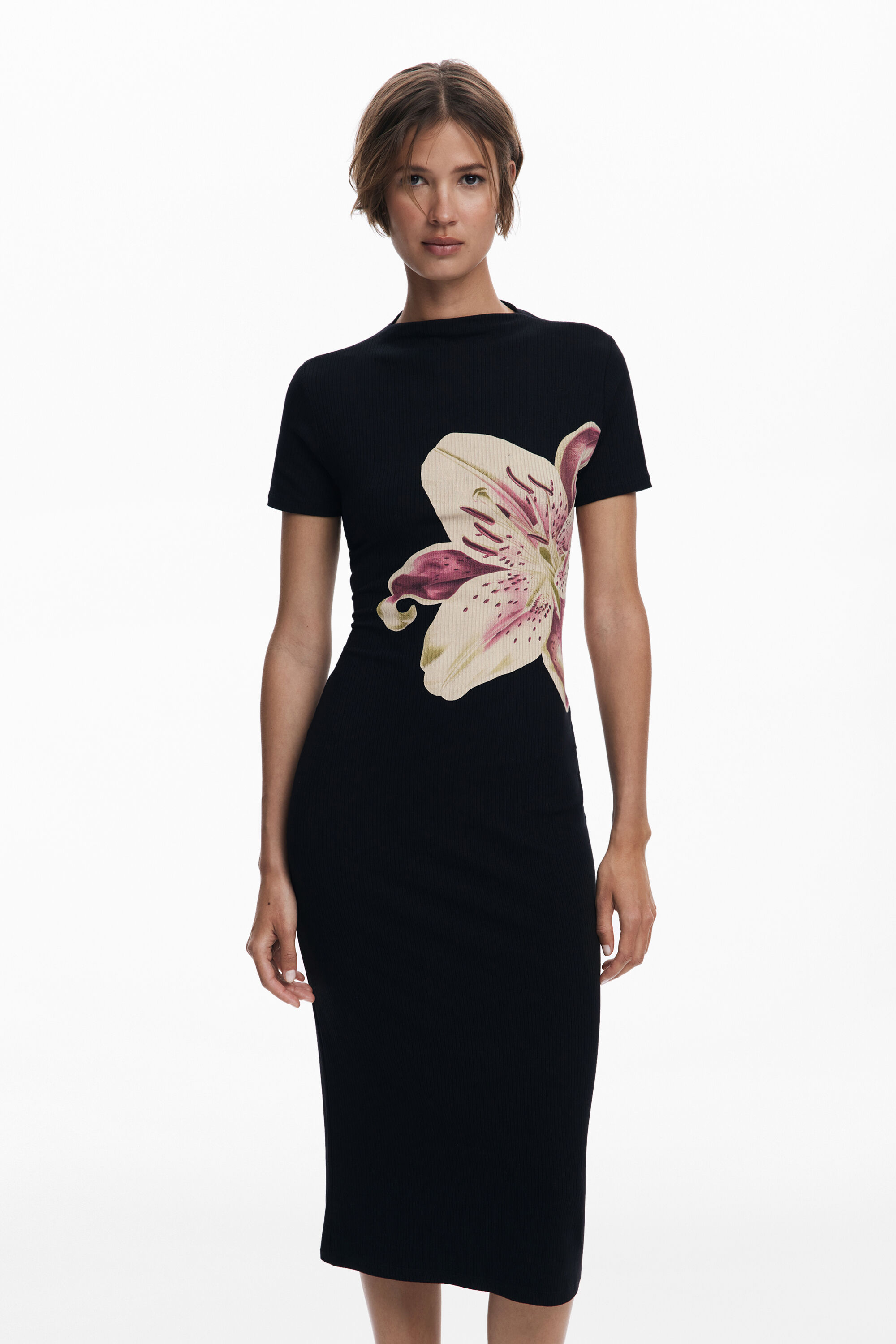Long fitted dress in ribbed fabric, short sleeves, mock neck, and large orchid print on the front.Fit: SlimLength: LongNeckline: RoundSleeve: ShortWhen you buy cotton products from Desigual, you are supporting our investment in Better Cotton.