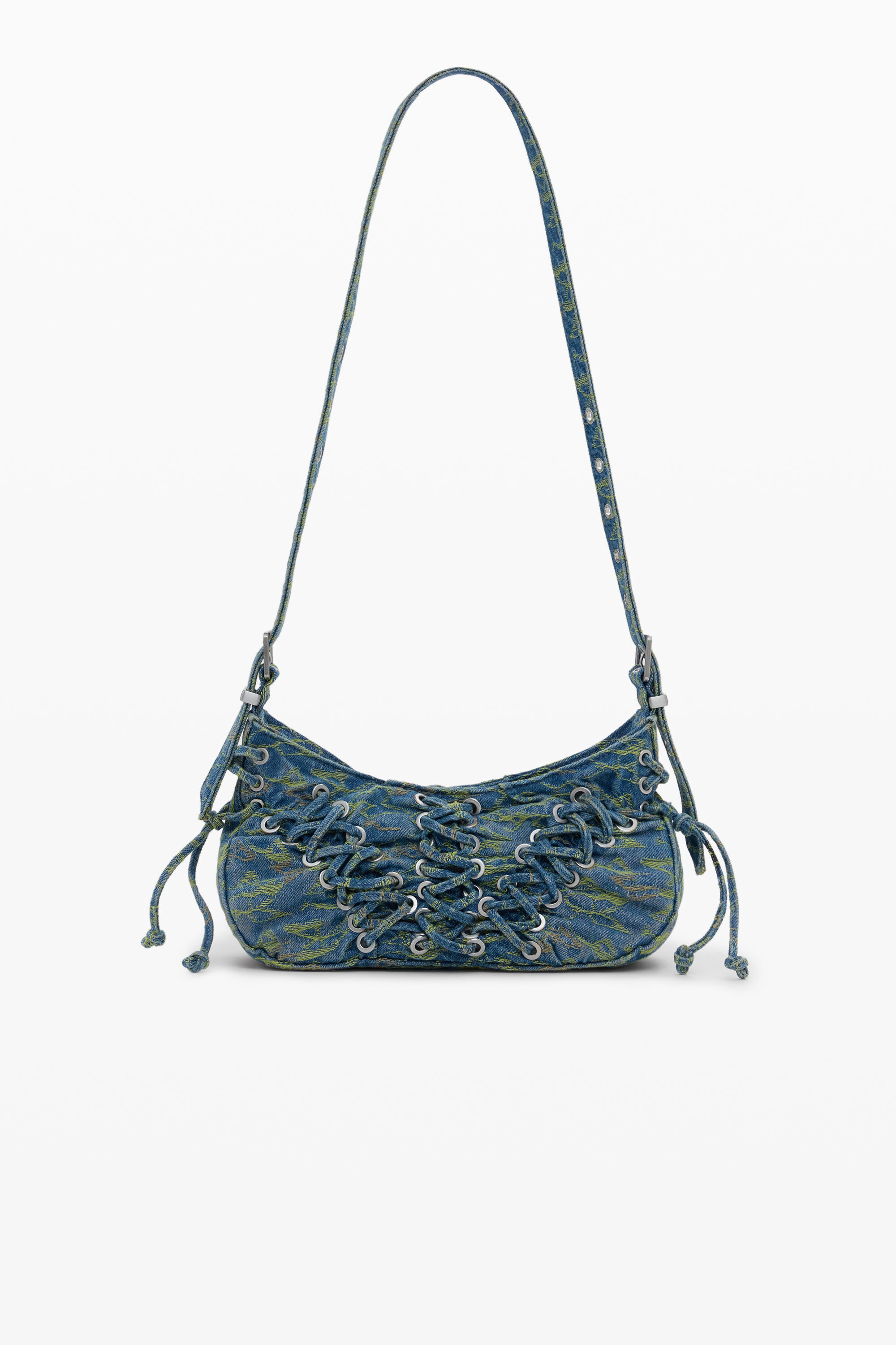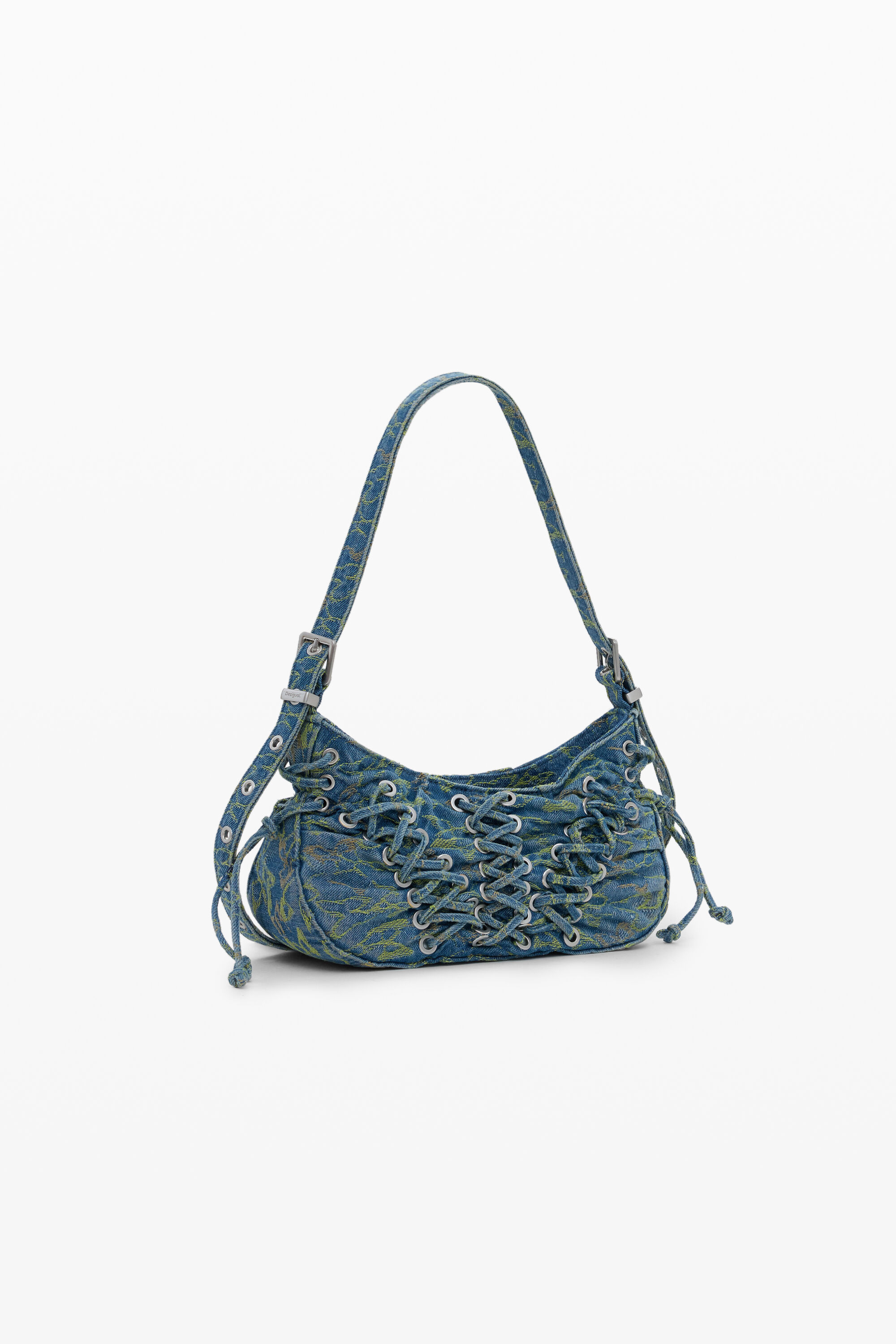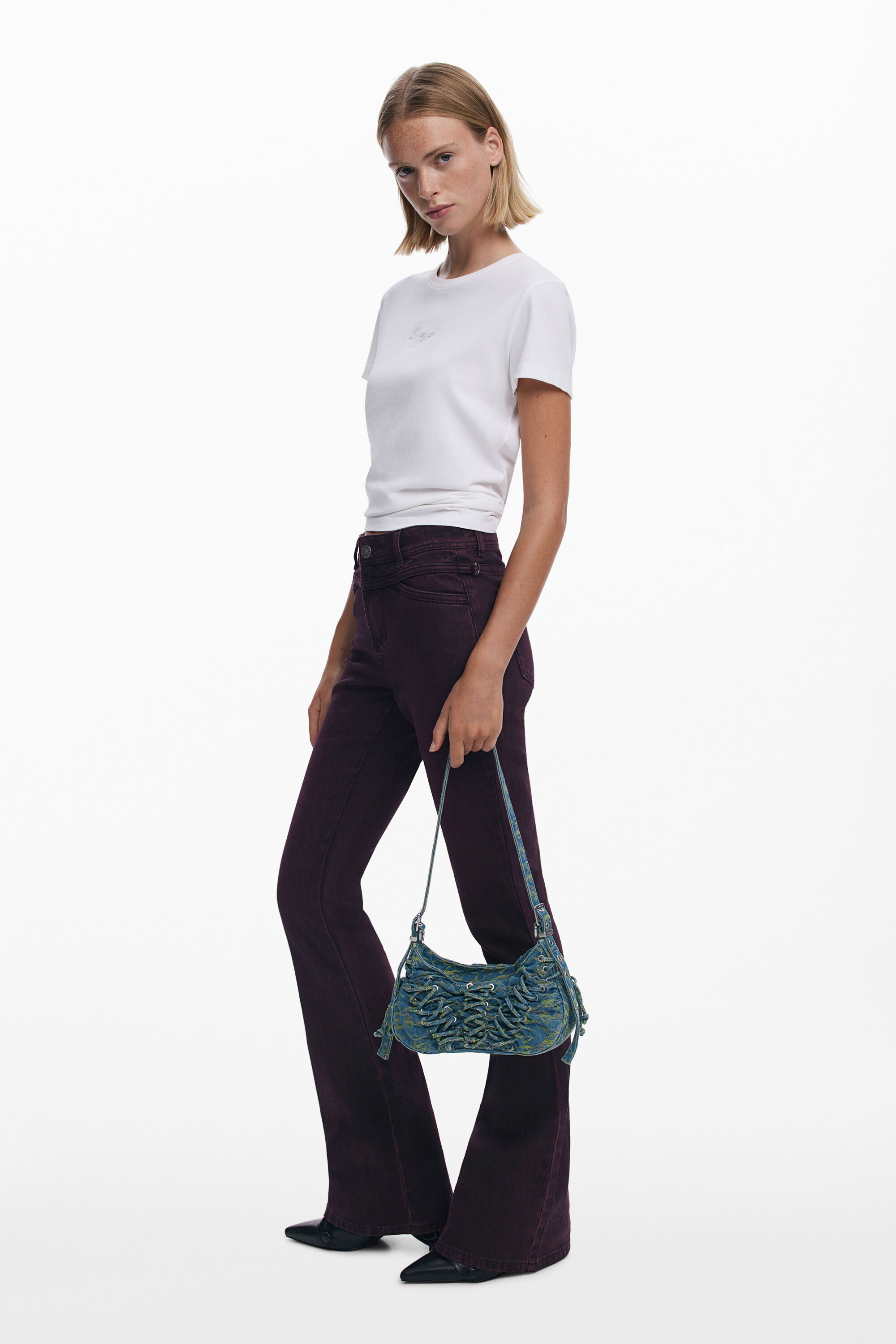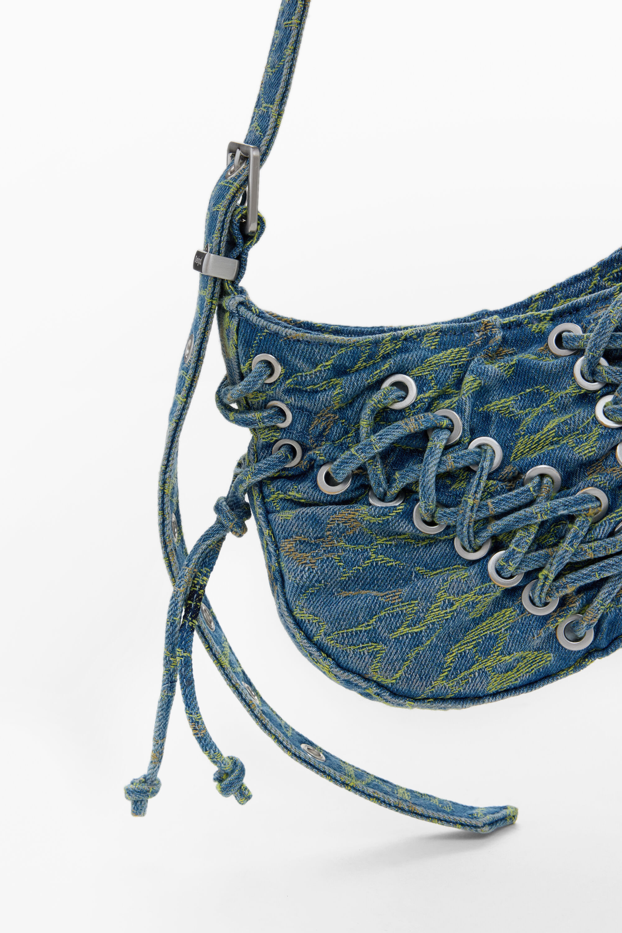 Medium denim fabric bag with abstract print, interchangeable straps, and lace-up details on the sides.Color: MulticolorZippered pocketsClosure: ZipperInterchangeable strapsPrinted denim fabricLoops with metal eyelets on the sidesRuched detailDesigned in BarcelonaMeasurements: 25x8x11.5 cmBCI COTTONWhen you buy cotton products from Desigual, you are supporting our investment in Better Cotton.