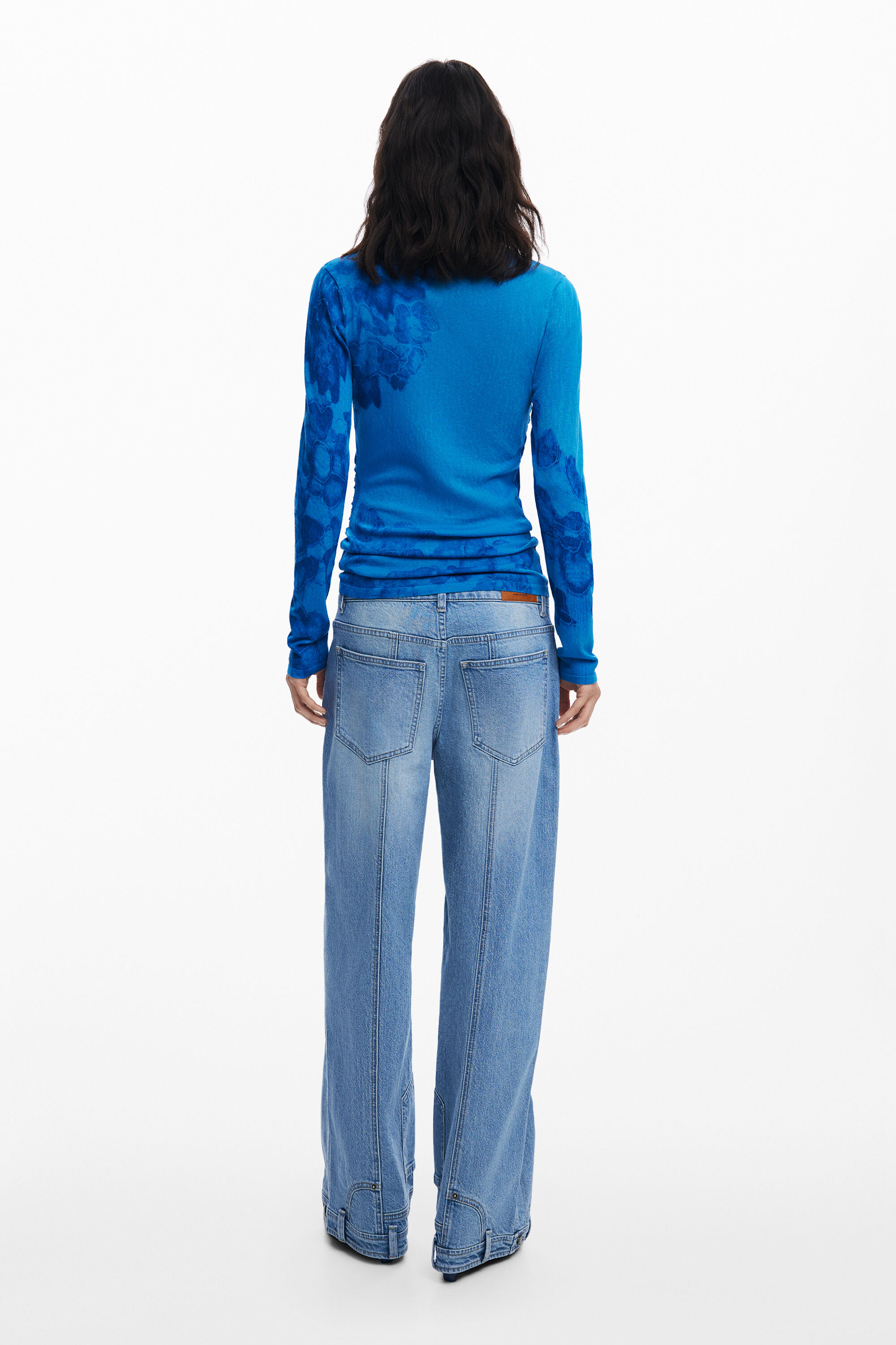 Lightweight long-sleeve sweater with a round neck, slightly long, in a solid color with watercolor floral print in the same tone.Color: