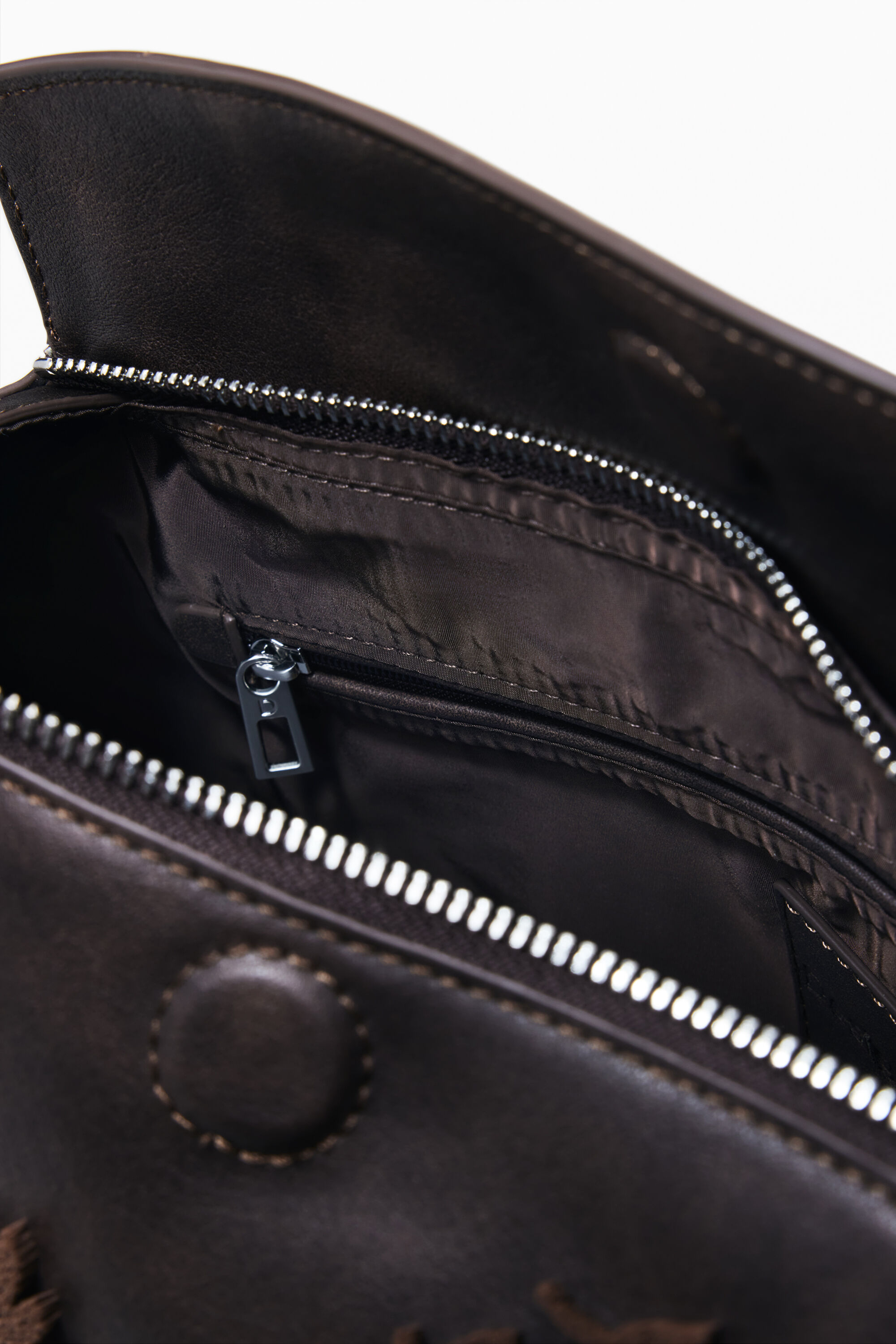 Large square-shaped backpack, in faux leather with flocked details and interchangeable handles convertible to a bag.Flocked detailsRear exterior pocketClosure: zipper and flapInterior pocket with zipperRemovable backpack strapsRemovable bag-style handleMeasurements: 33 x 1 1 27 cm