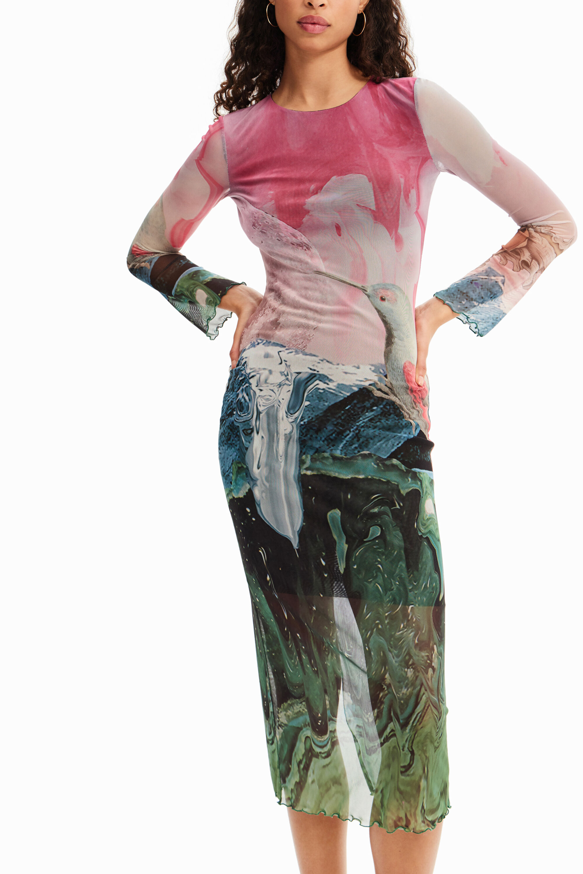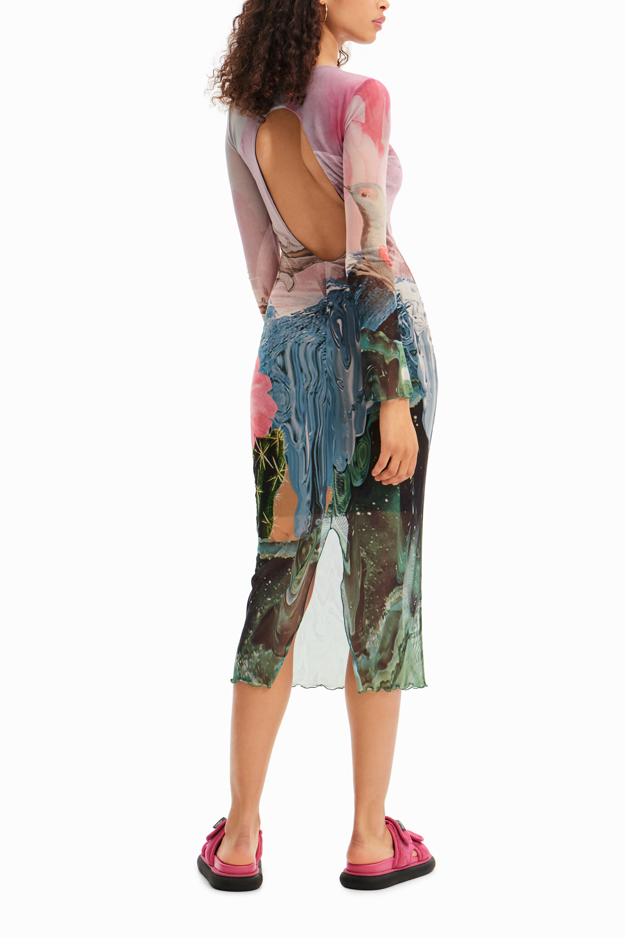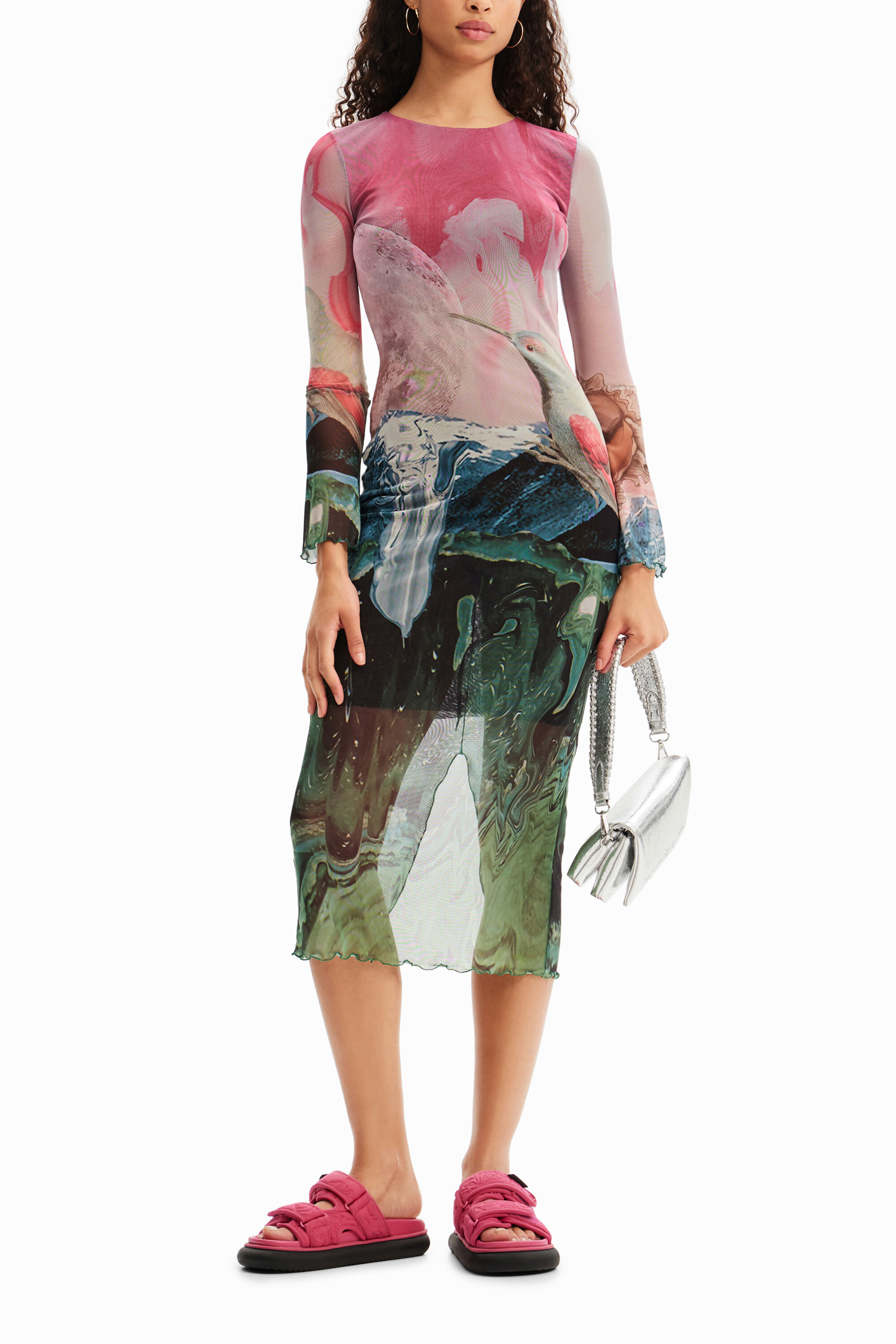 A fitted tulle midi dress with long sleeves and a wide cut-out on the back.Fit: SlimLength: MidiFantasy print with moon and hummingbirdRound neckShort sleevesBack slit on the hem and shorter liningSleeves and hem with contrasting wavy finishRecycled polyester