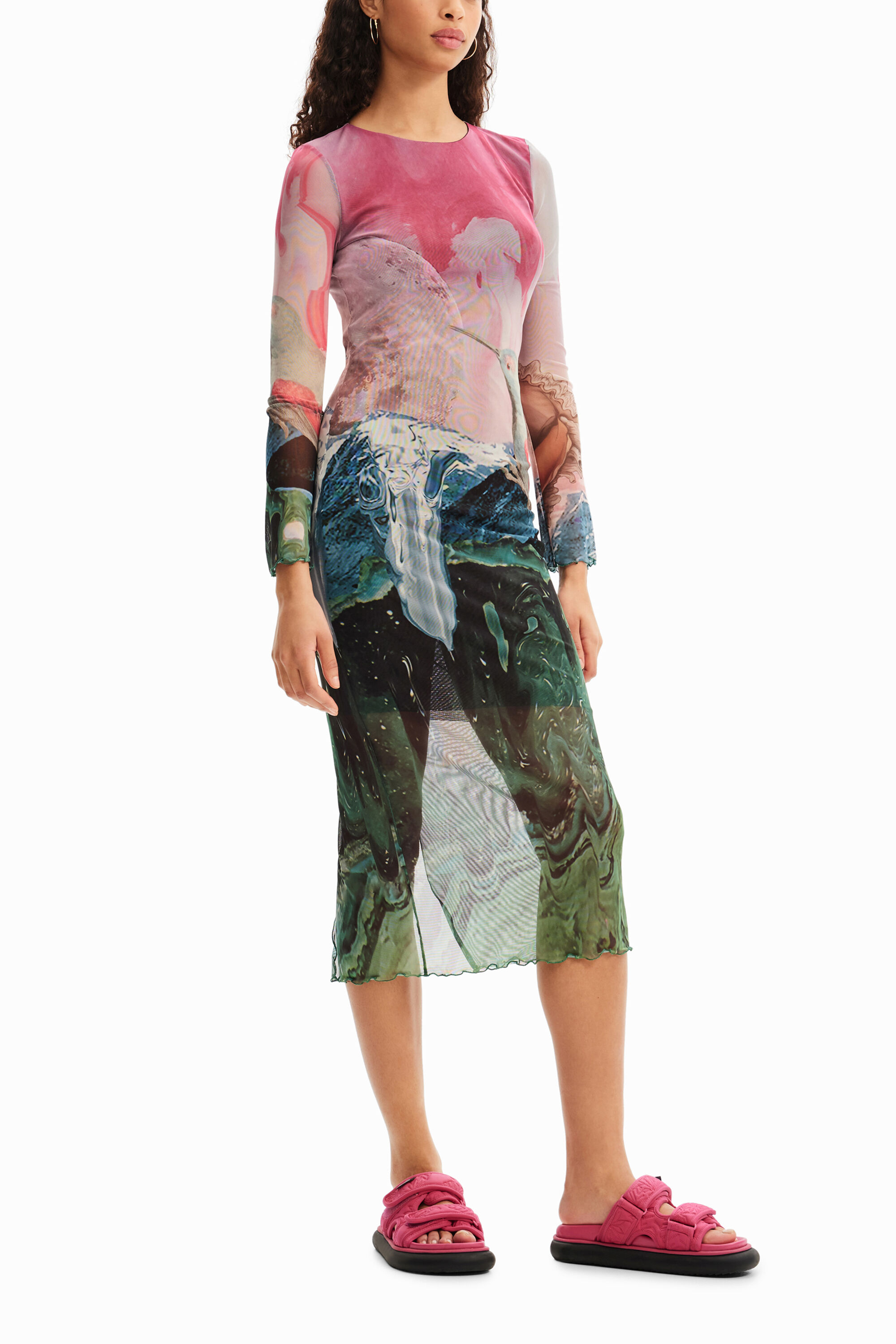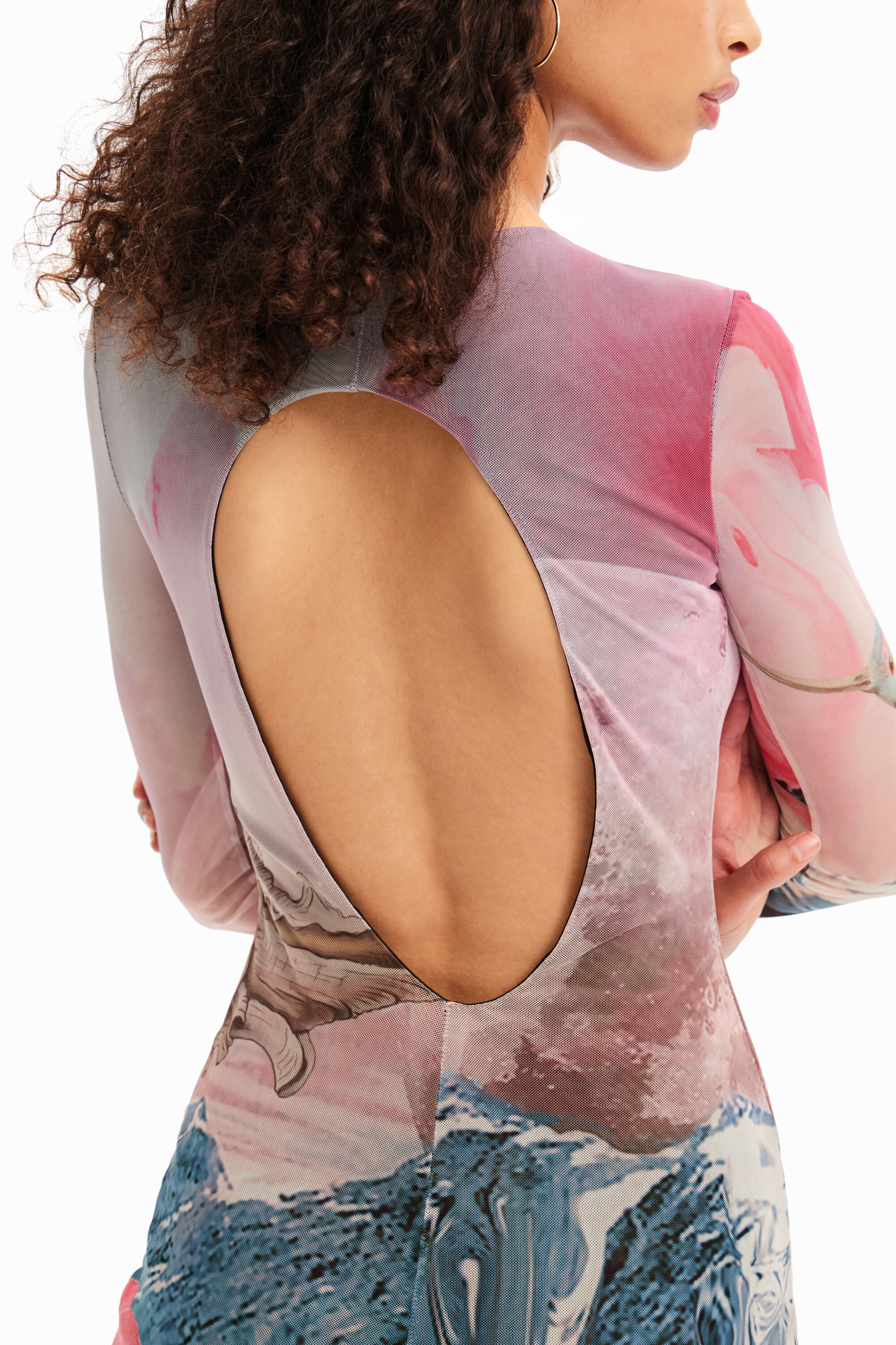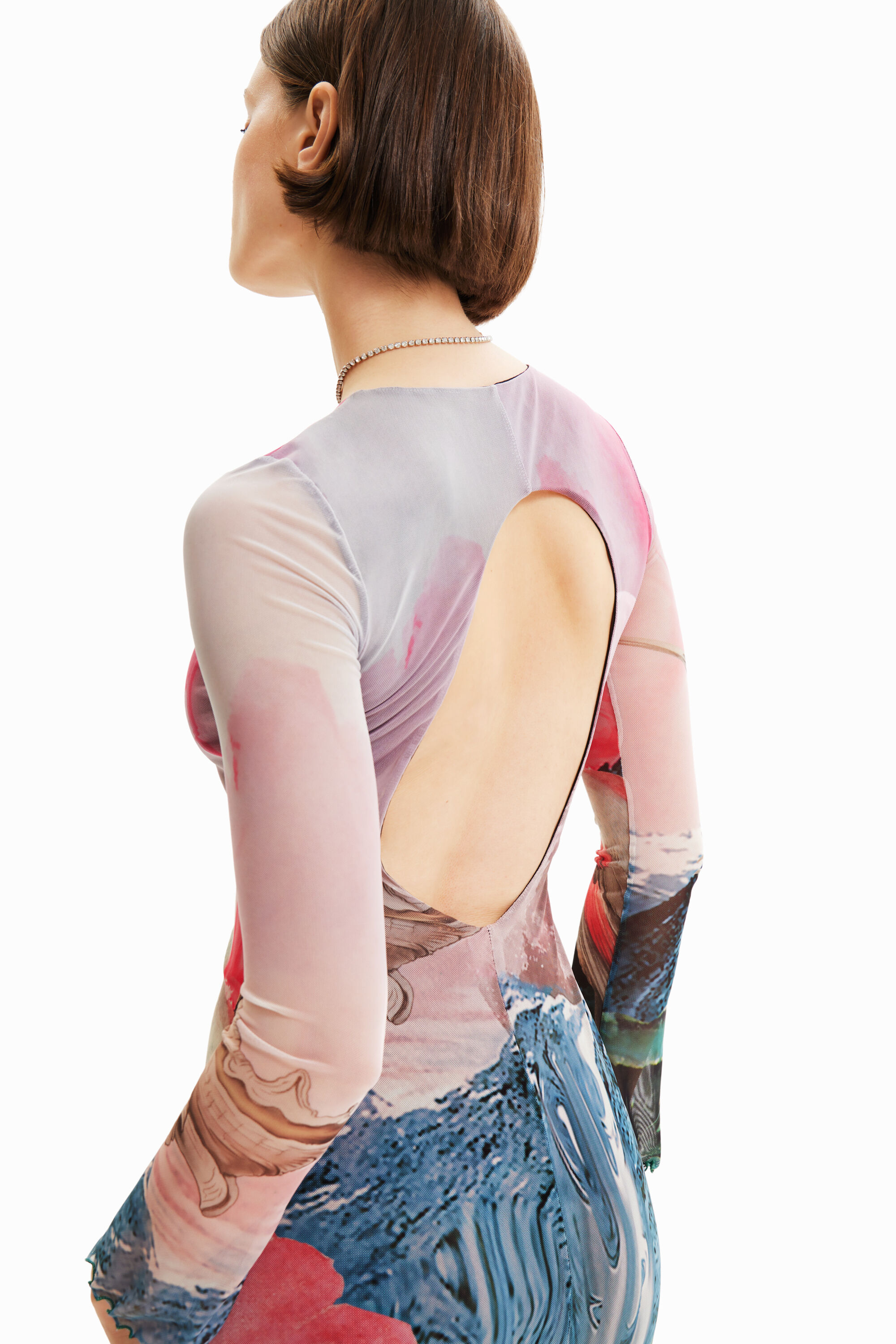 A fitted tulle midi dress with long sleeves and a wide cut-out on the back.Fit: SlimLength: MidiFantasy print with moon and hummingbirdRound neckShort sleevesBack slit on the hem and shorter liningSleeves and hem with contrasting wavy finishRecycled polyester