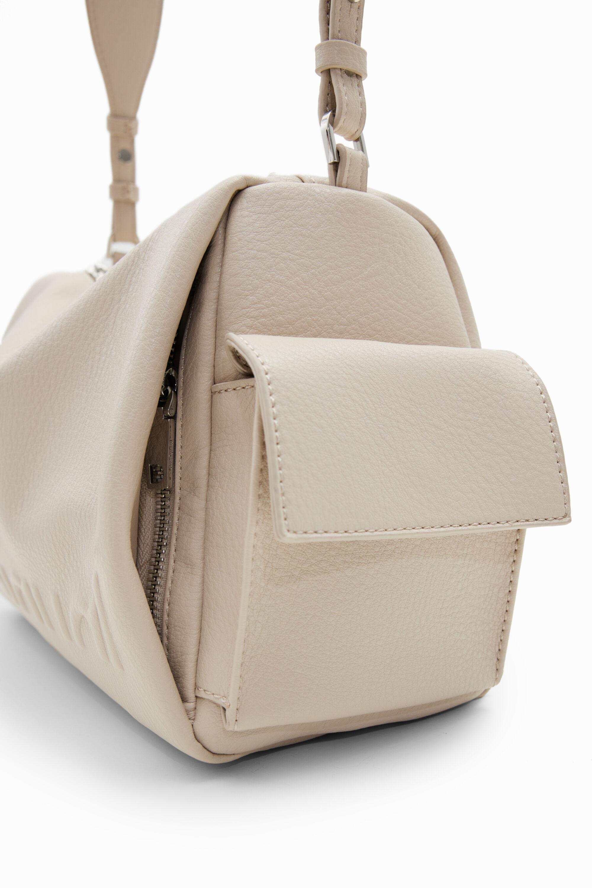 A midsize handbag in plain leather-effect fabric with an embossed front logo detail.