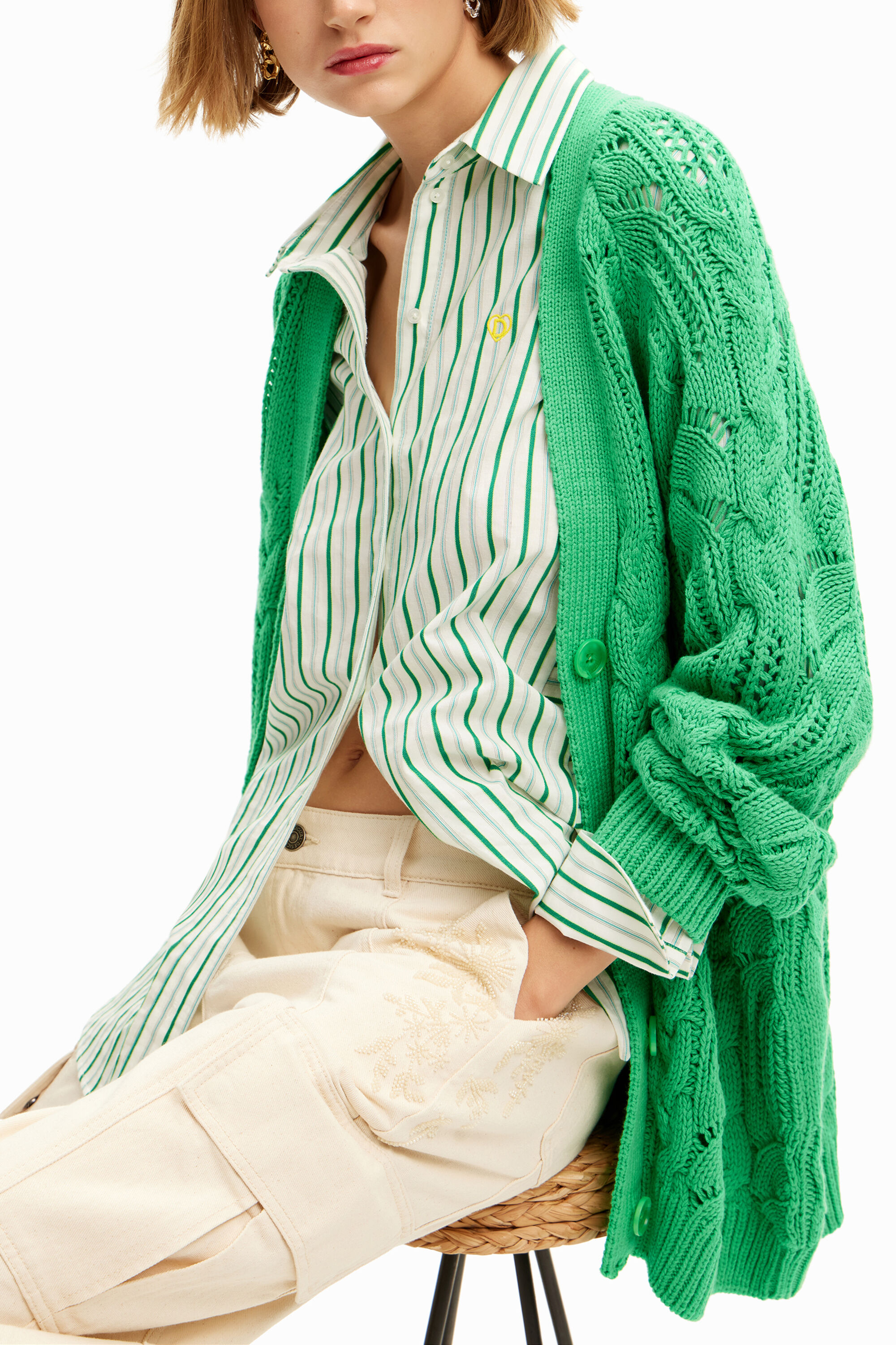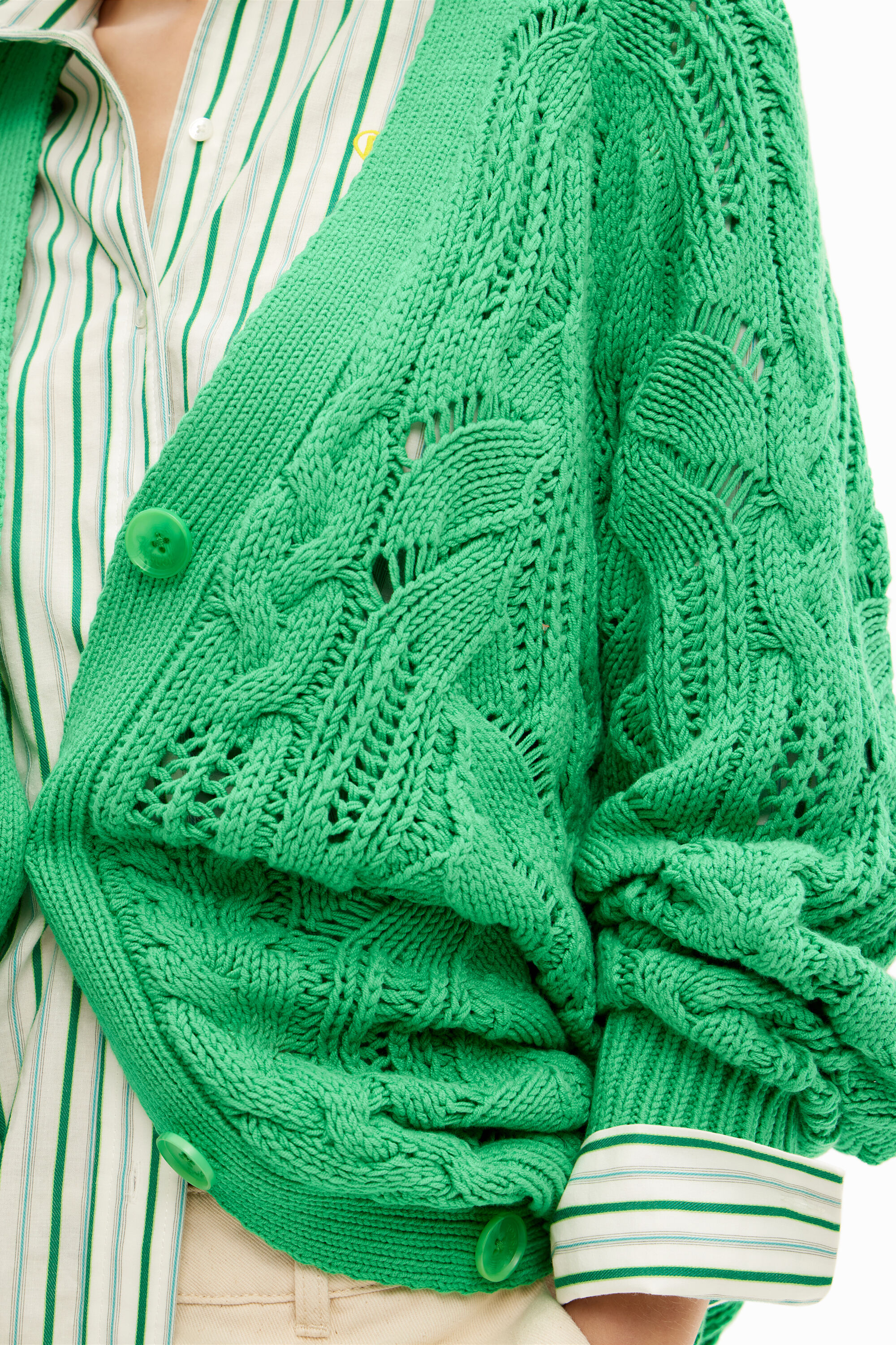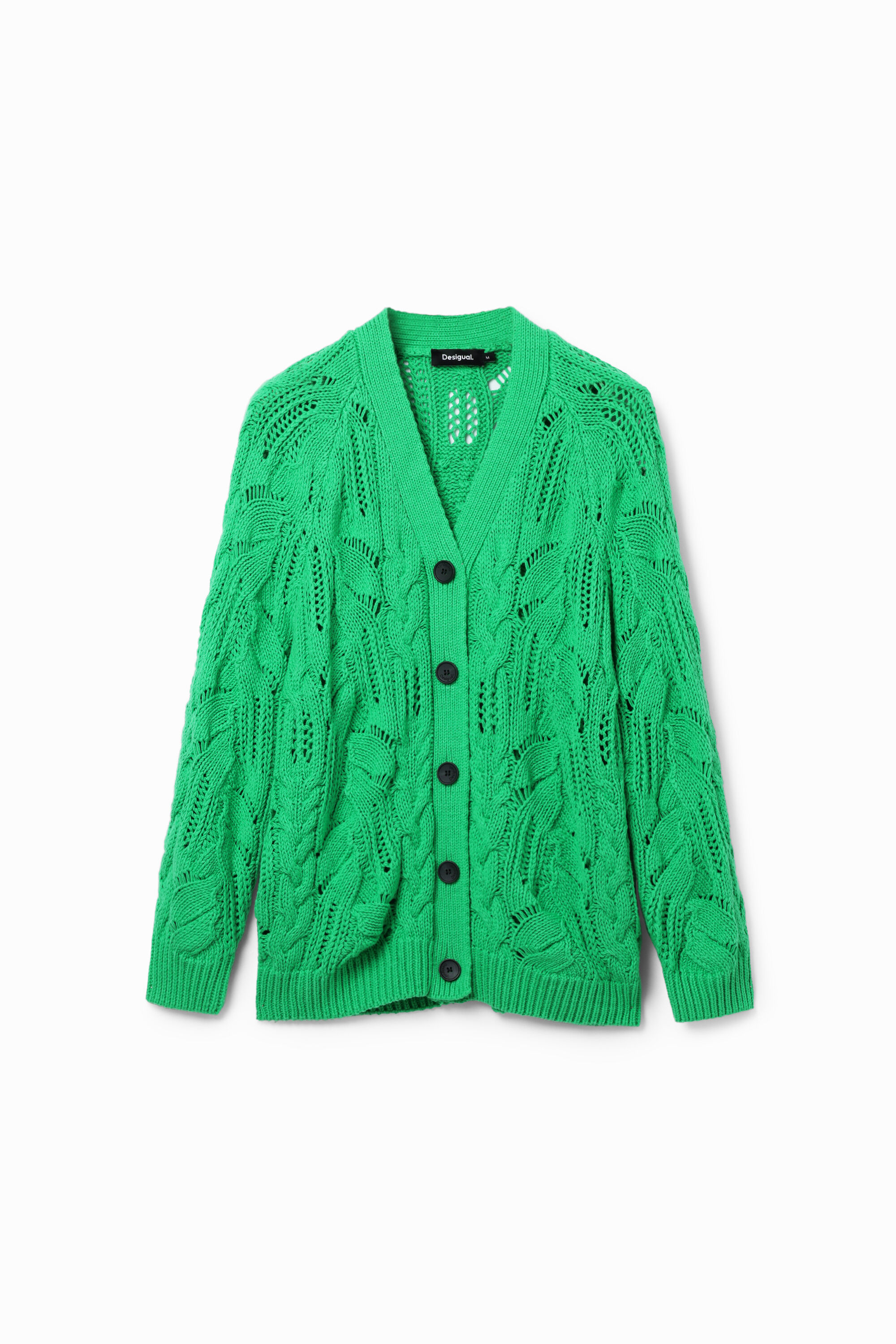 An oversize cardigan with long sleeves in chunky knit with an openwork and cable knit design.Fit: OversizeLength: MaxiPlain colourV-neckLong sleevesButton fasteningSoft-touch knitRibbed neck, cuffs and hemBy buying Desigual cotton products, you are supporting our investment in Better Cotton.