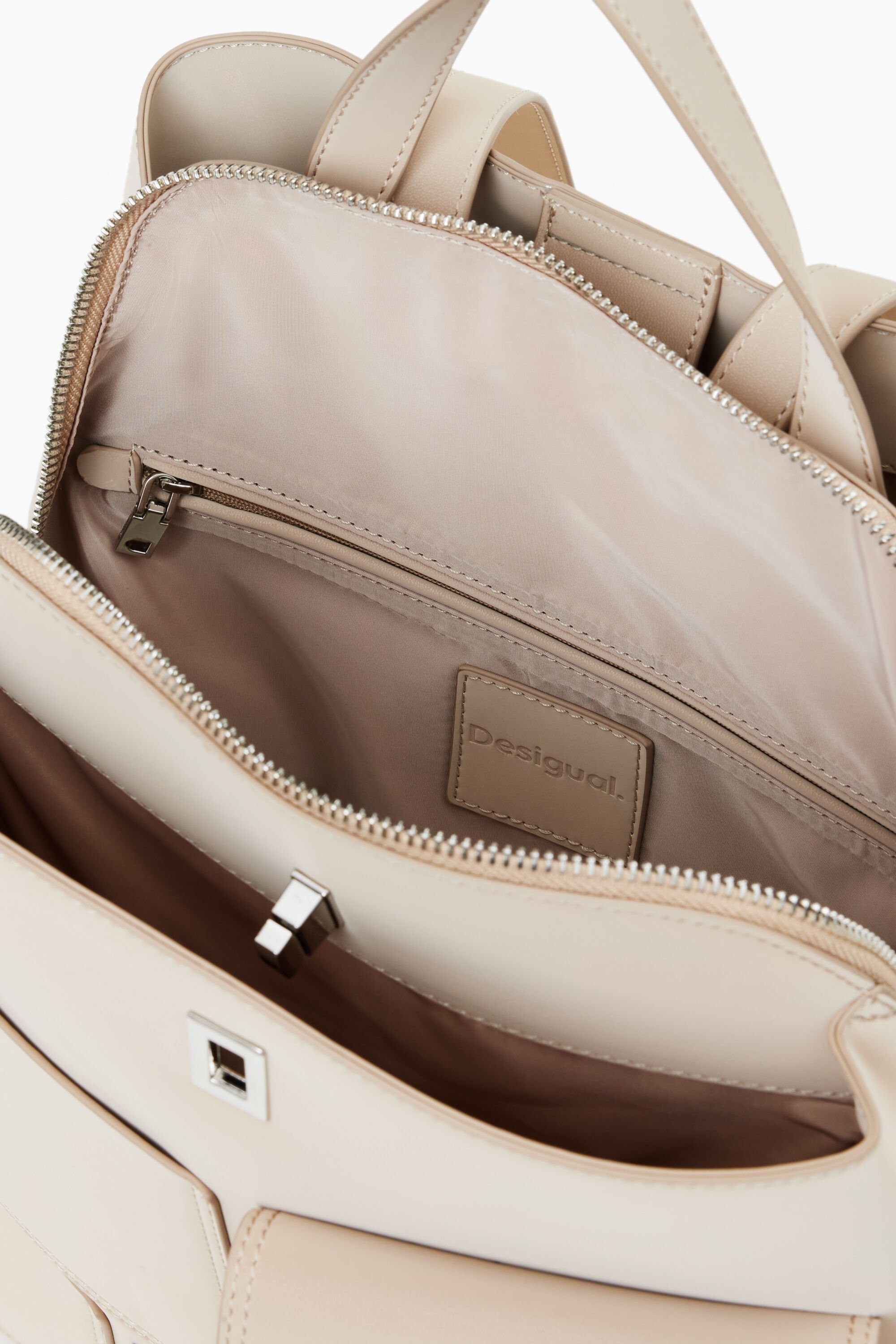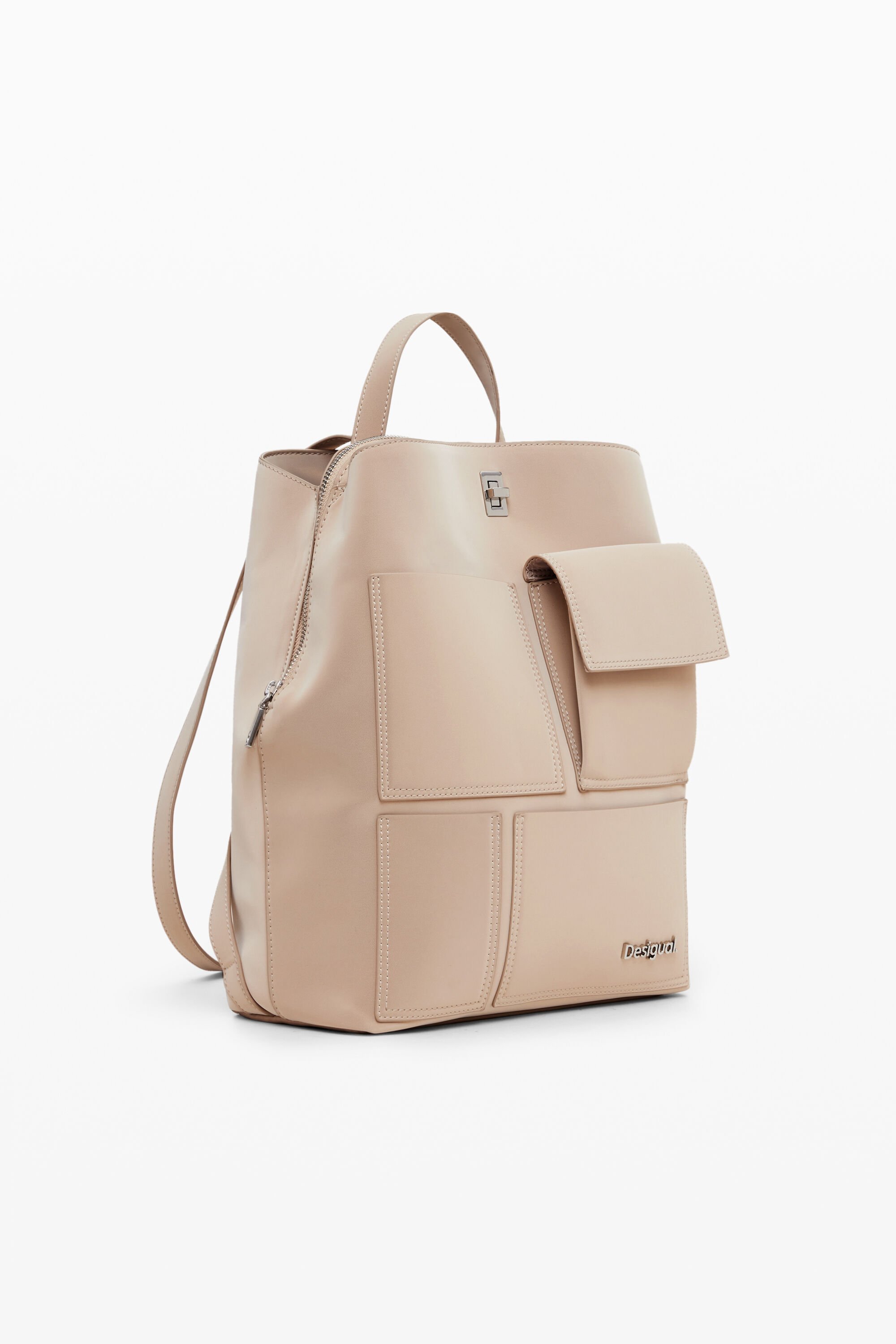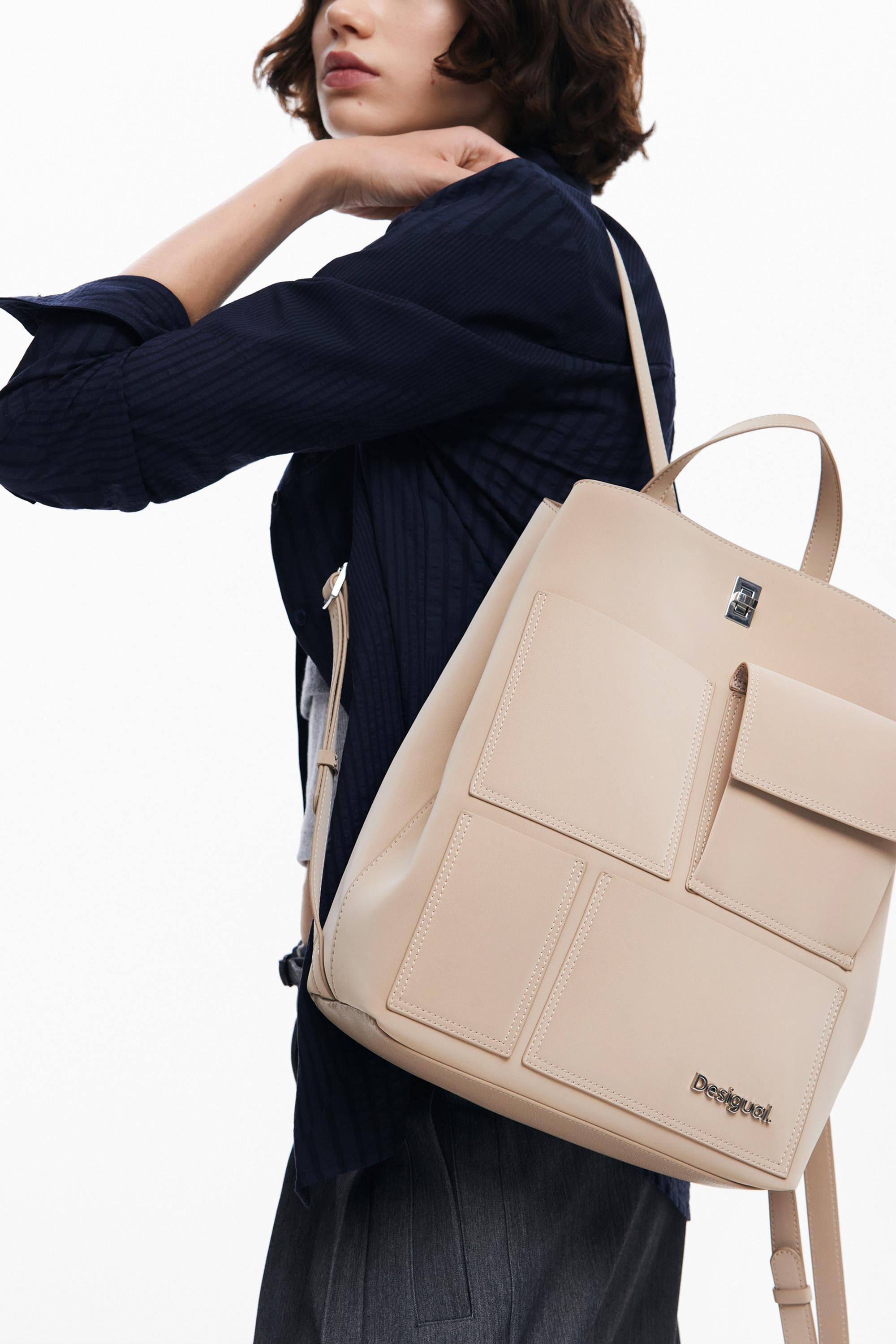 Faux leather effect fabric backpack with multiple exterior pockets and several interior compartments in solid color.Leather effectMultiple exterior and interior pocketsMultiple interior compartmentsZipper closureAdjustable strapsMetallic applique logo detailMeasurements: 27.70 x 10.20 x 34.50 cm