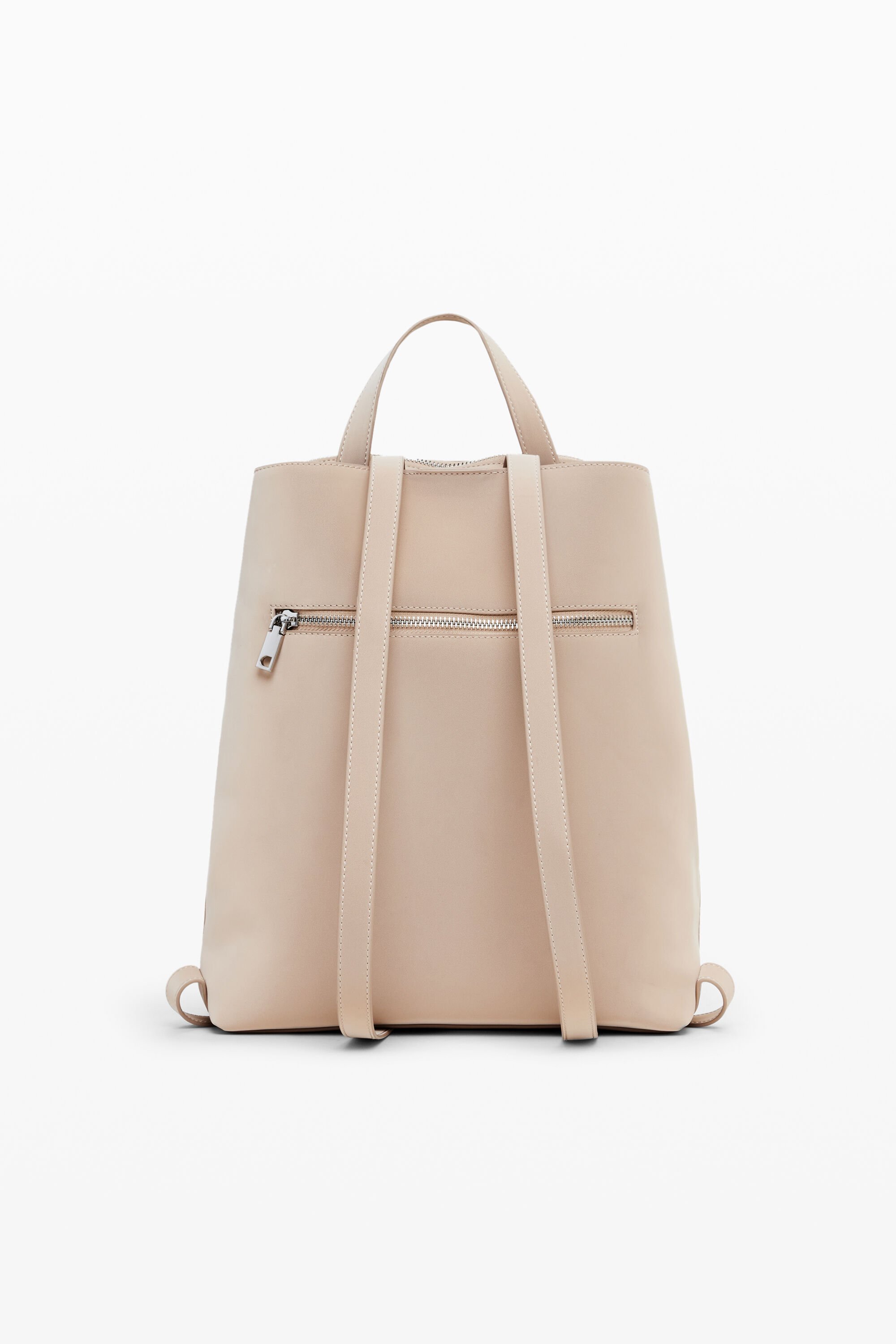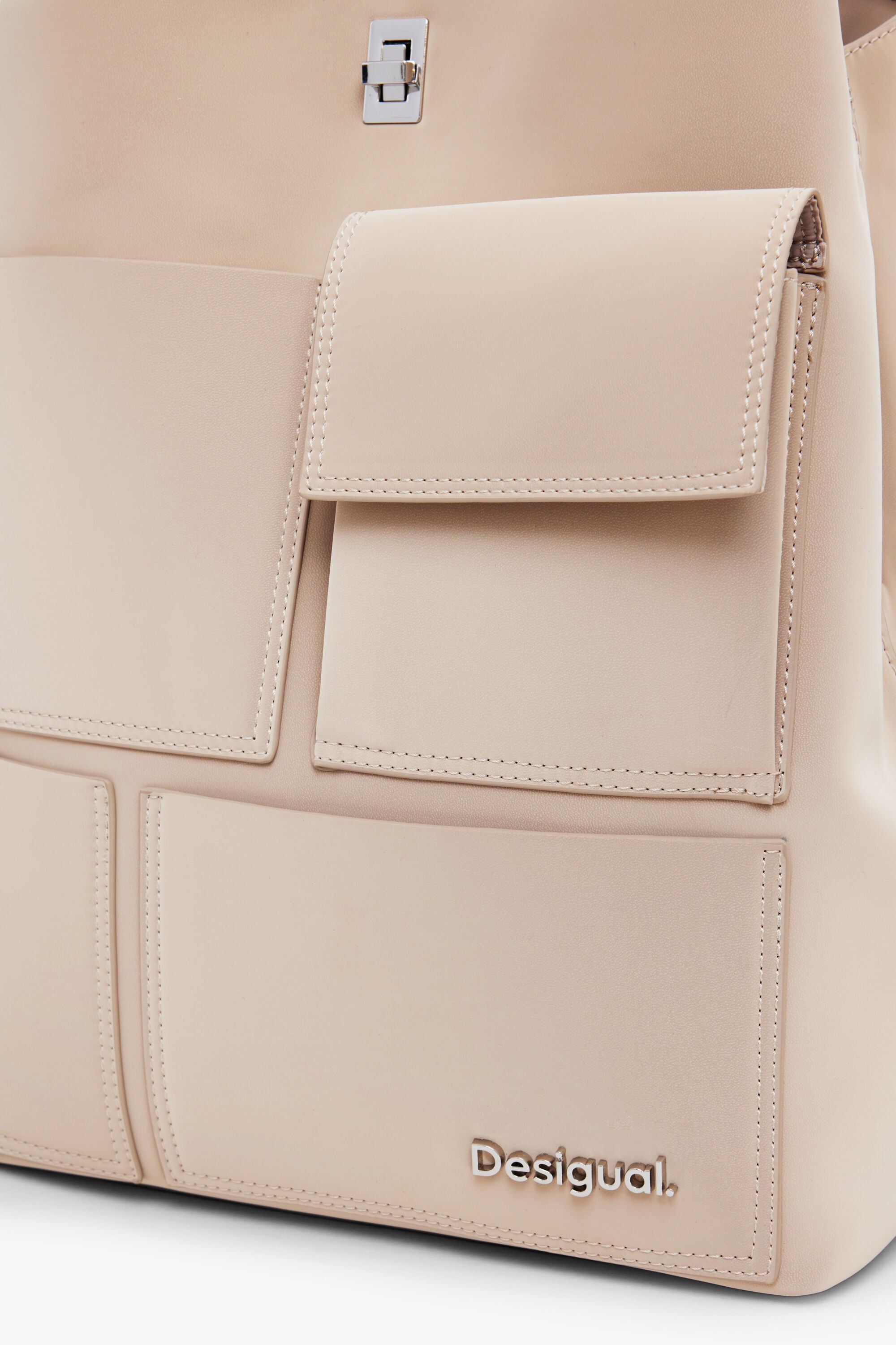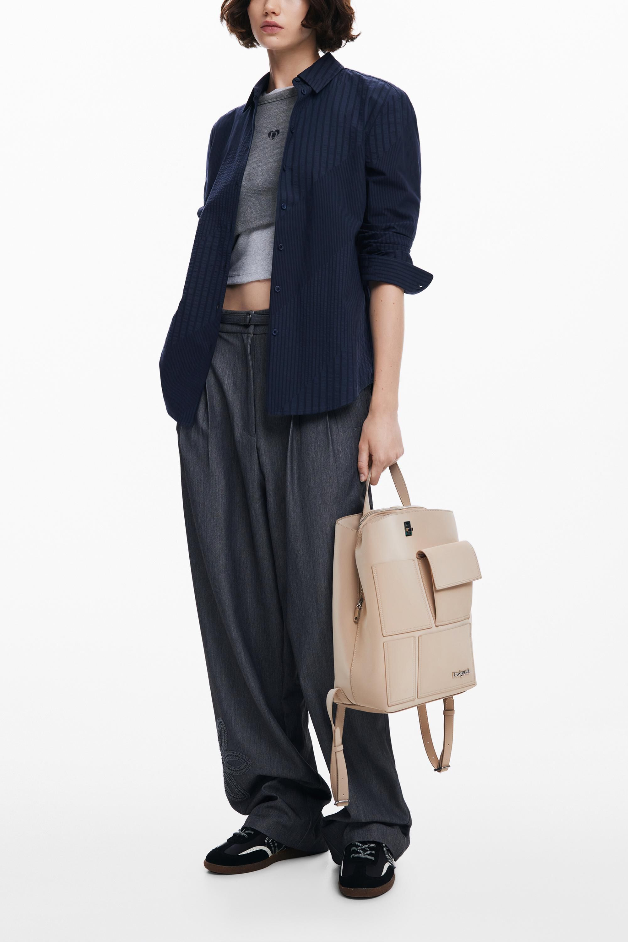 Faux leather effect fabric backpack with multiple exterior pockets and several interior compartments in solid color.Leather effectMultiple exterior and interior pocketsMultiple interior compartmentsZipper closureAdjustable strapsMetallic applique logo detailMeasurements: 27.70 x 10.20 x 34.50 cm