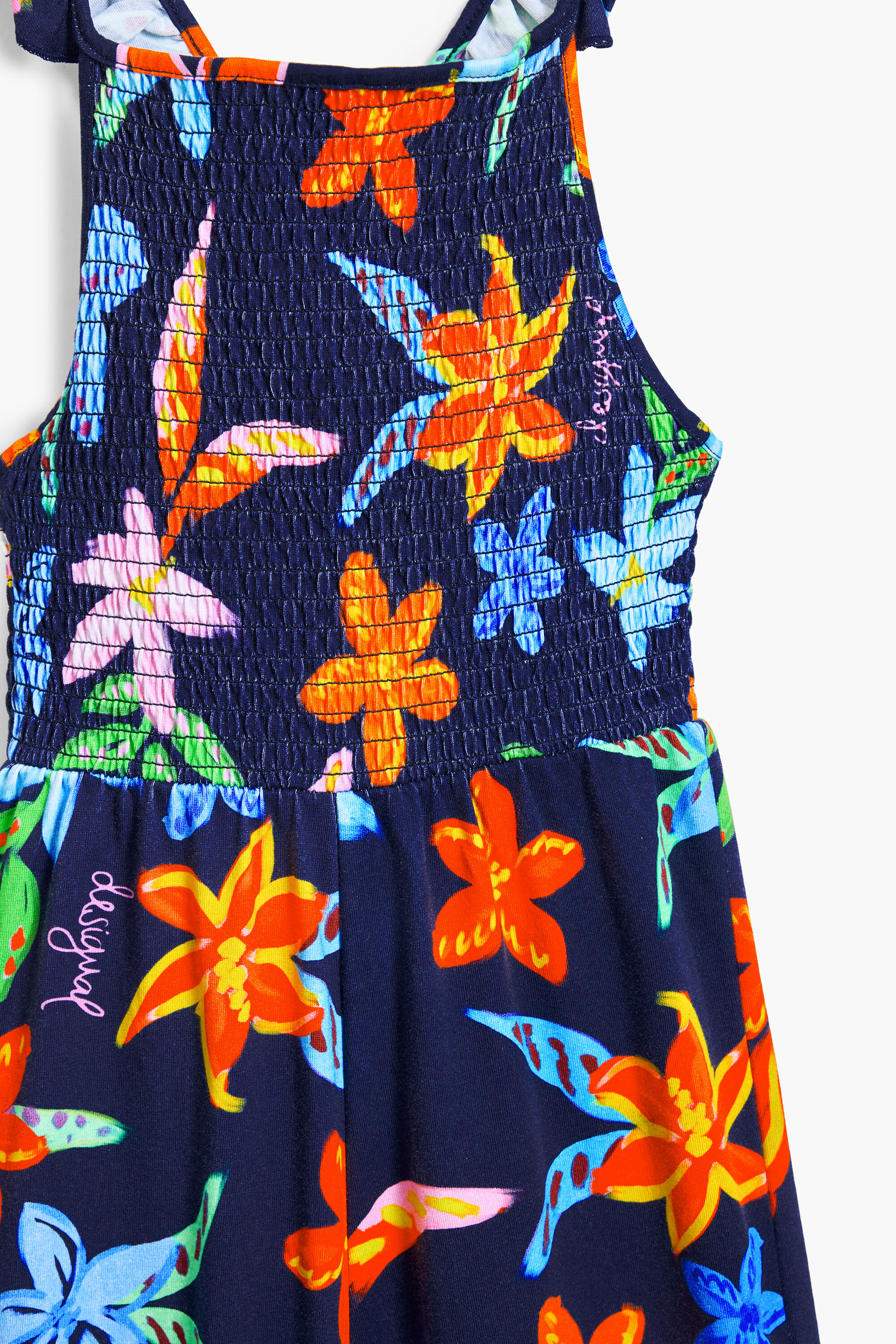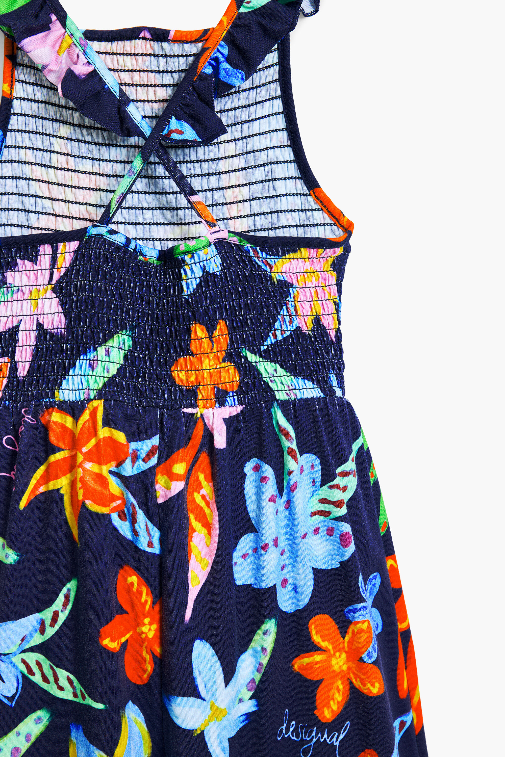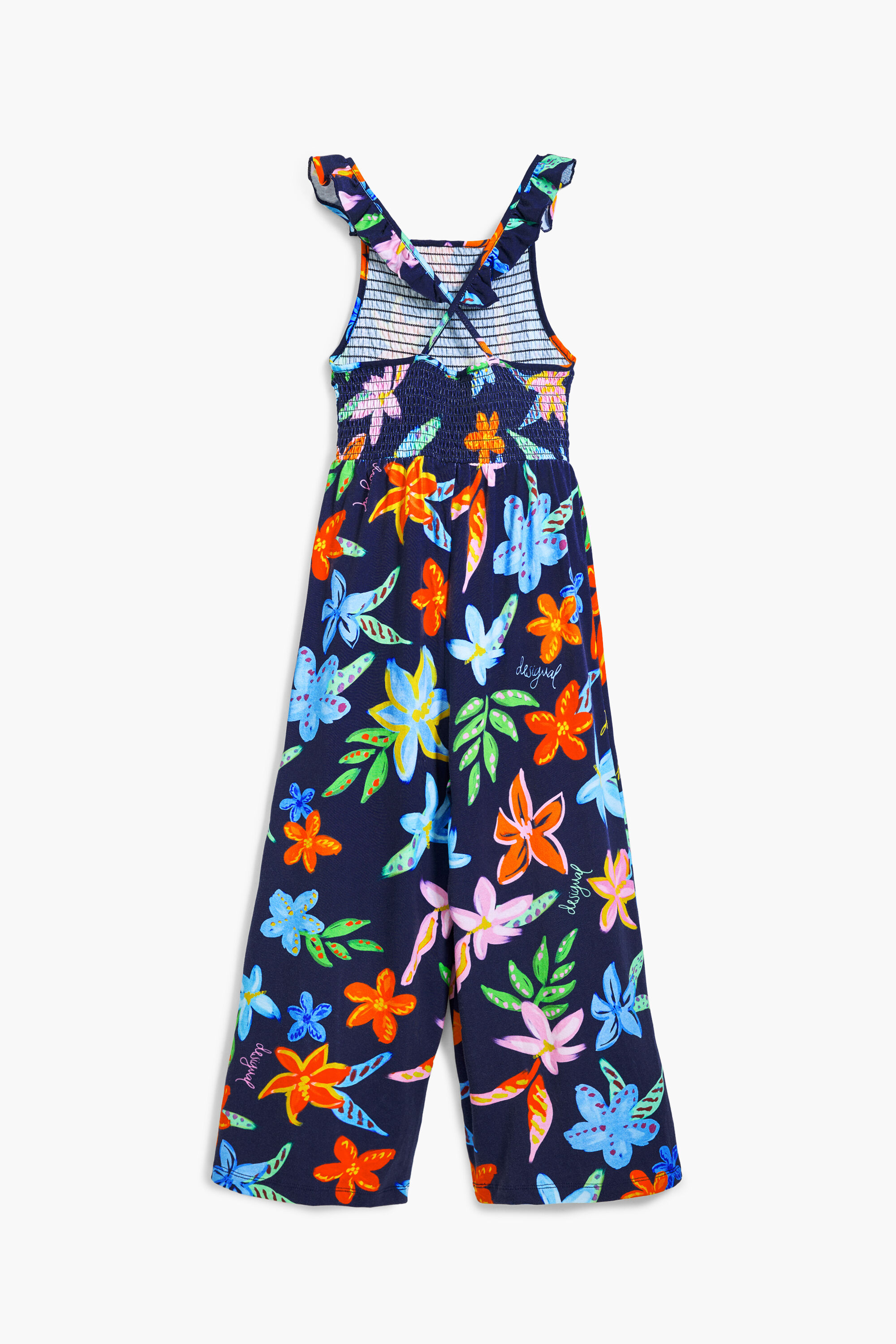Long strappy jumpsuit with floral print and ribbed effect on the chest