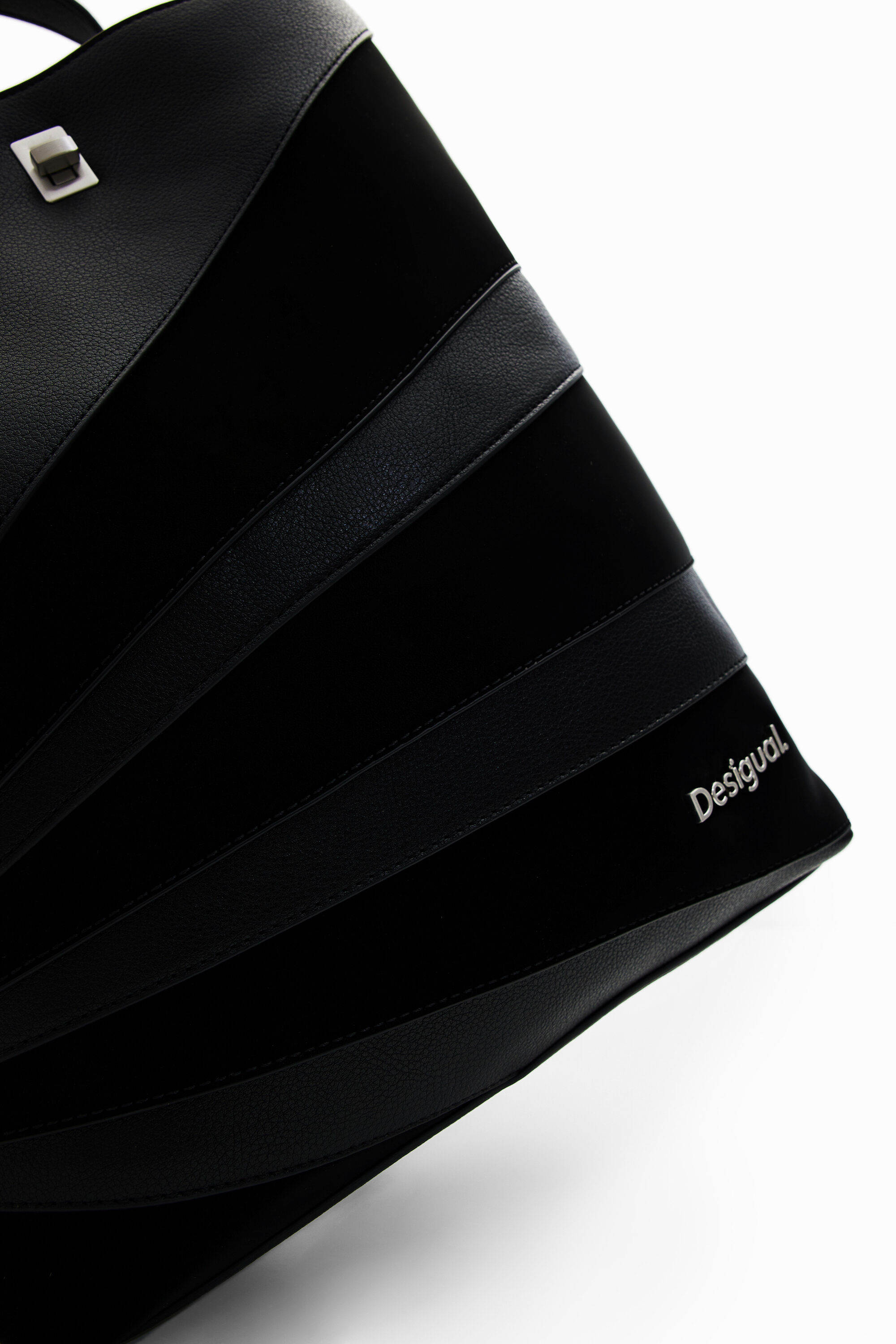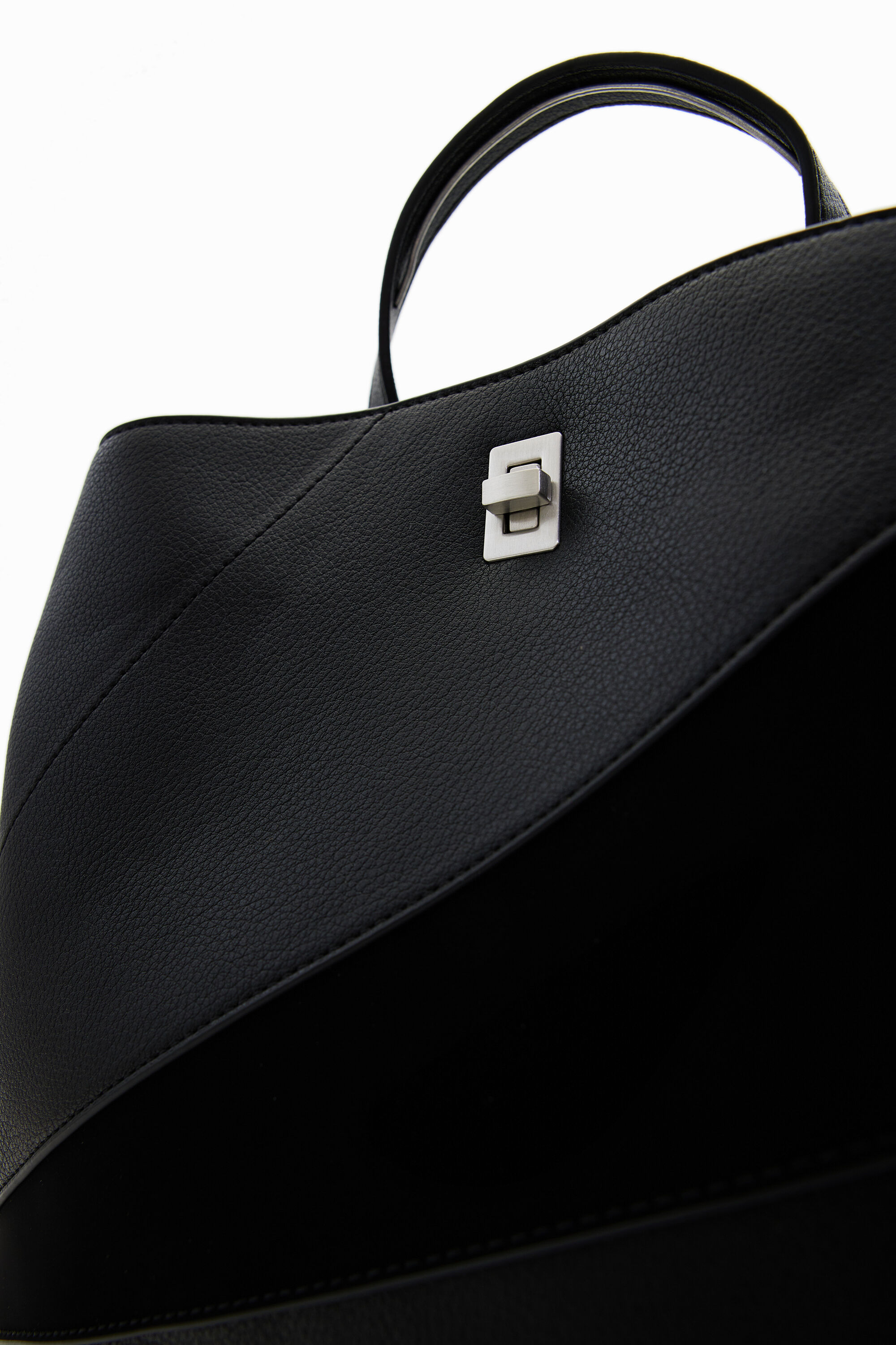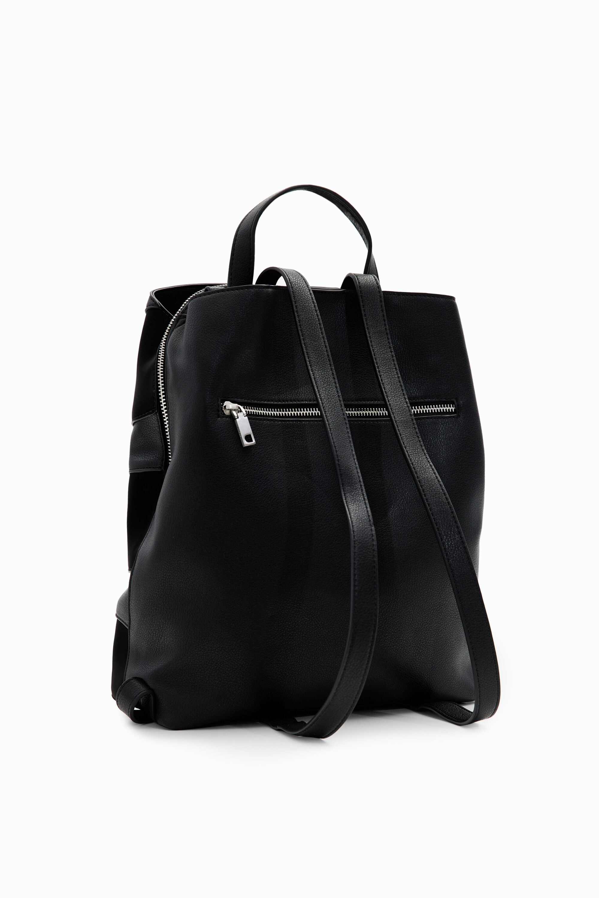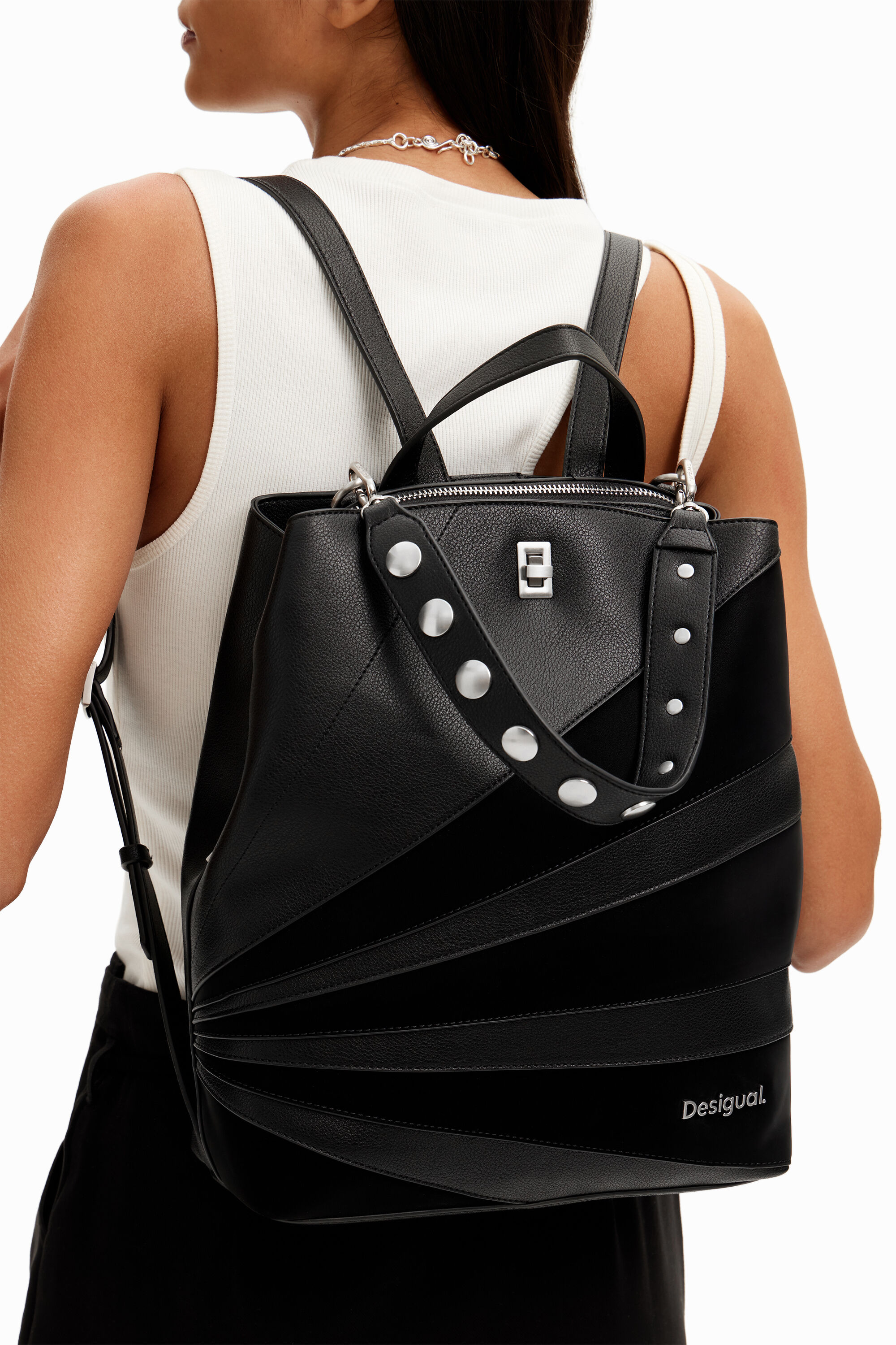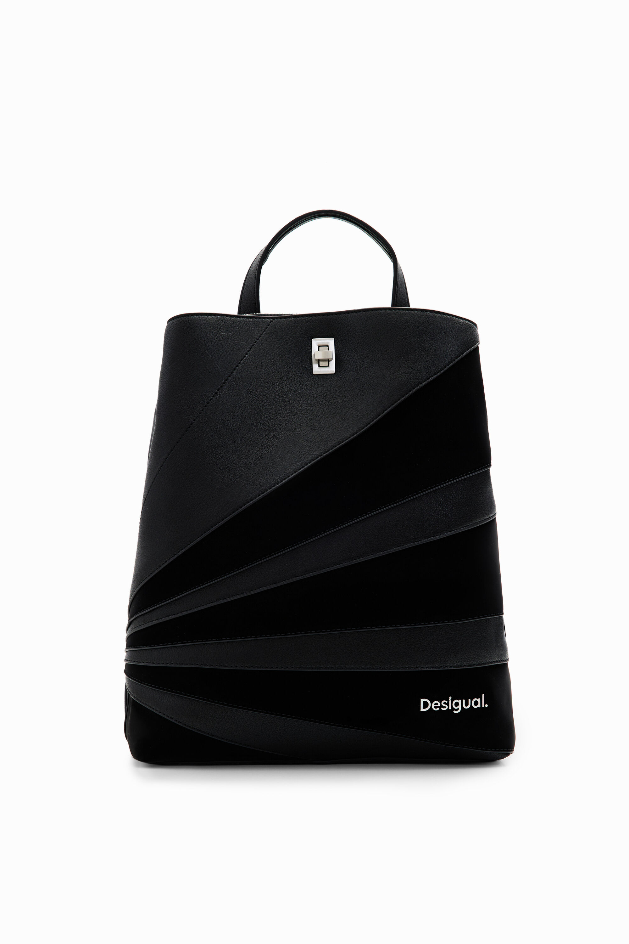 A midsize multi-position leather-effect backpack in a patchwork of different textures with compartments and pockets.Plain colour in two texturesMultiple inside and outside pocketsMetal closureThree compartments, one with a zipSeveral strapsShort detachable handle with studs that converts it into a handbagLeather-effect fabricRecycled PU26.7 x 10.2 x 34.5 cm