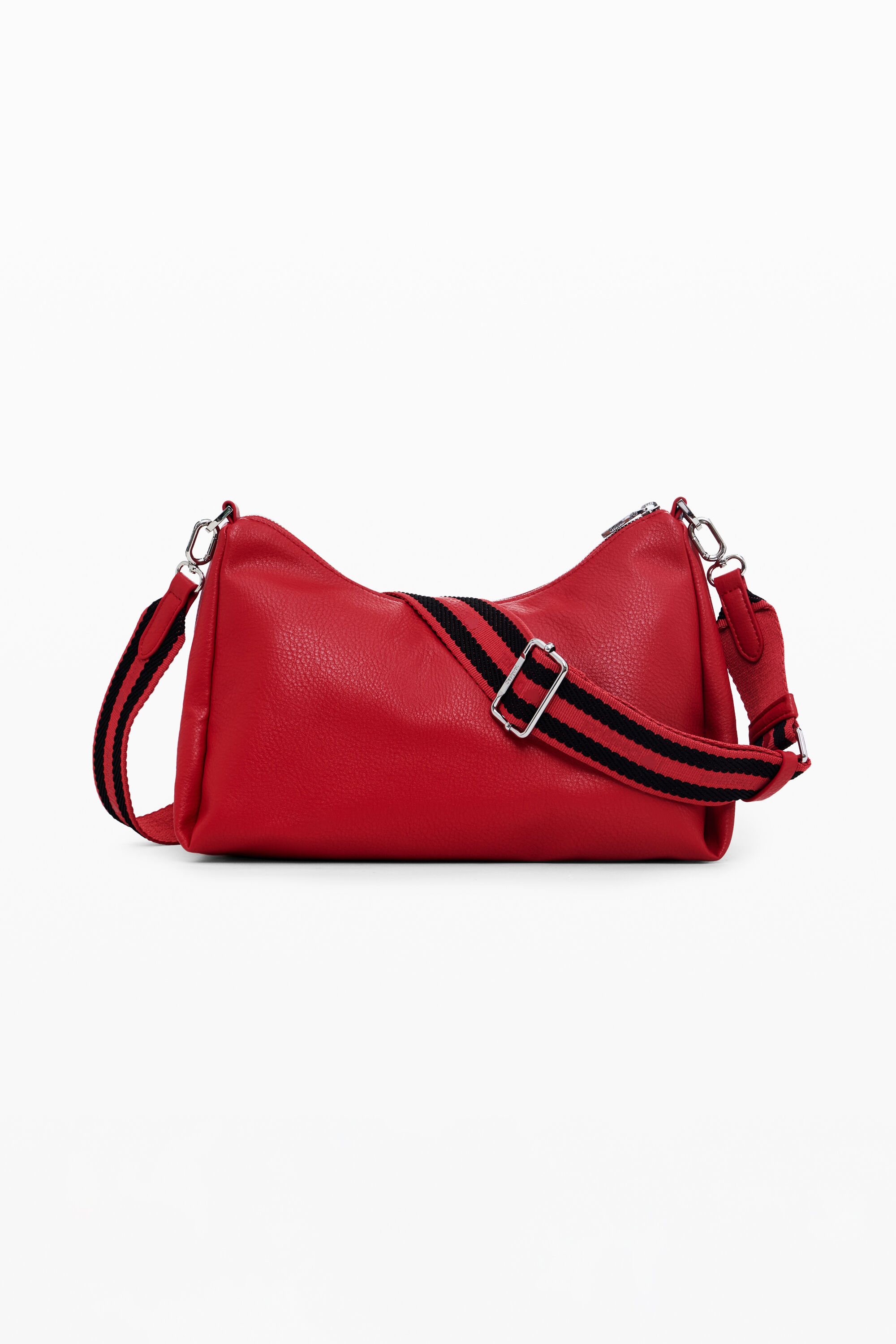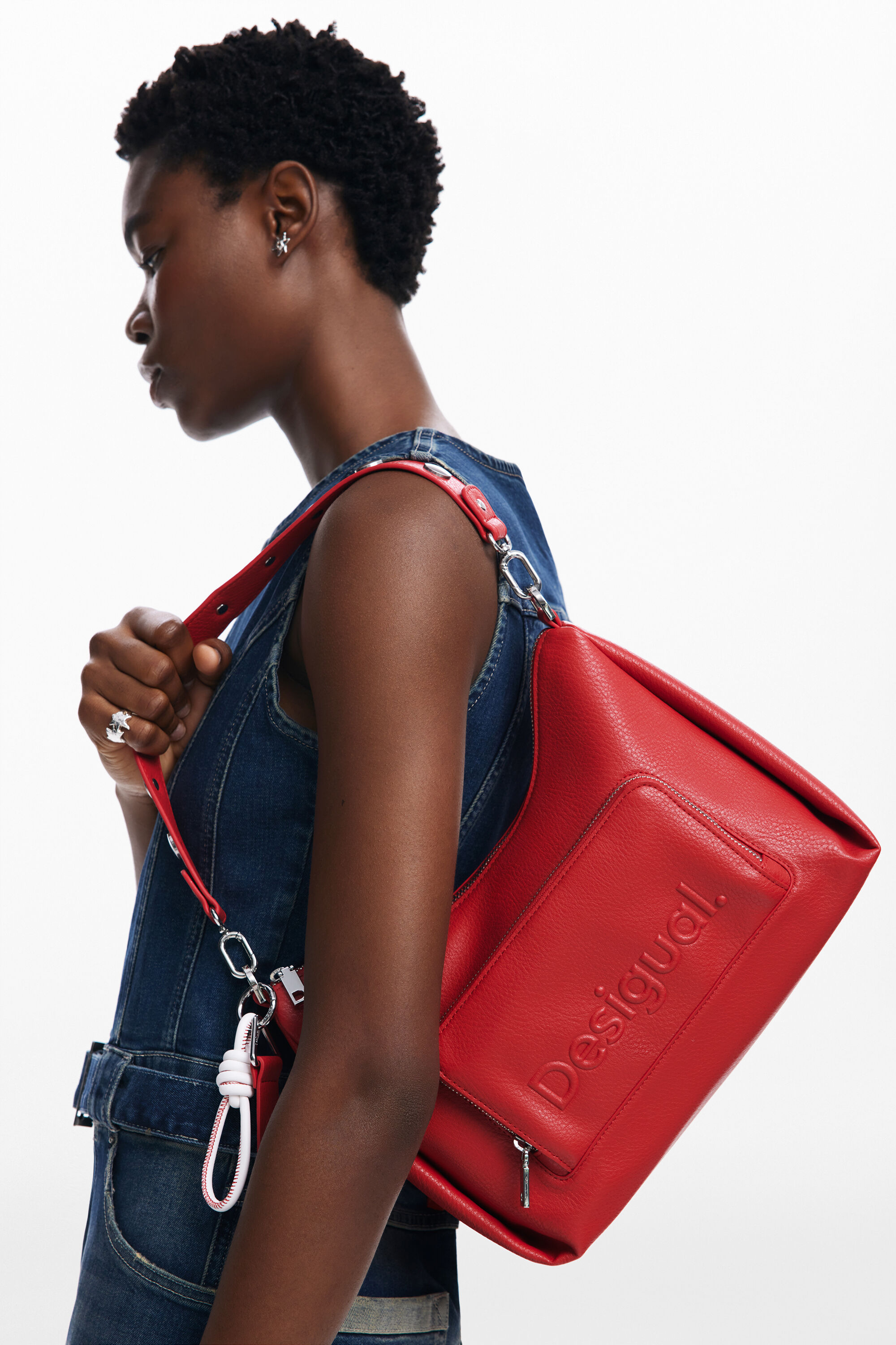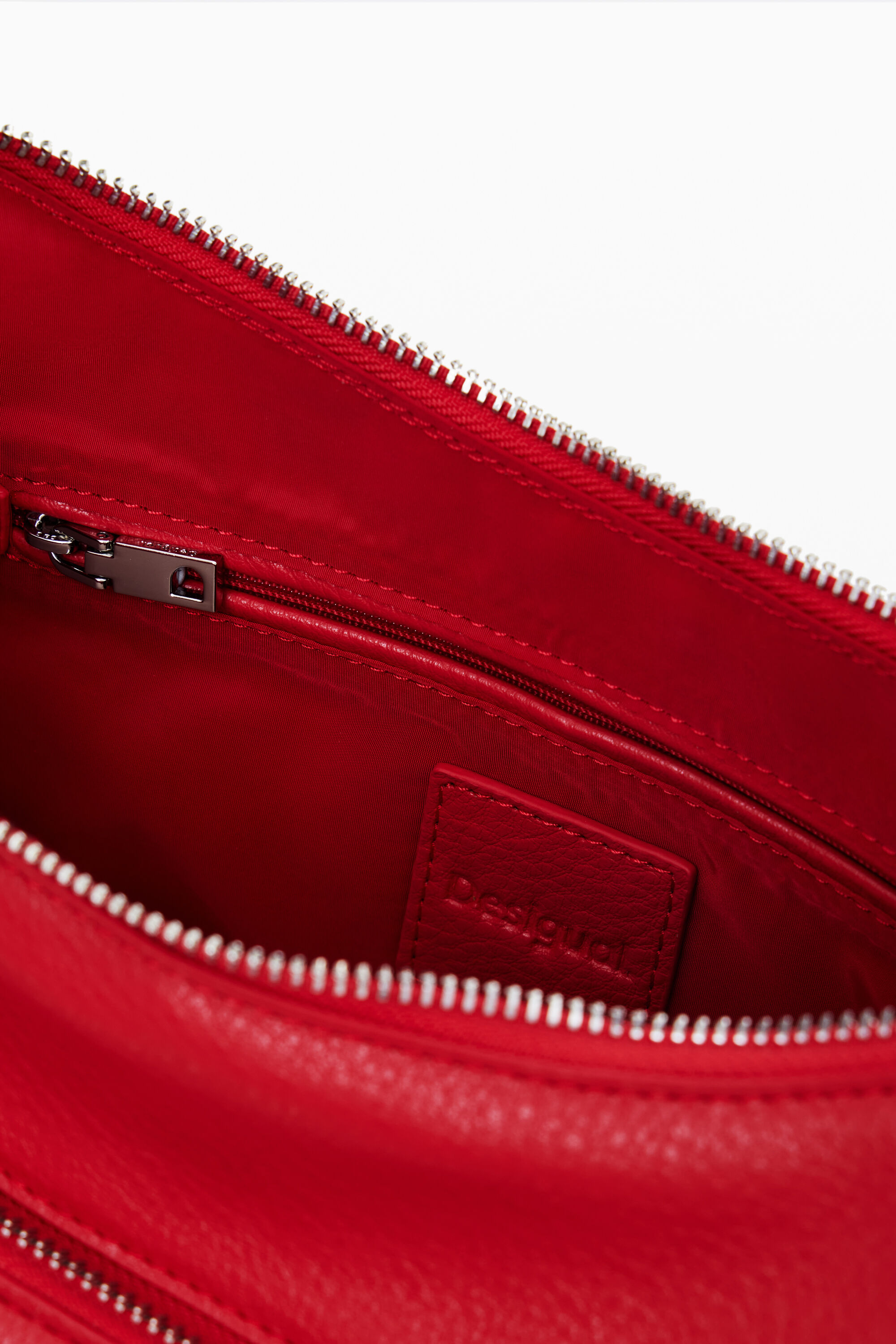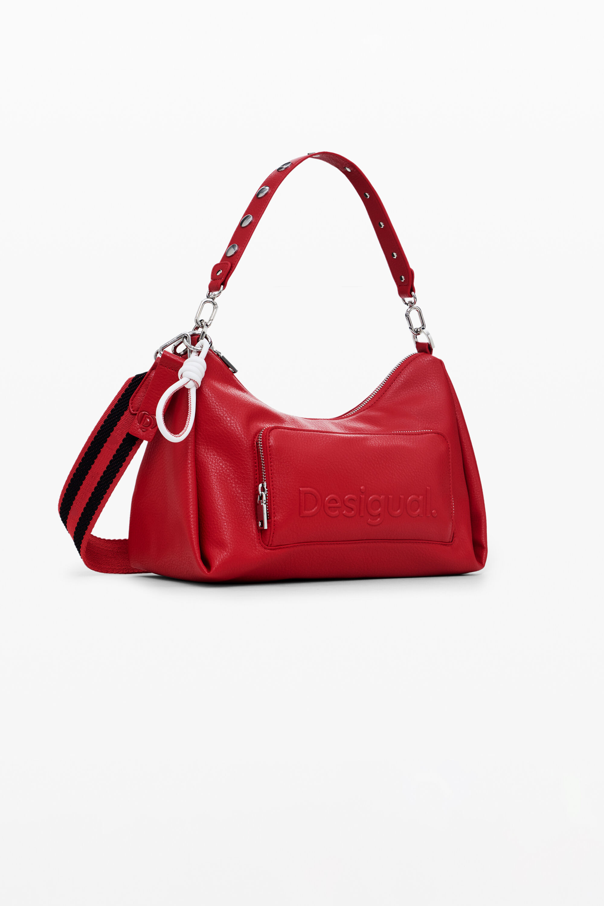 Small handbag in faux leather fabric, multiple handles and pocketsSolid colorExterior and interior pocketsZipper closureExterior compartments with zipper closureOne long strap and one short detachable strap with studs