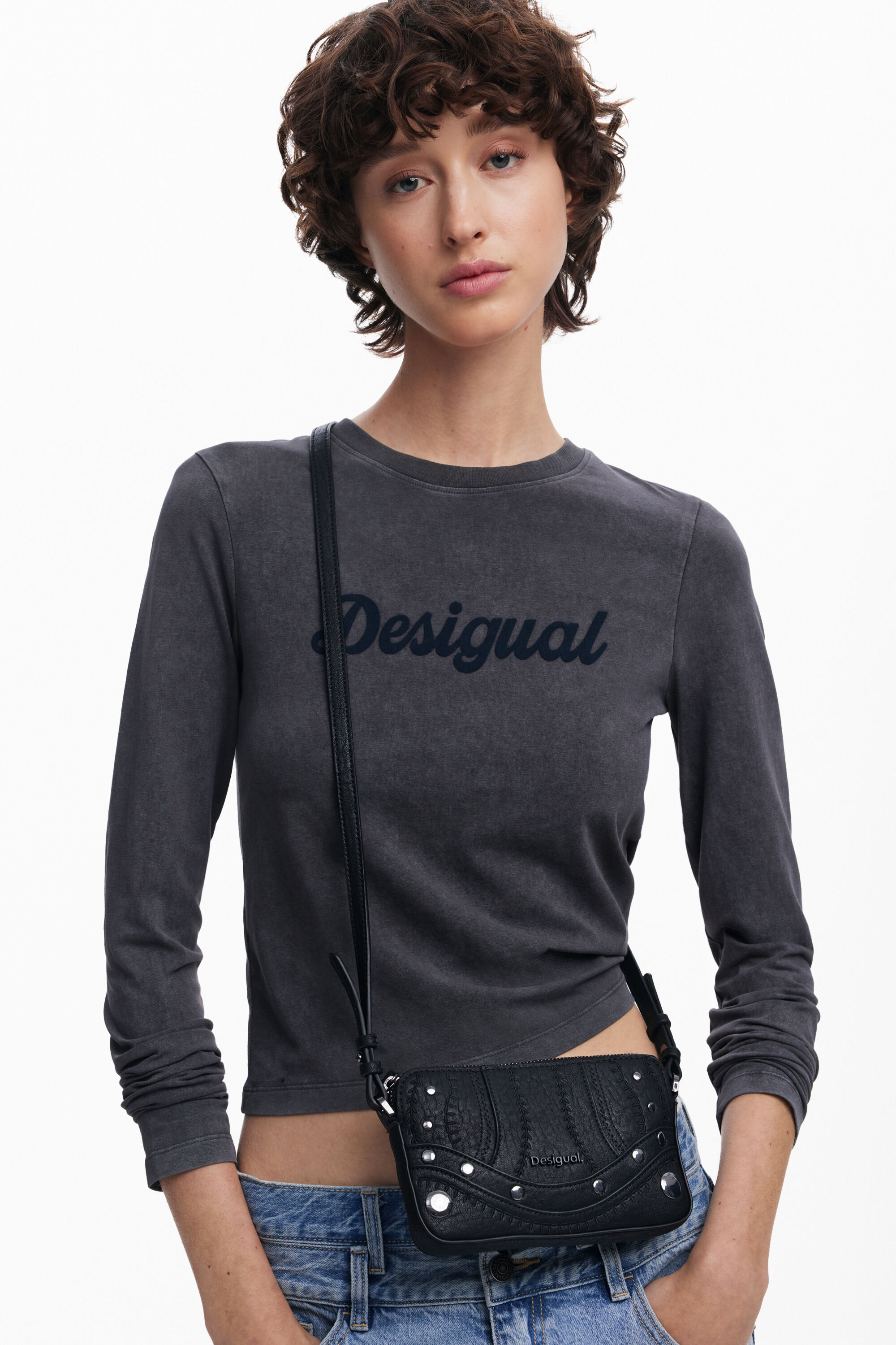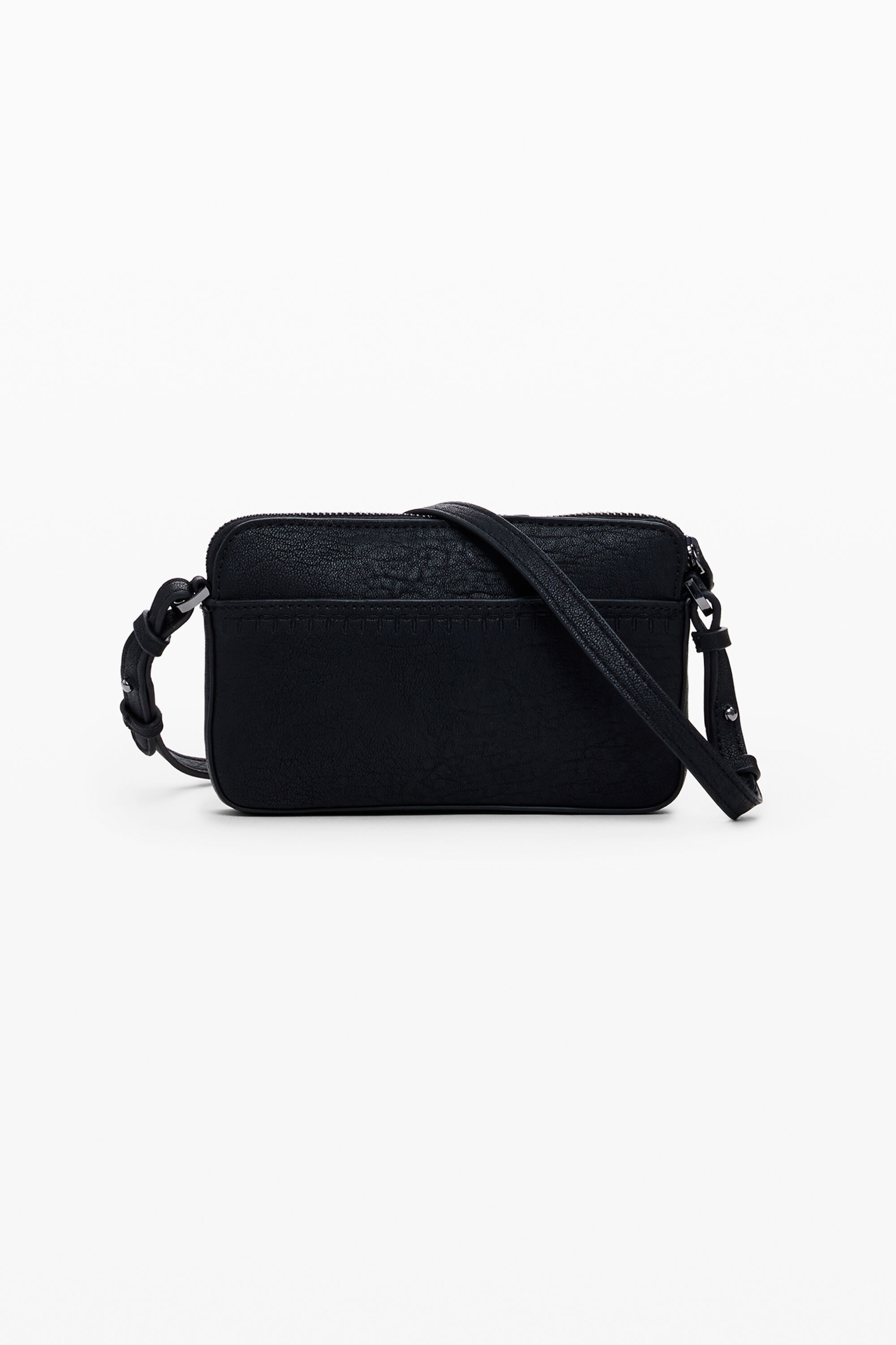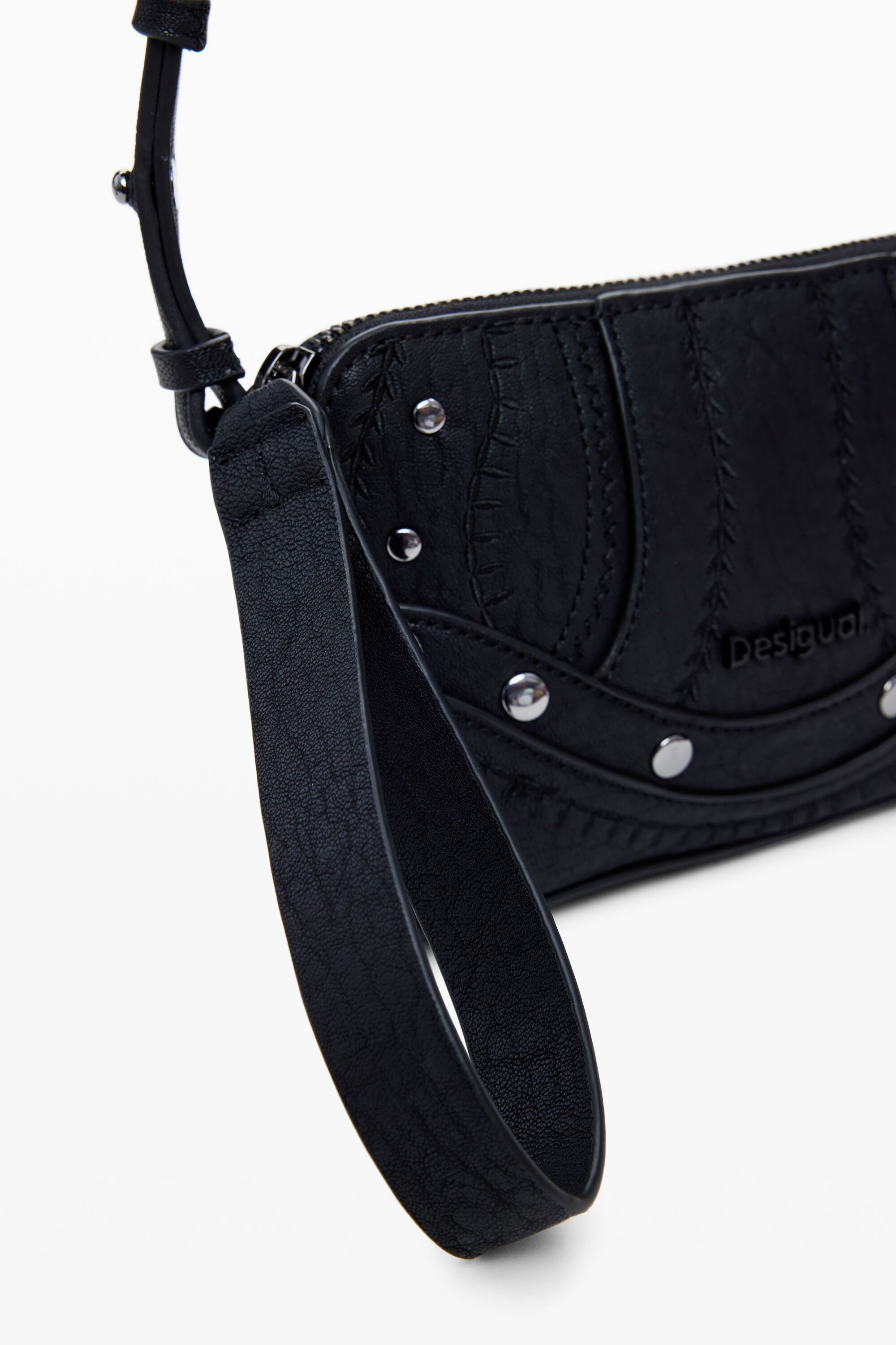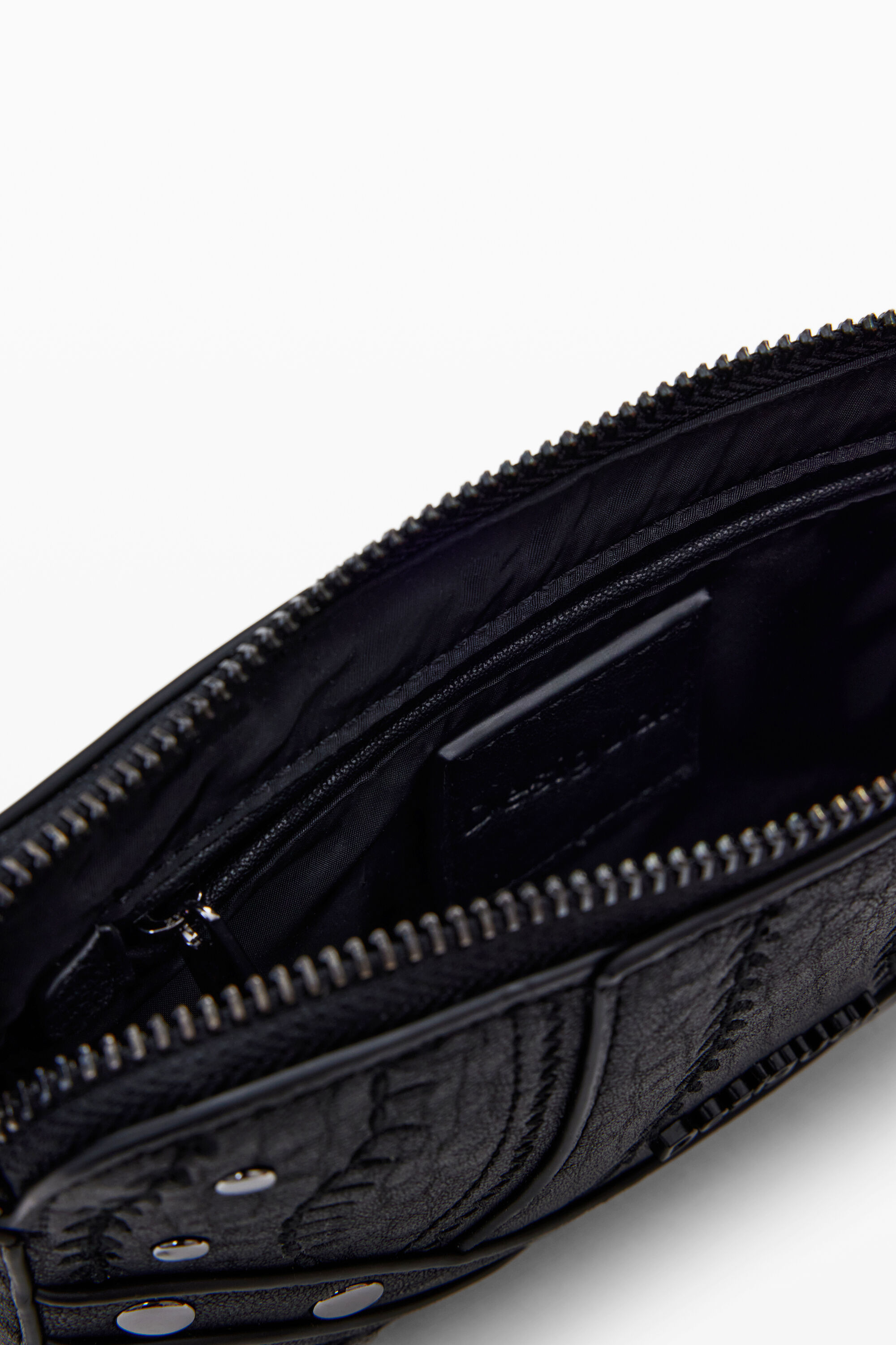 Large wallet with adjustable strap to wear as a crossbody, in textured leather effect with various geometric flower embroideries, multiple handles, and zipper closureLeather effectClosure: ZipperMultiple interior compartmentsDetachable handleEmbroidery details and metal studsMeasurements: 18.5 x 2.5 x 1 1 cm