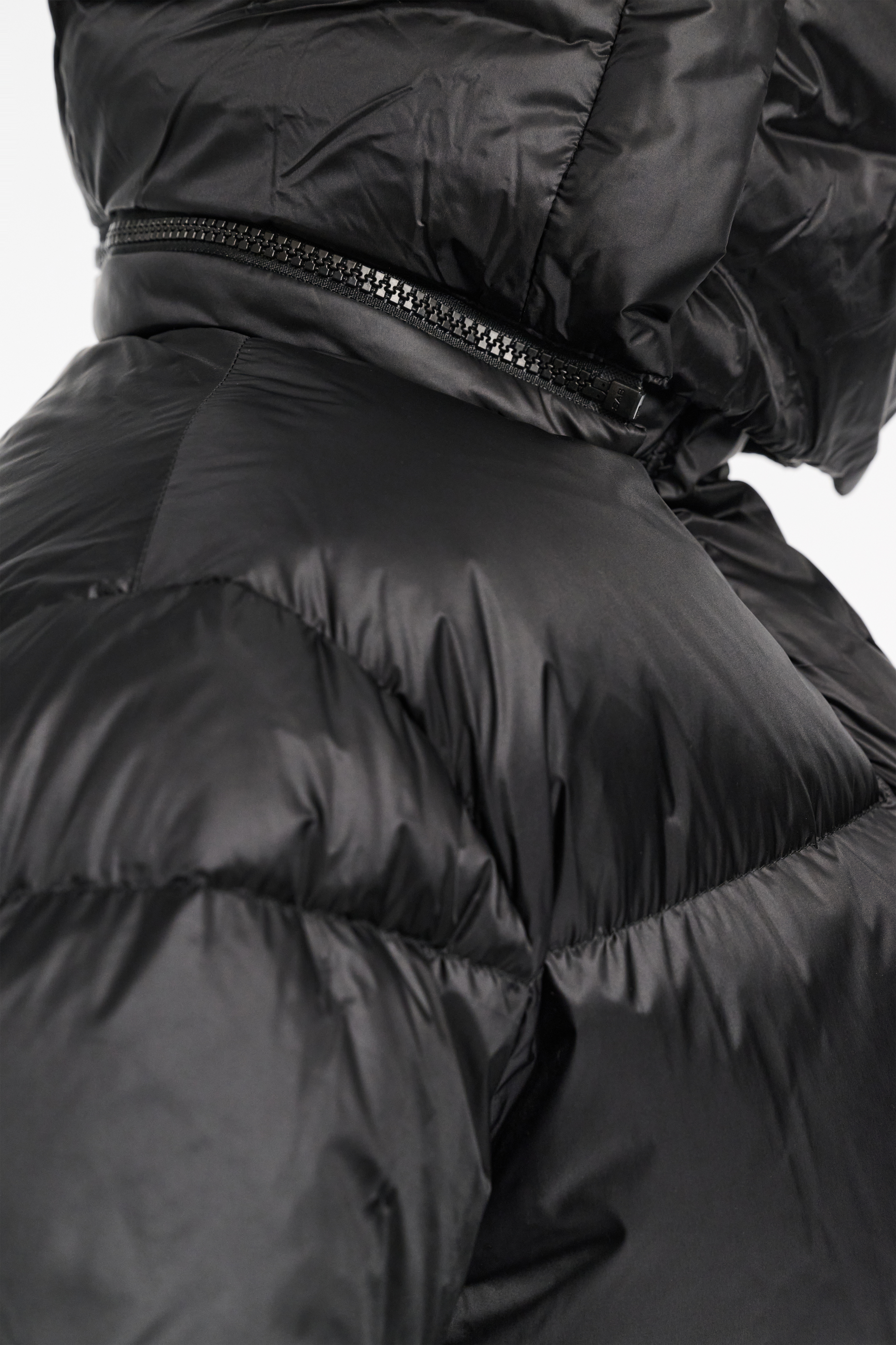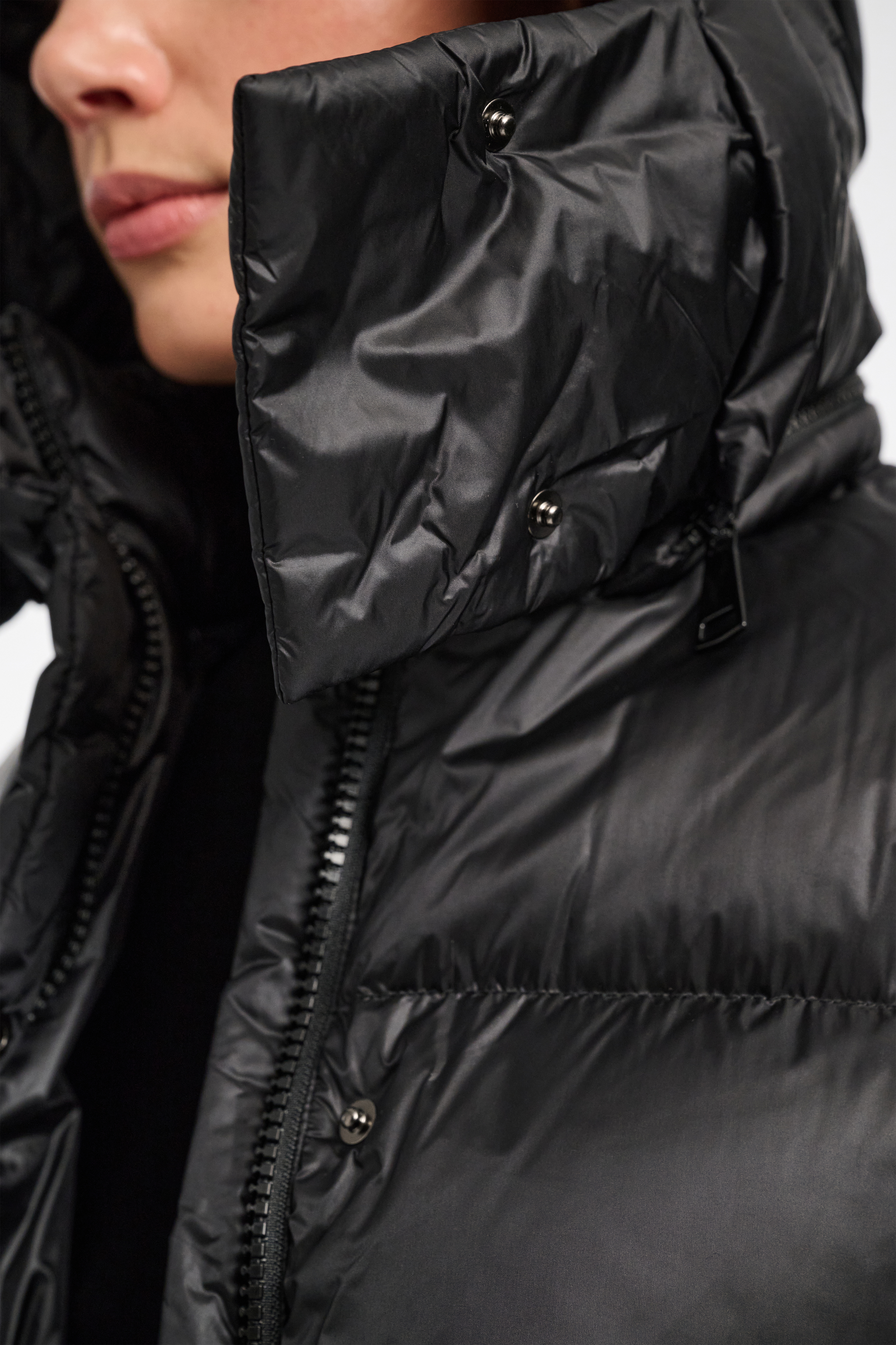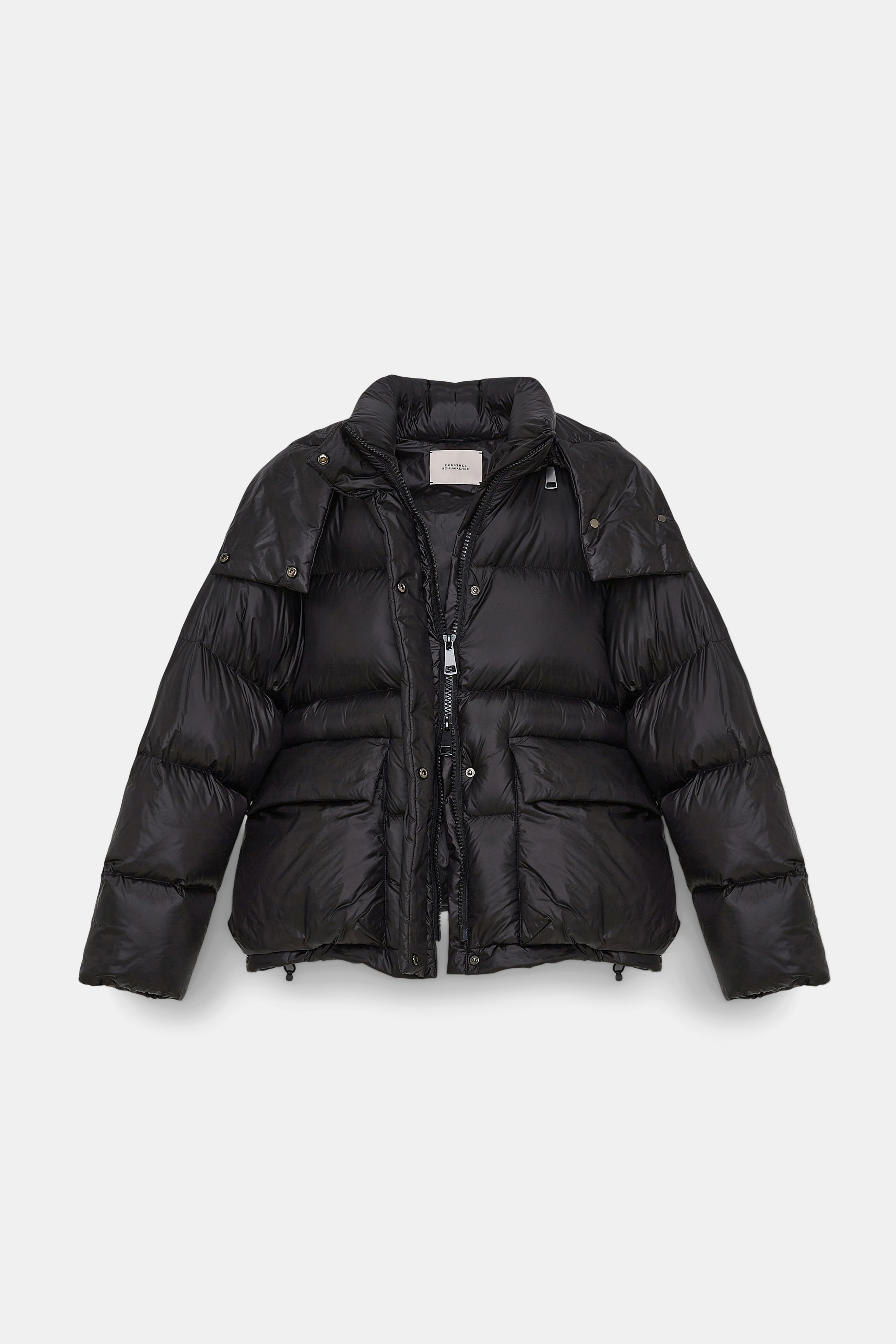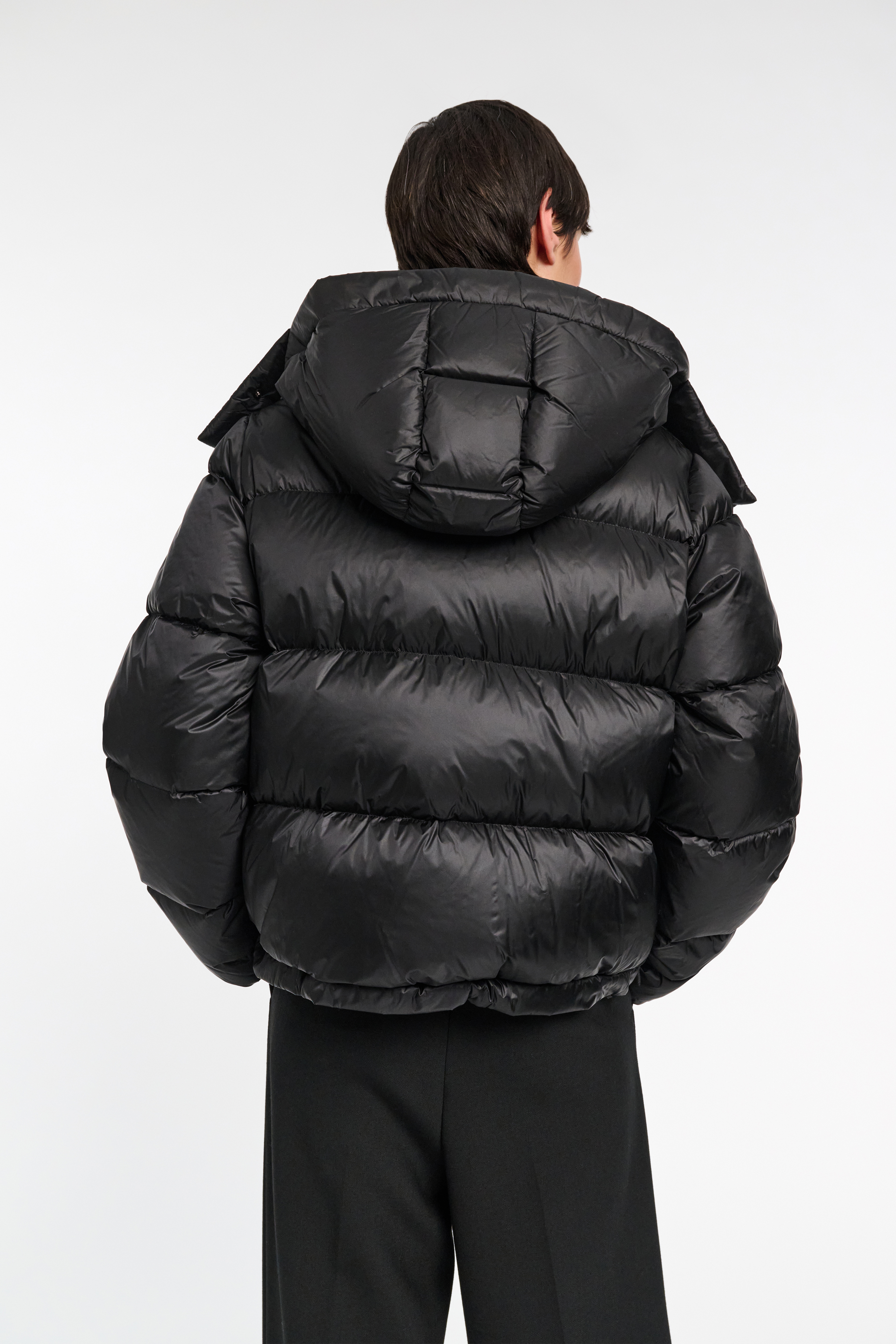 The quilted nylon down jacket is slightly oversized and has an optional zip-on hood.