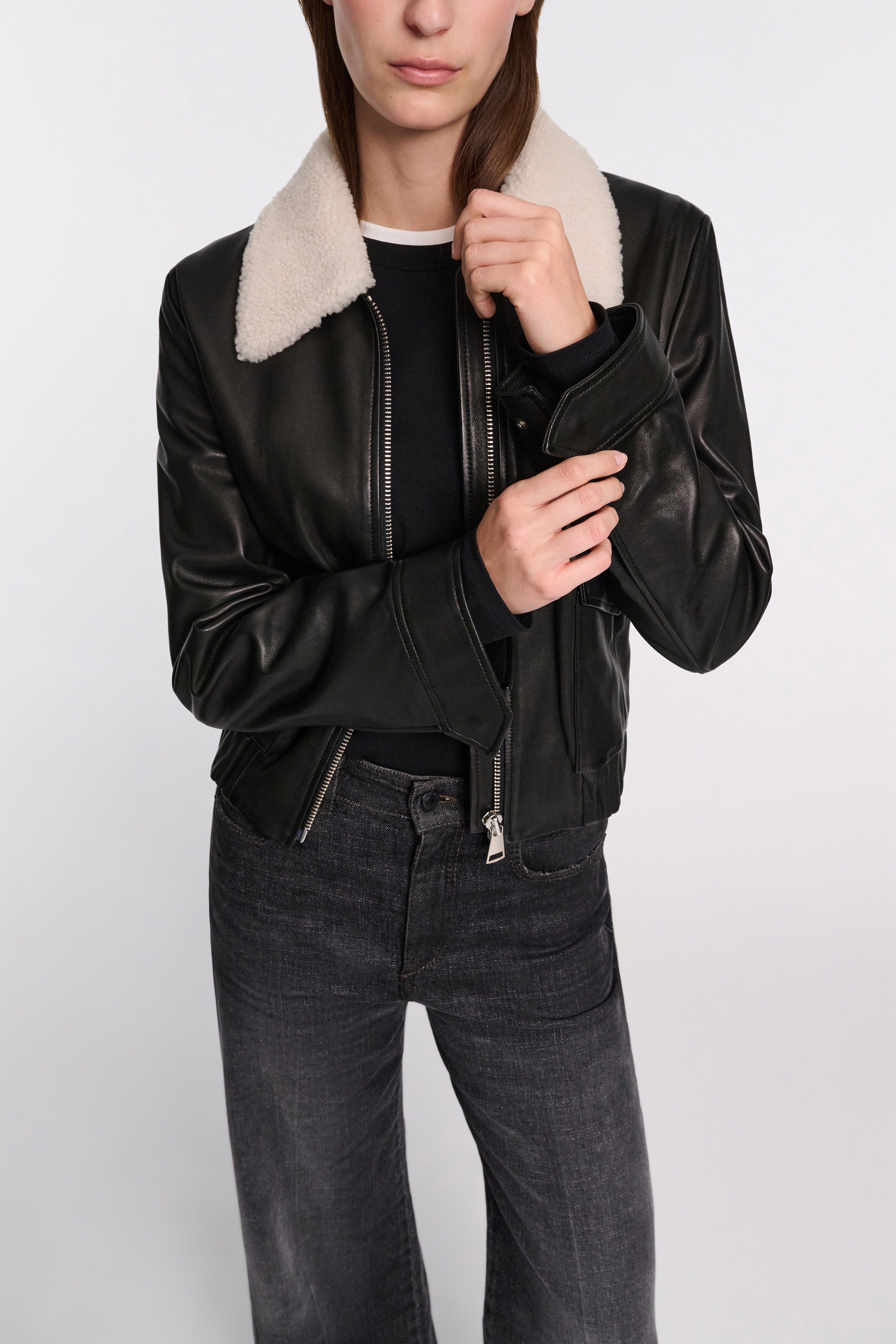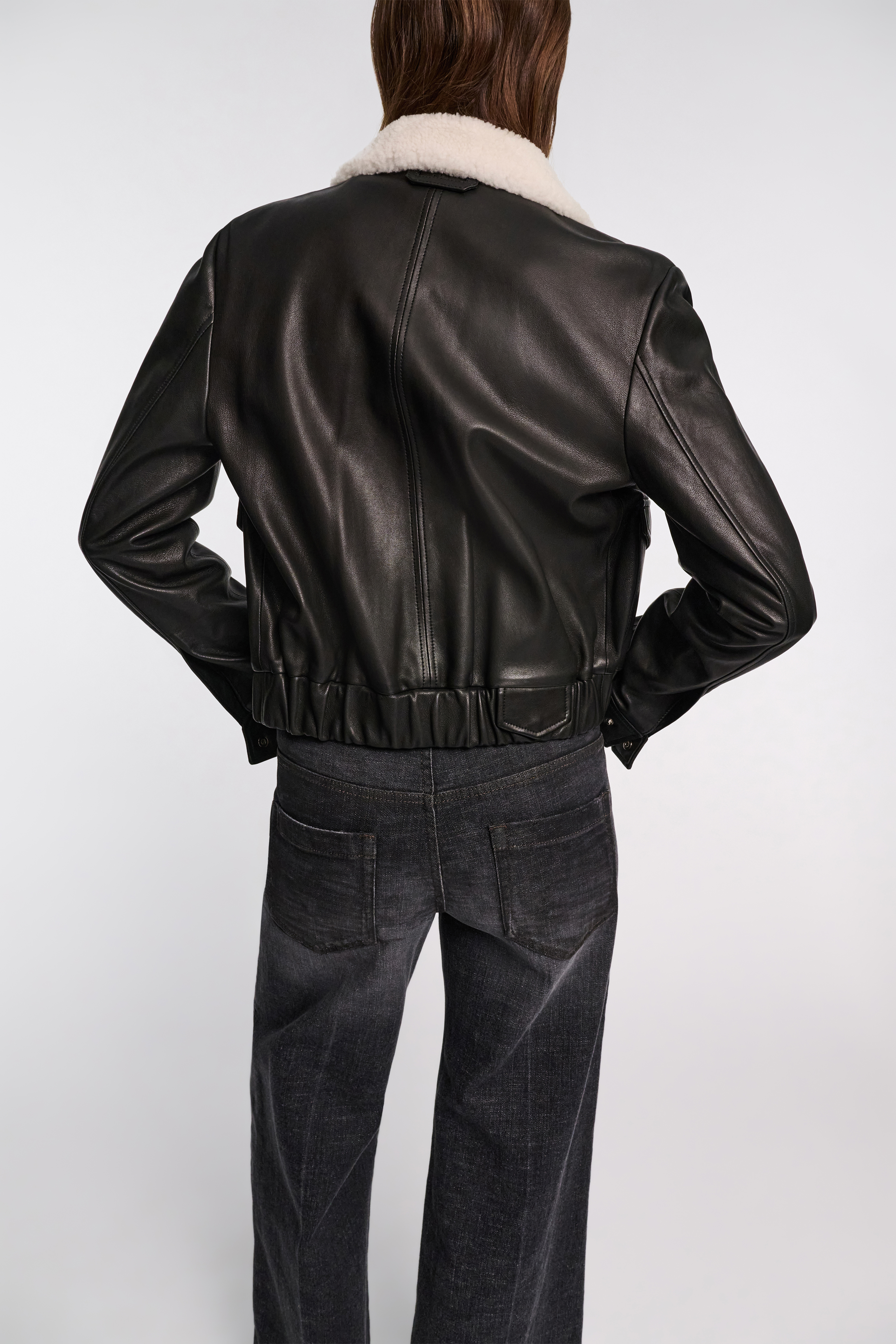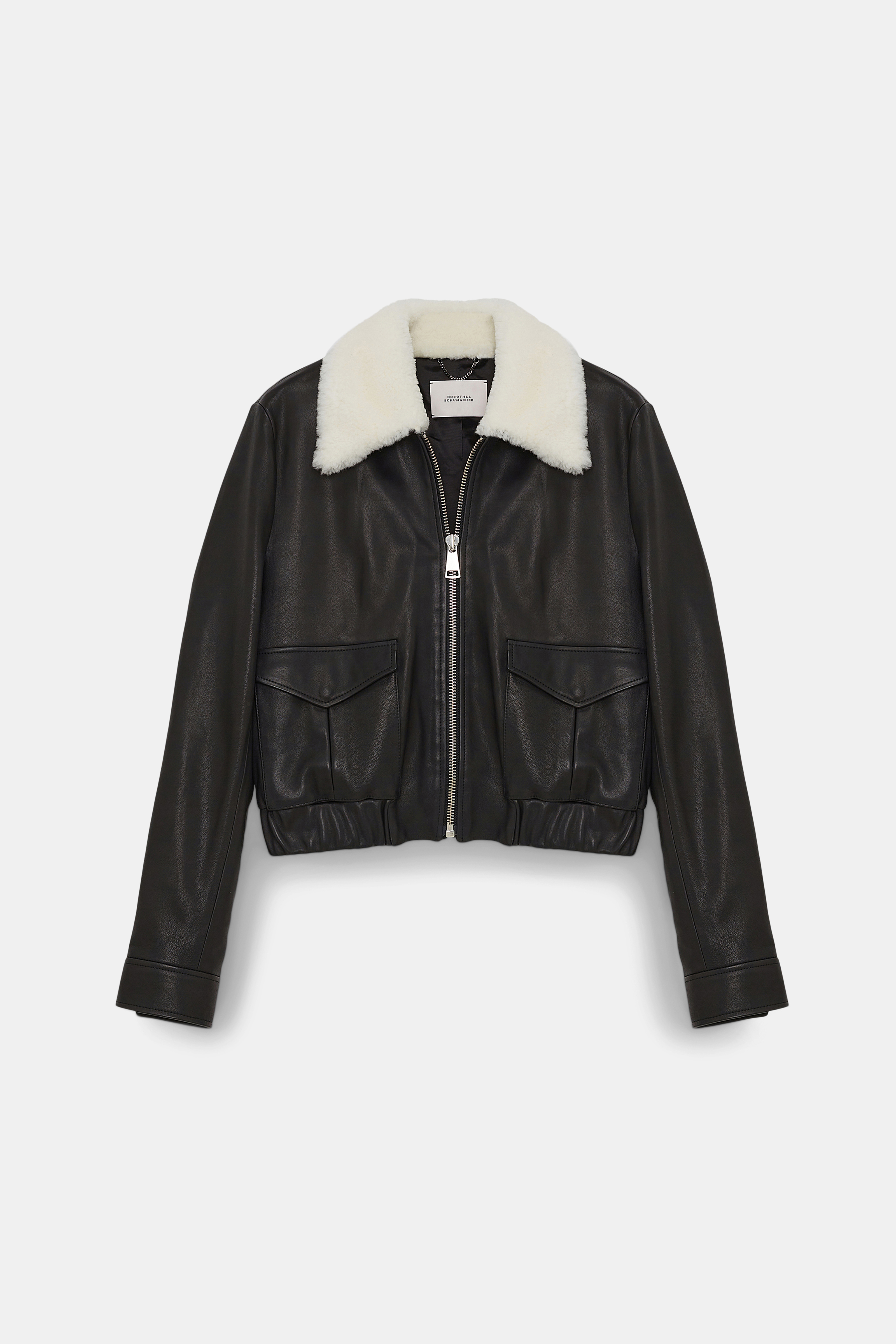 Crafted from soft lambskin, the leather jacket has a contrast shearling collar and zip front.