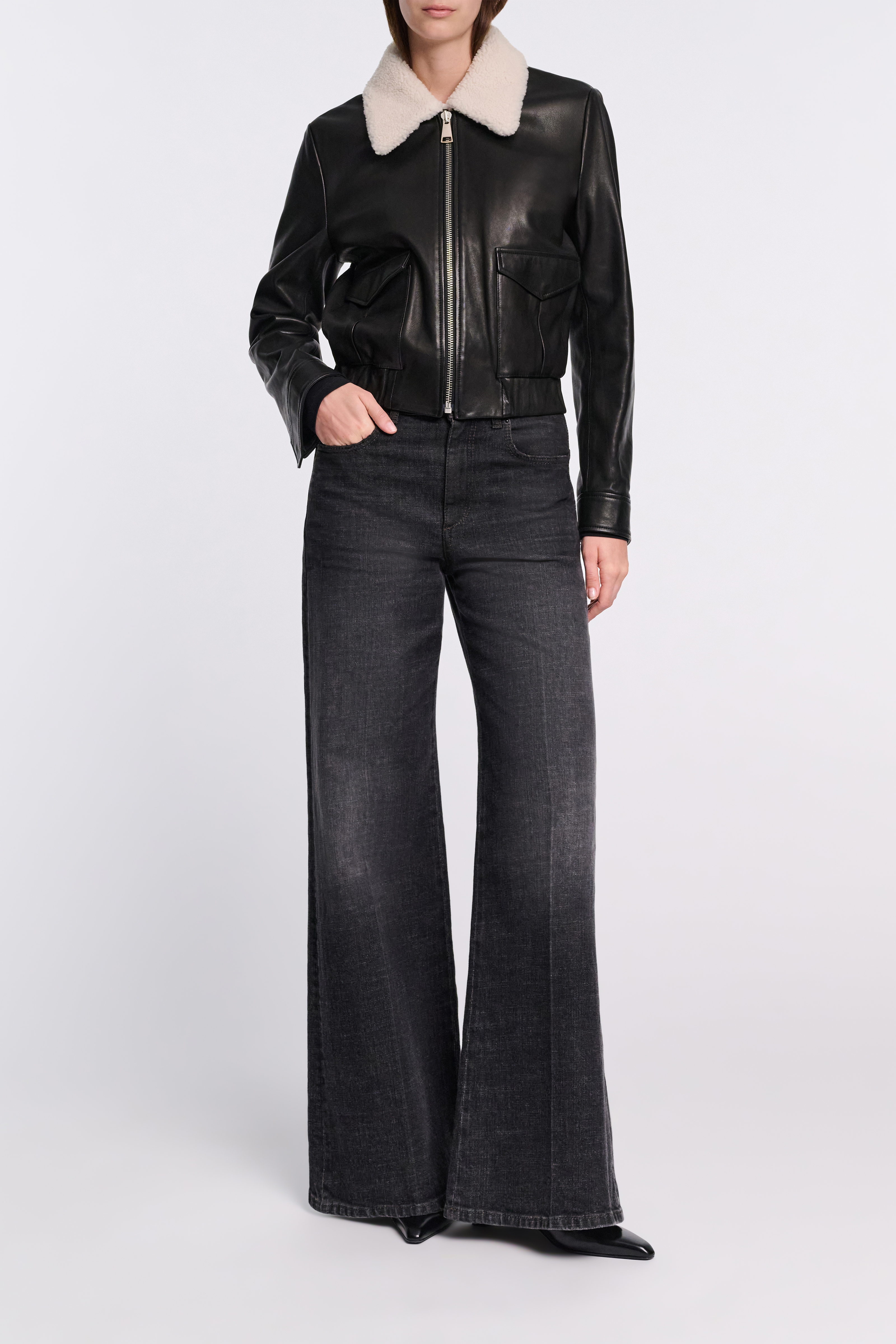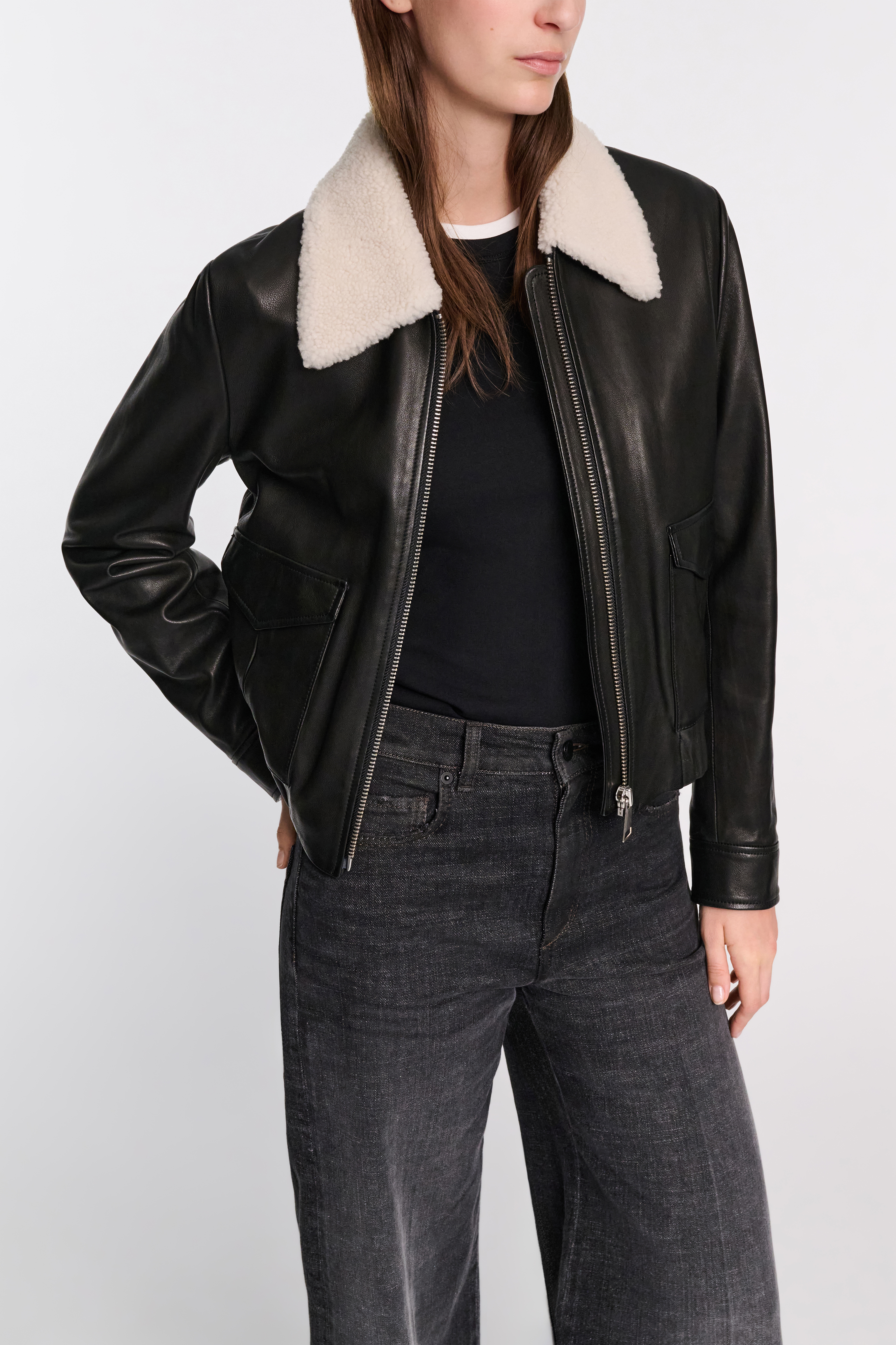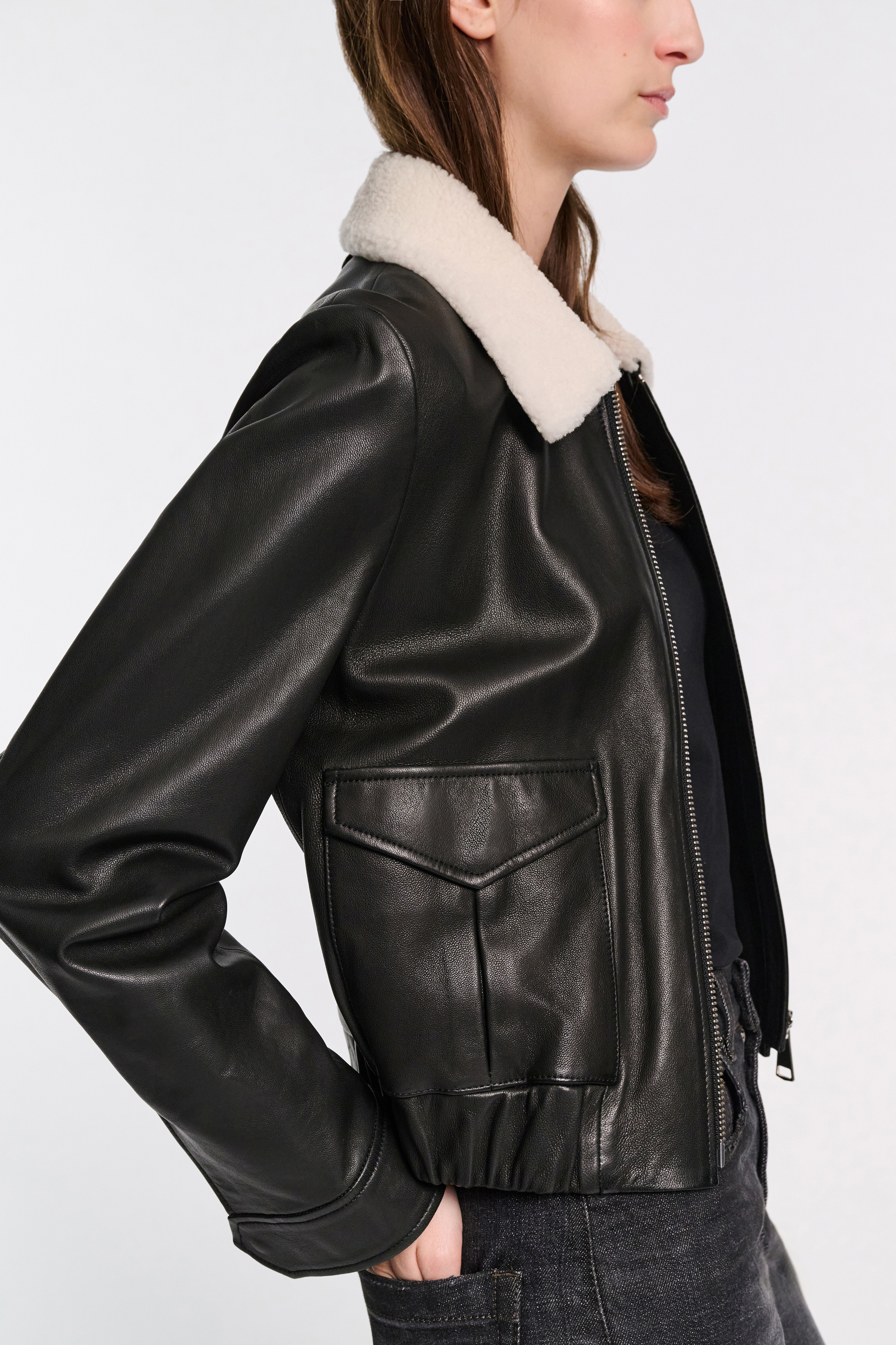 Crafted from soft lambskin, the leather jacket has a contrast shearling collar and zip front.