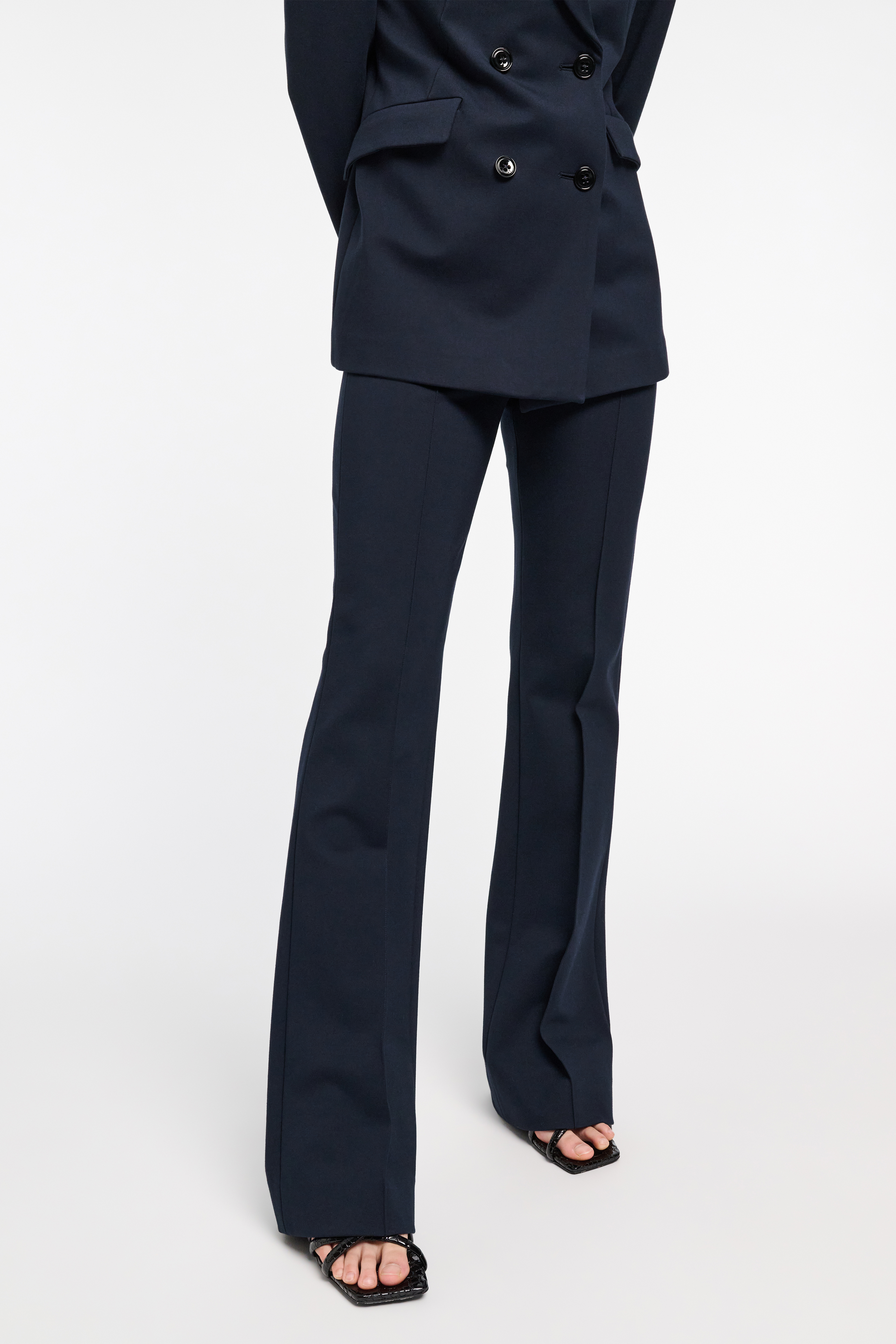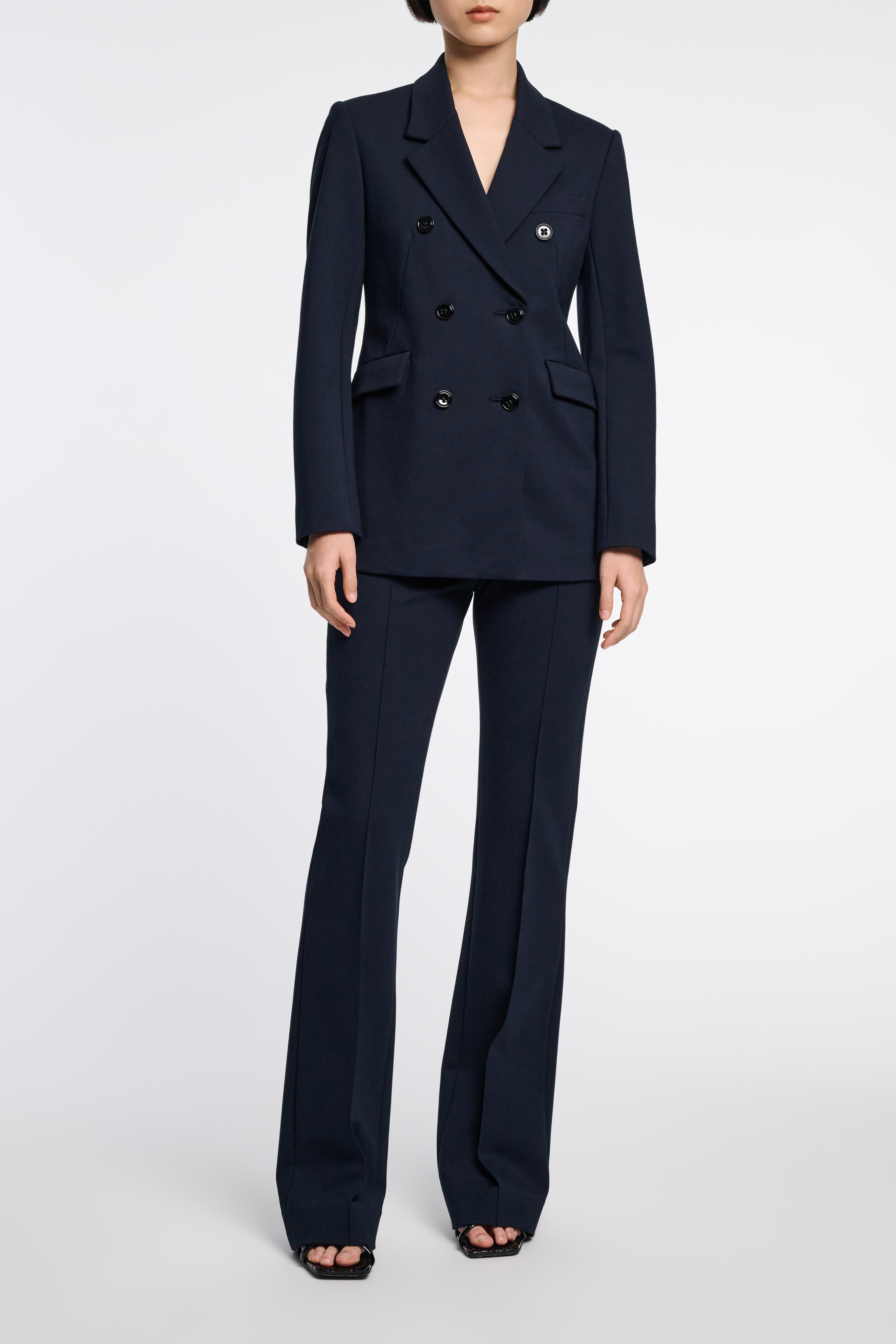 The flared pants are crafted in Punto Milano and have pintucks on the front.