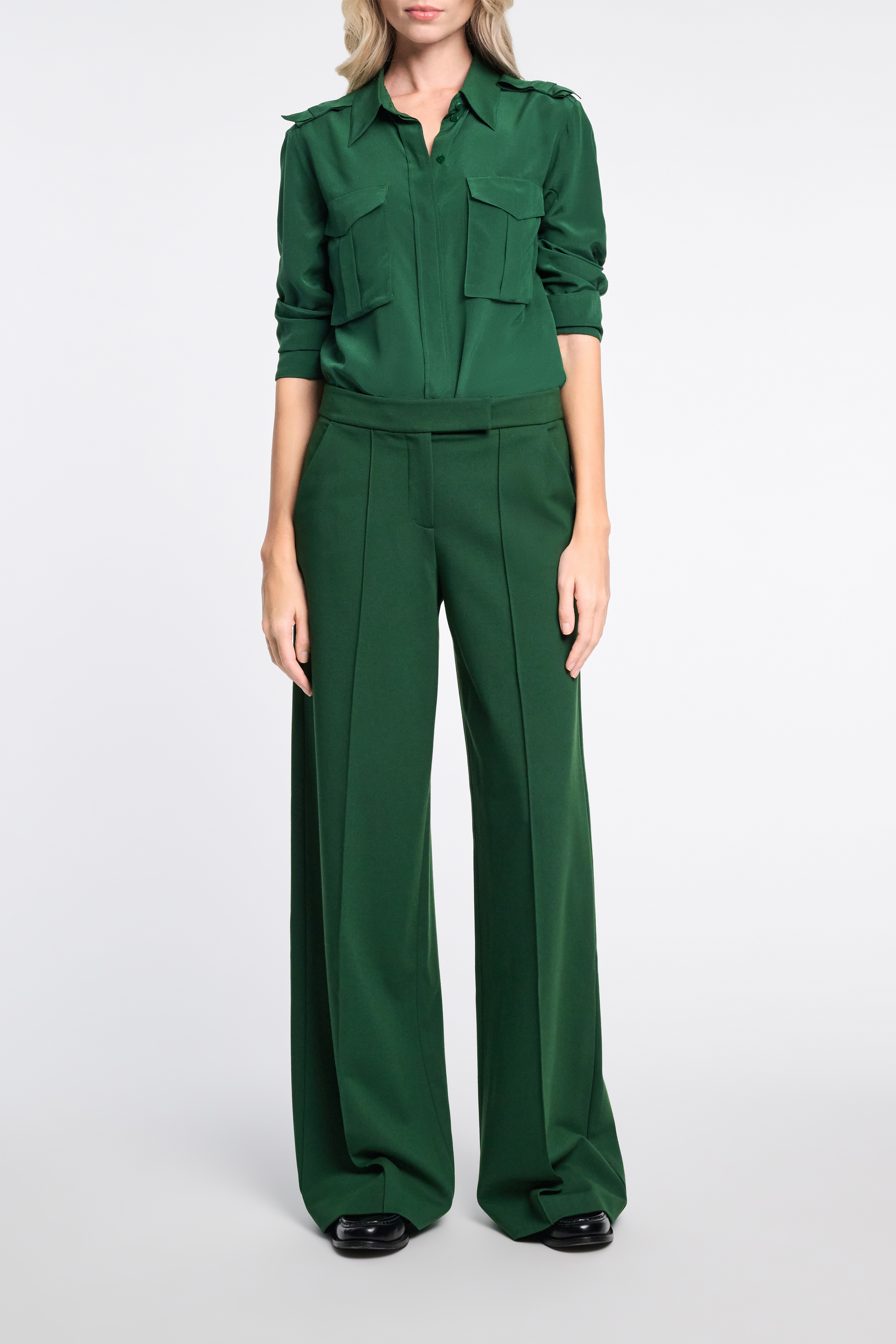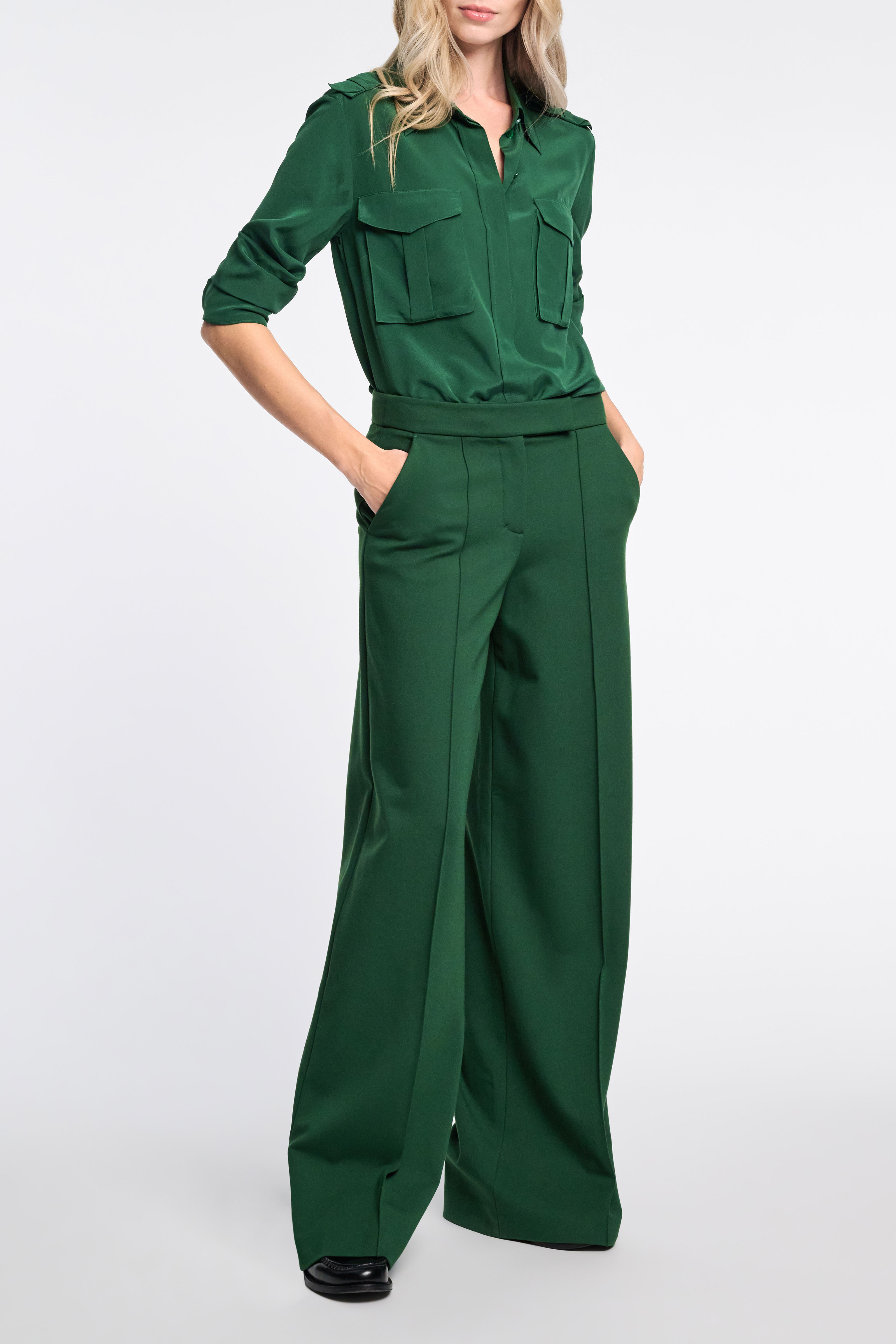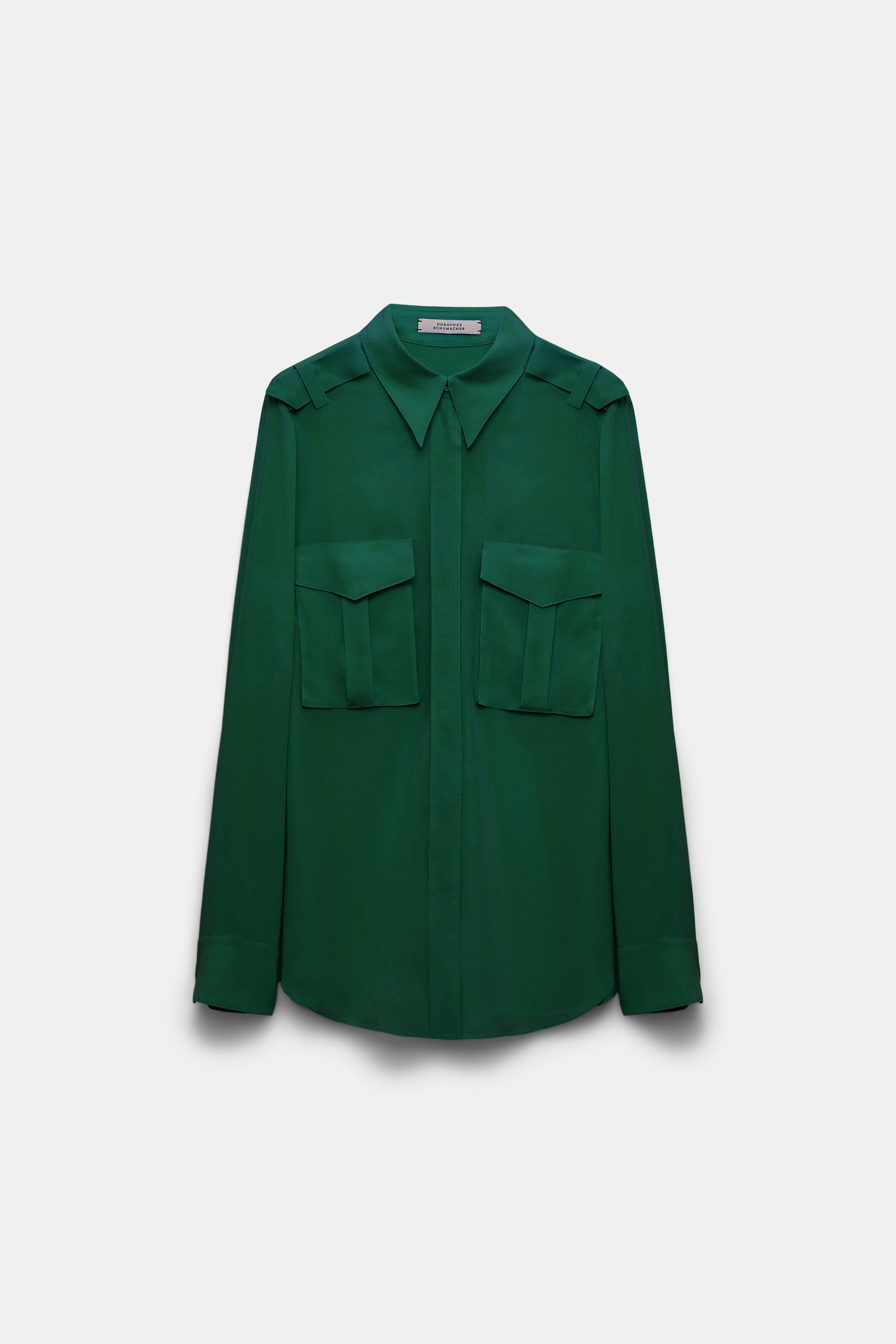 The crêpe de chine silk blouse has flap patch pockets and neat epaulettes on the shoulders.