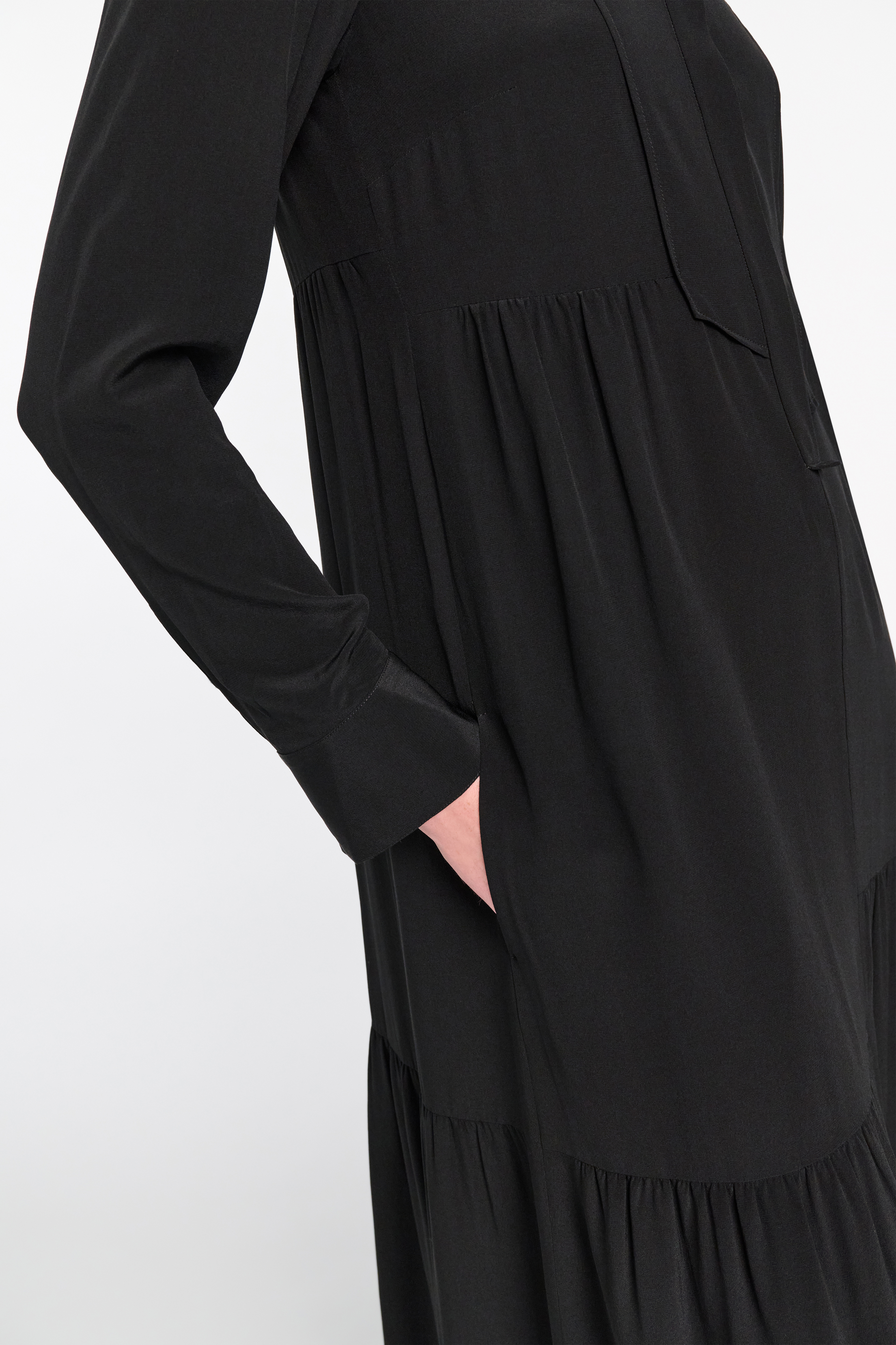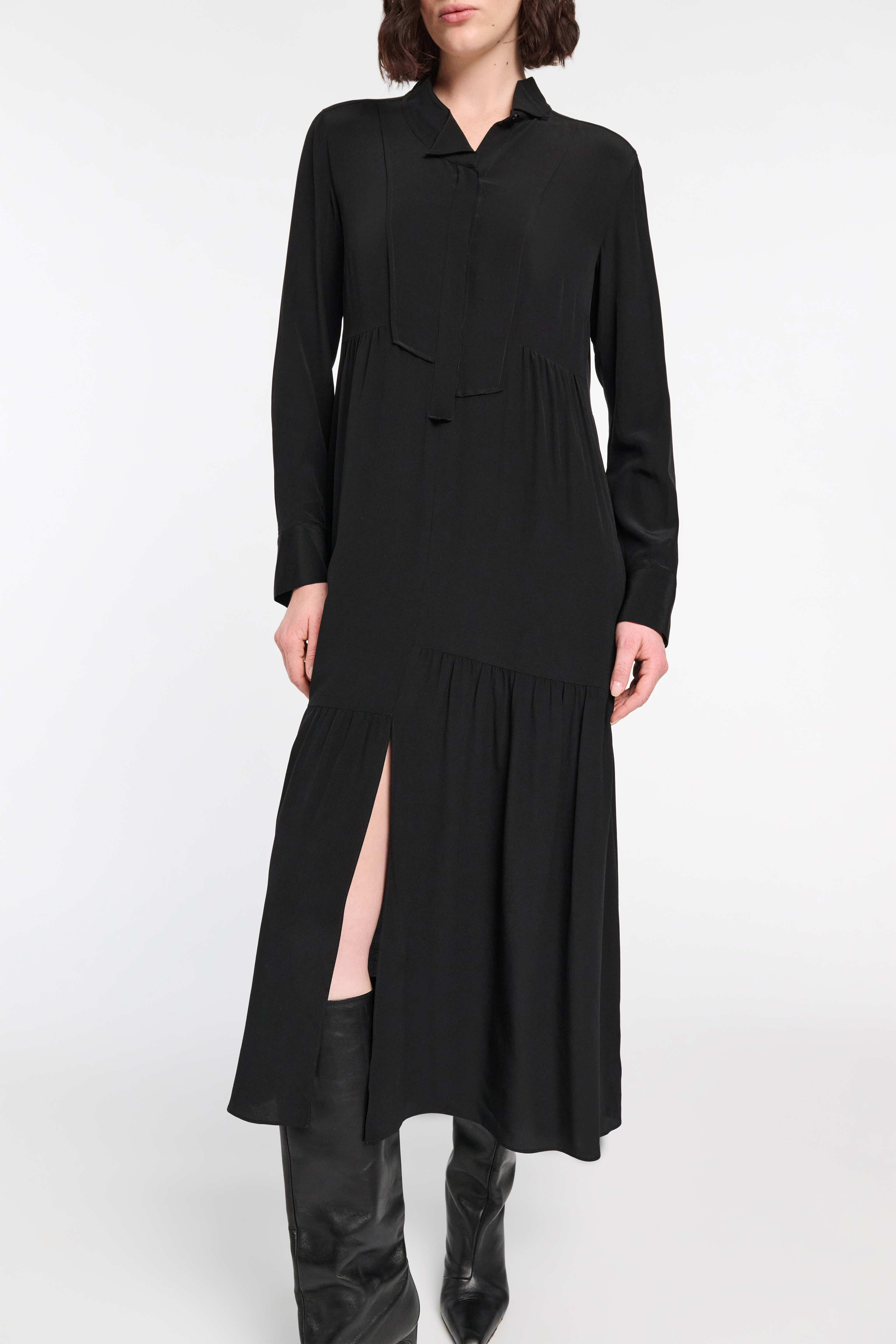 The long sleeve silk dress has an asymmetrical crêpe de chine collar and plastron.