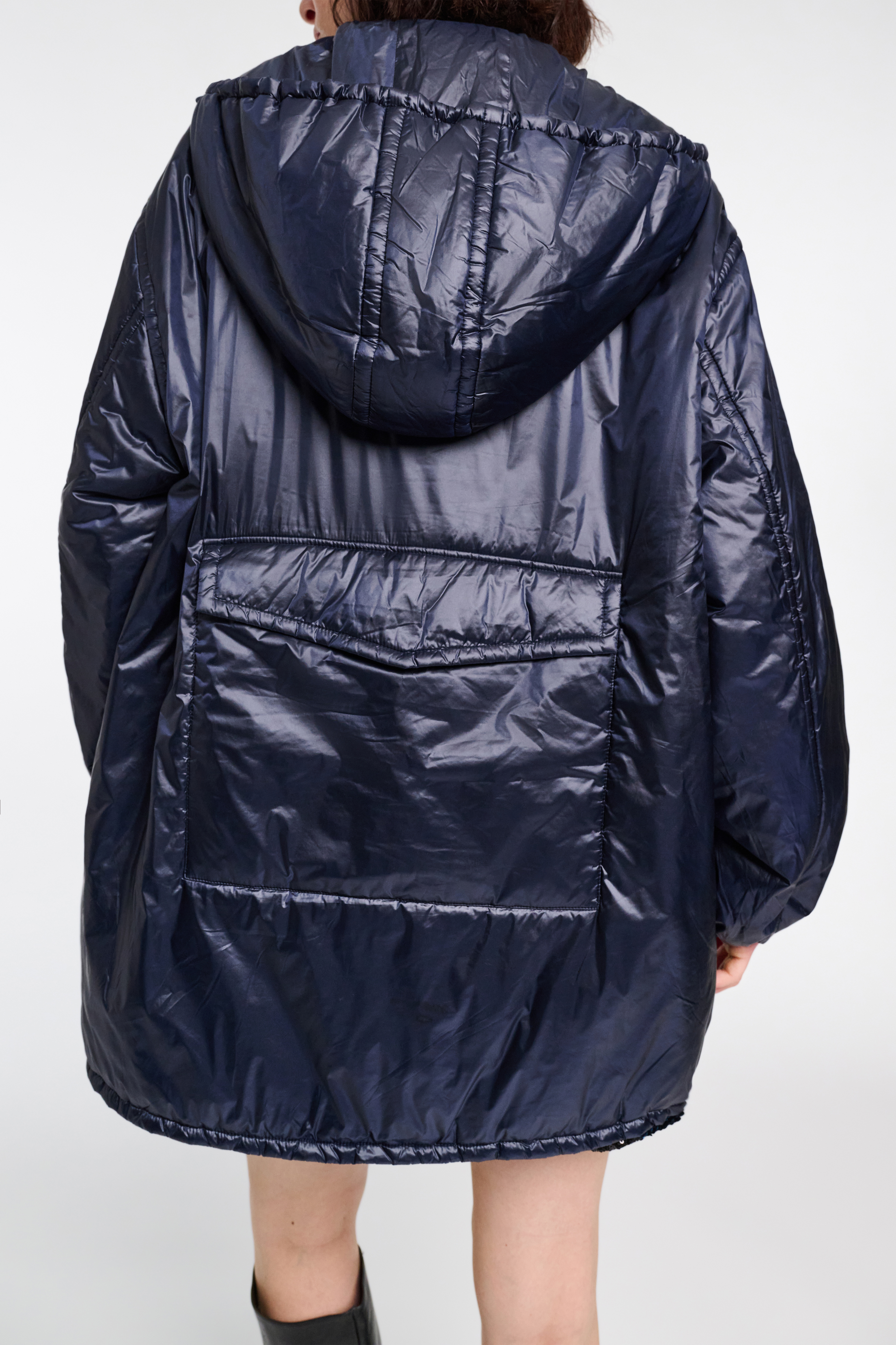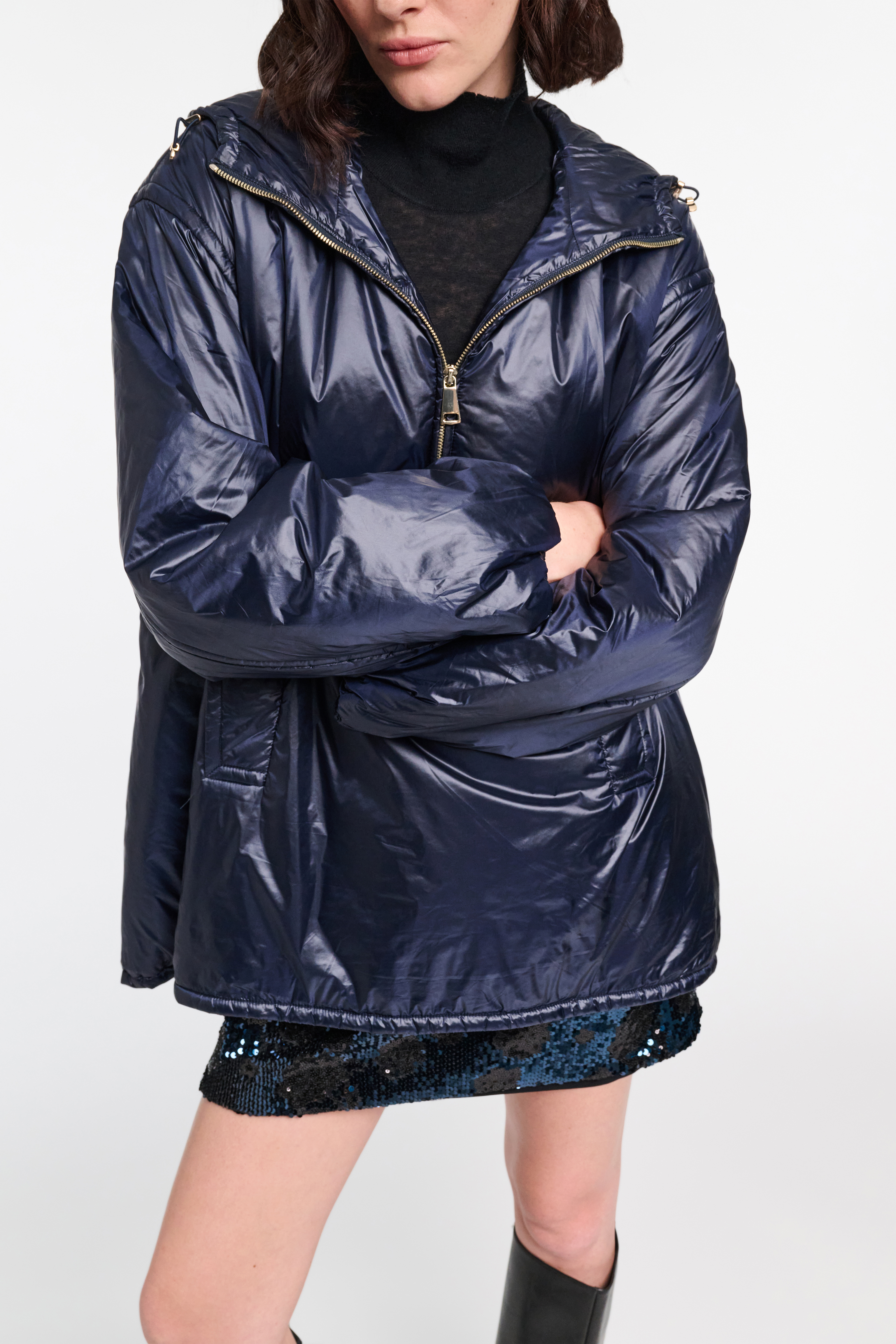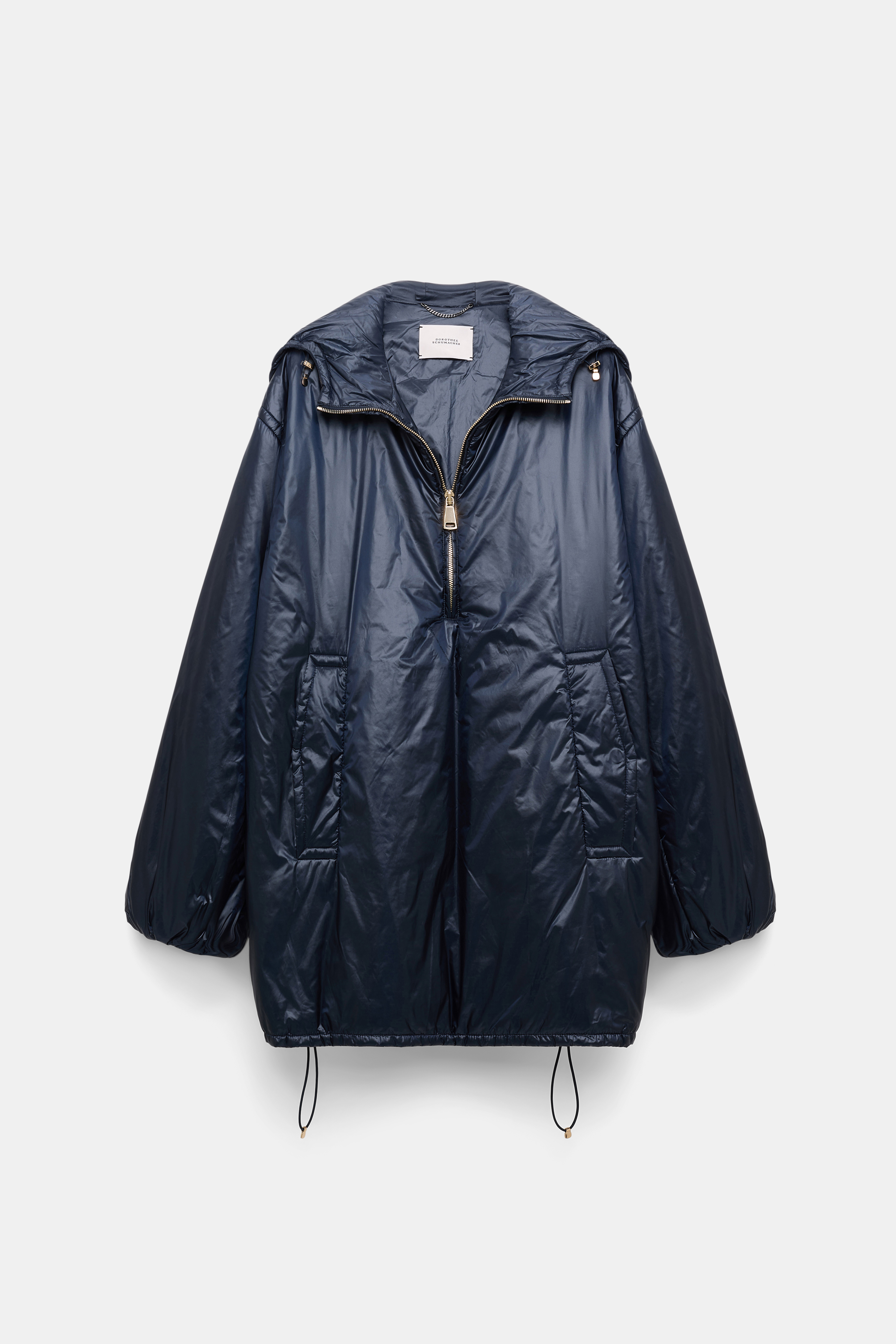 The jacket is slightly oversized and has a drawstring hood and hem.
