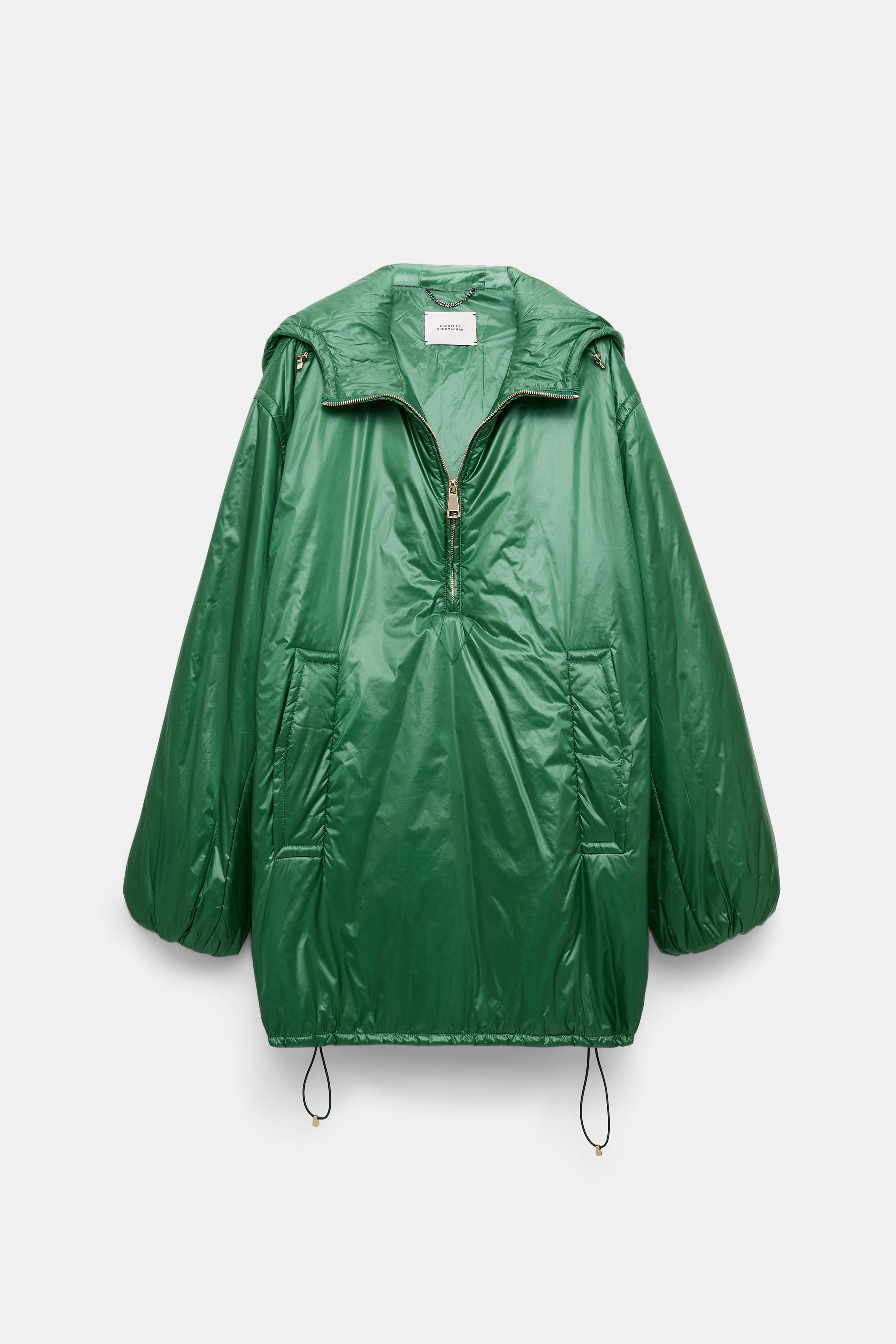 The jacket is slightly oversized and has a drawstring hood and hem.