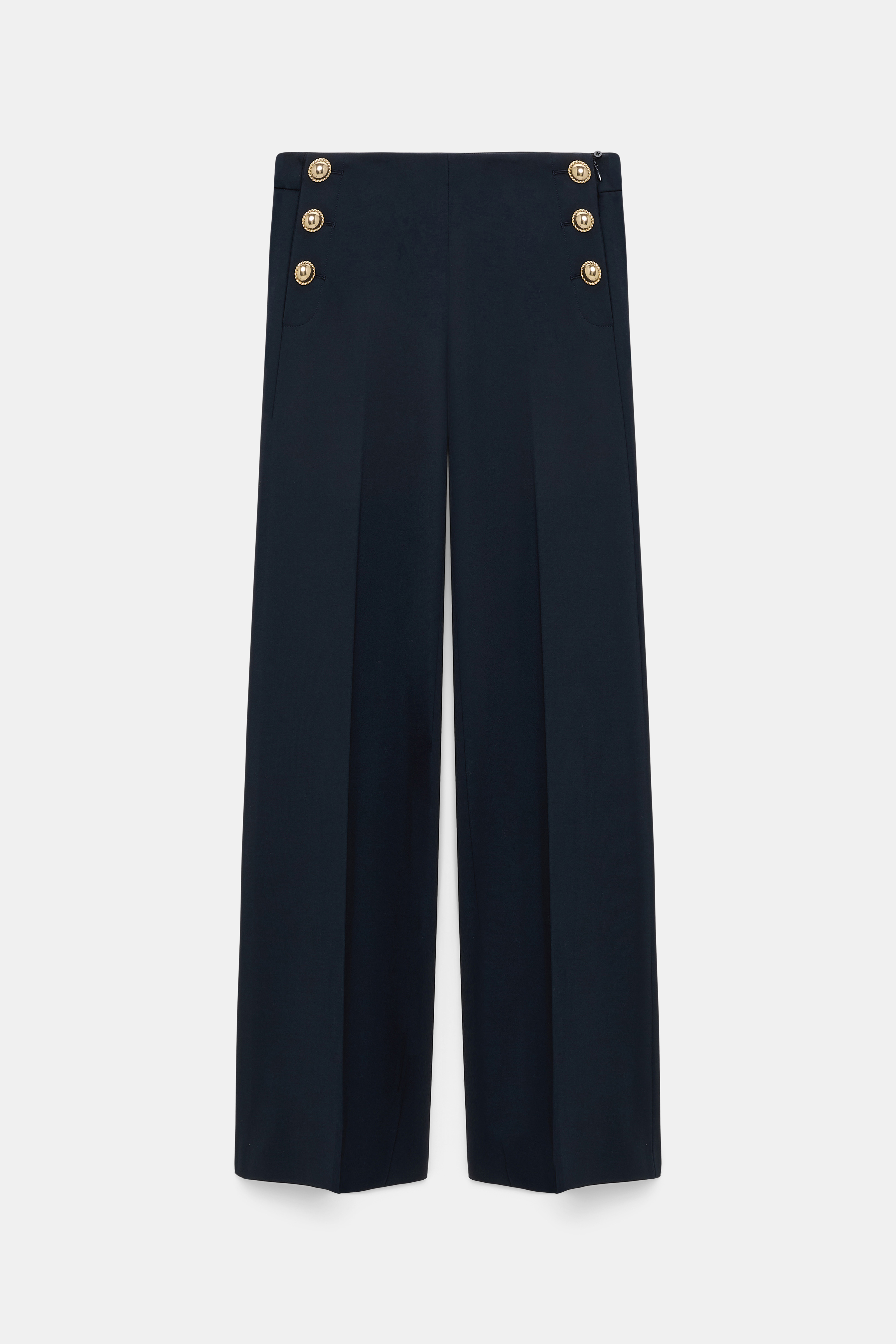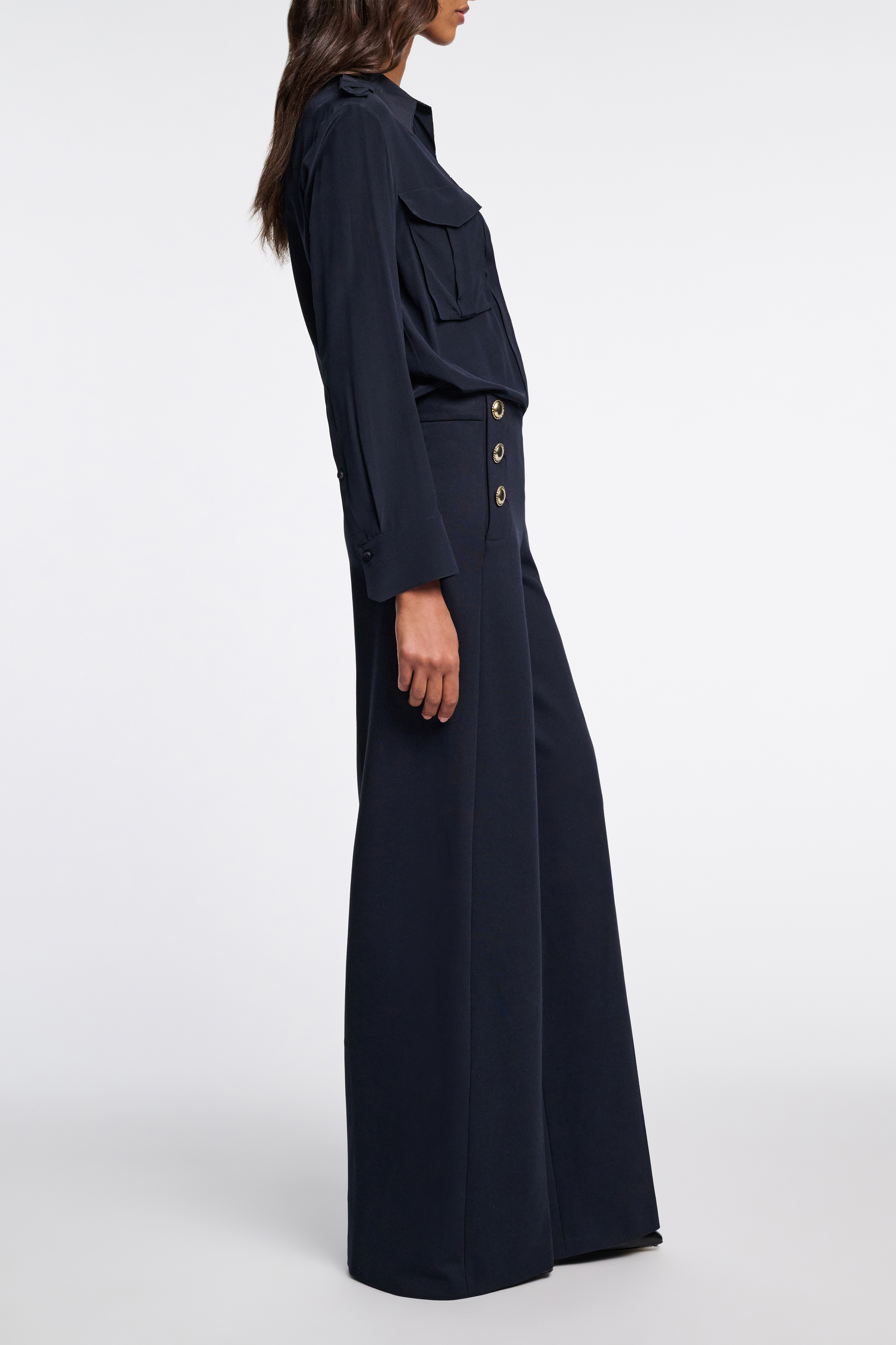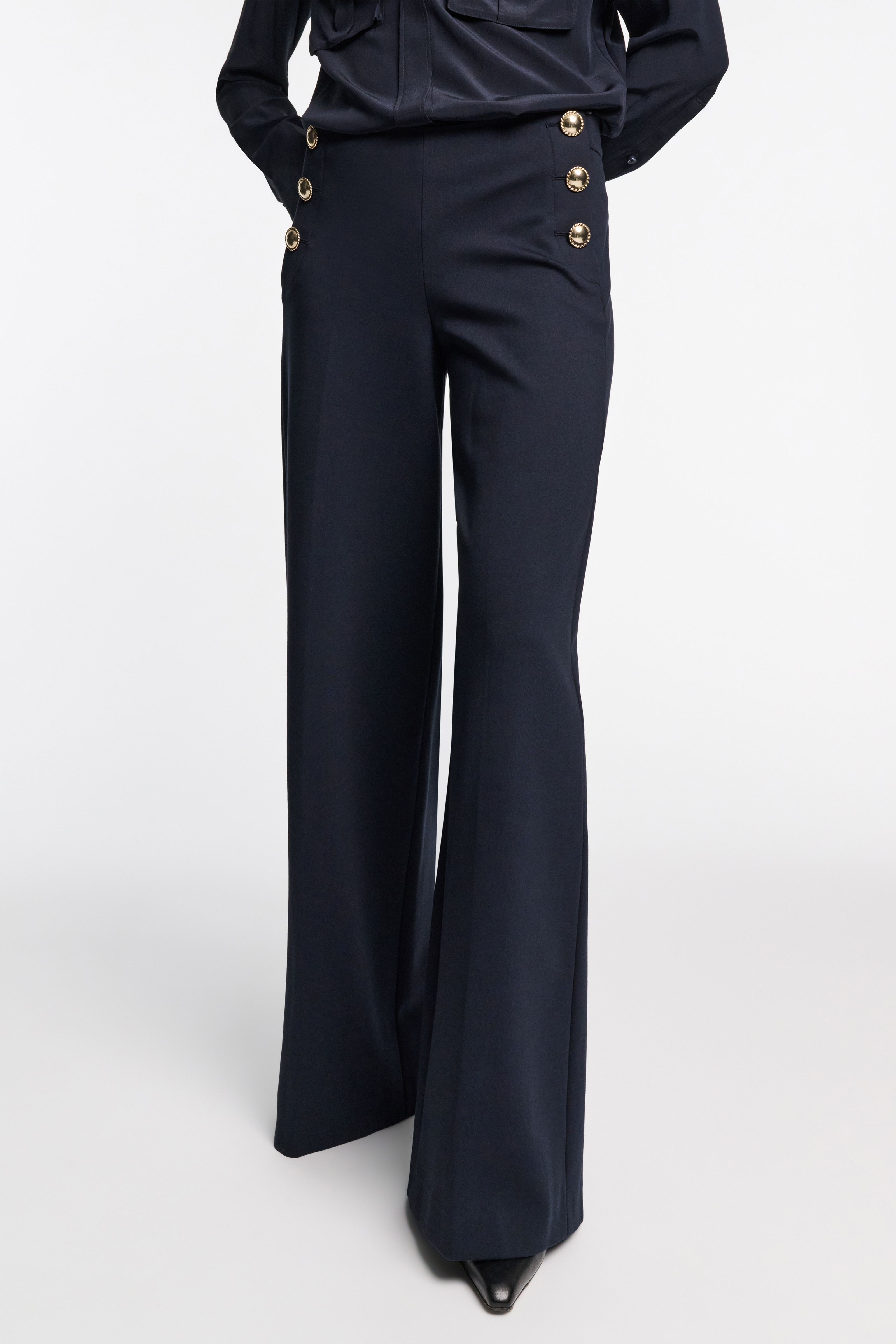 The wide leg sailor pants have decorative gold-tone buttons and are crafted in our favorite Punto Milano.Please note that this style comes with an unfinished hemline so you can custom tailor to your desired length.