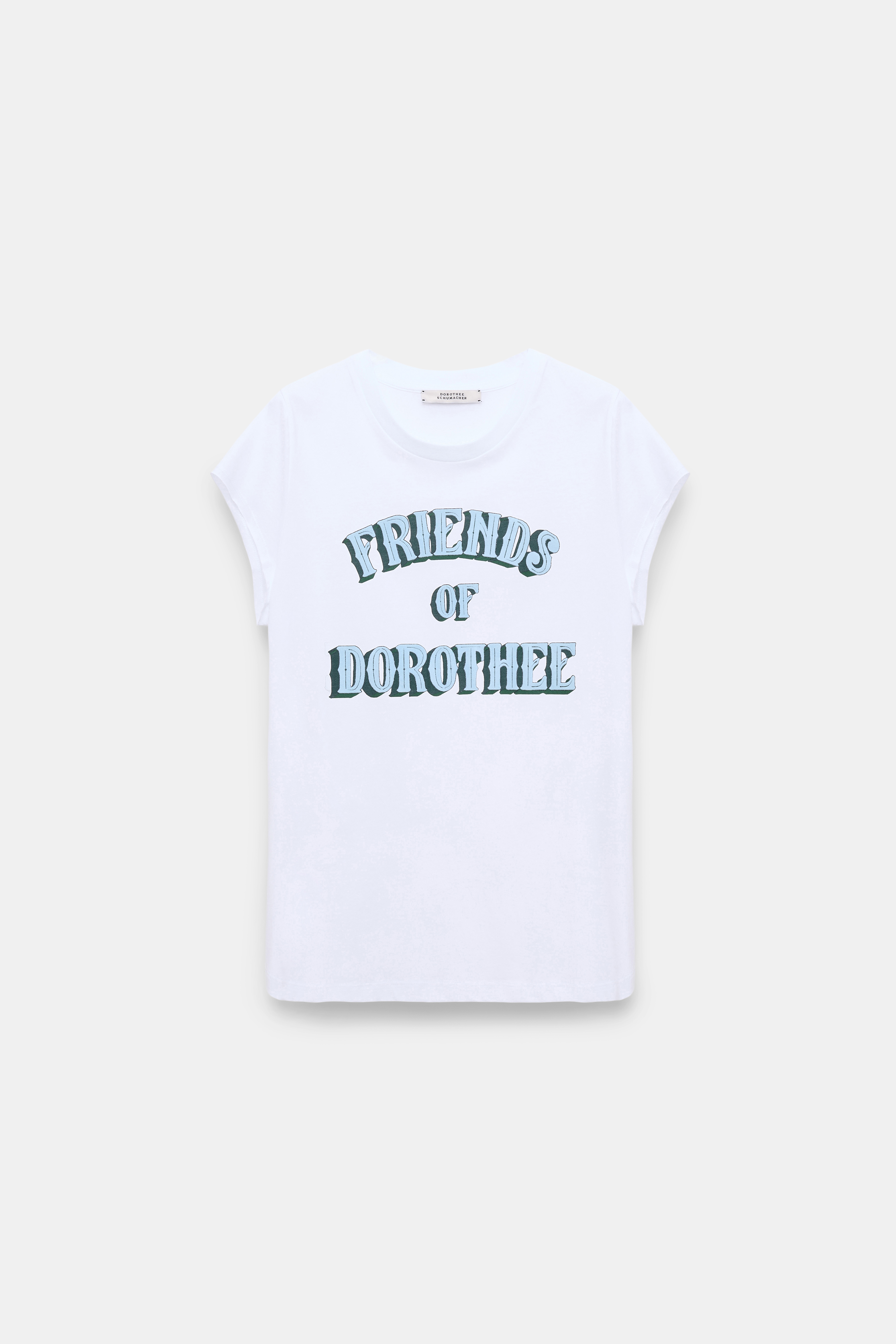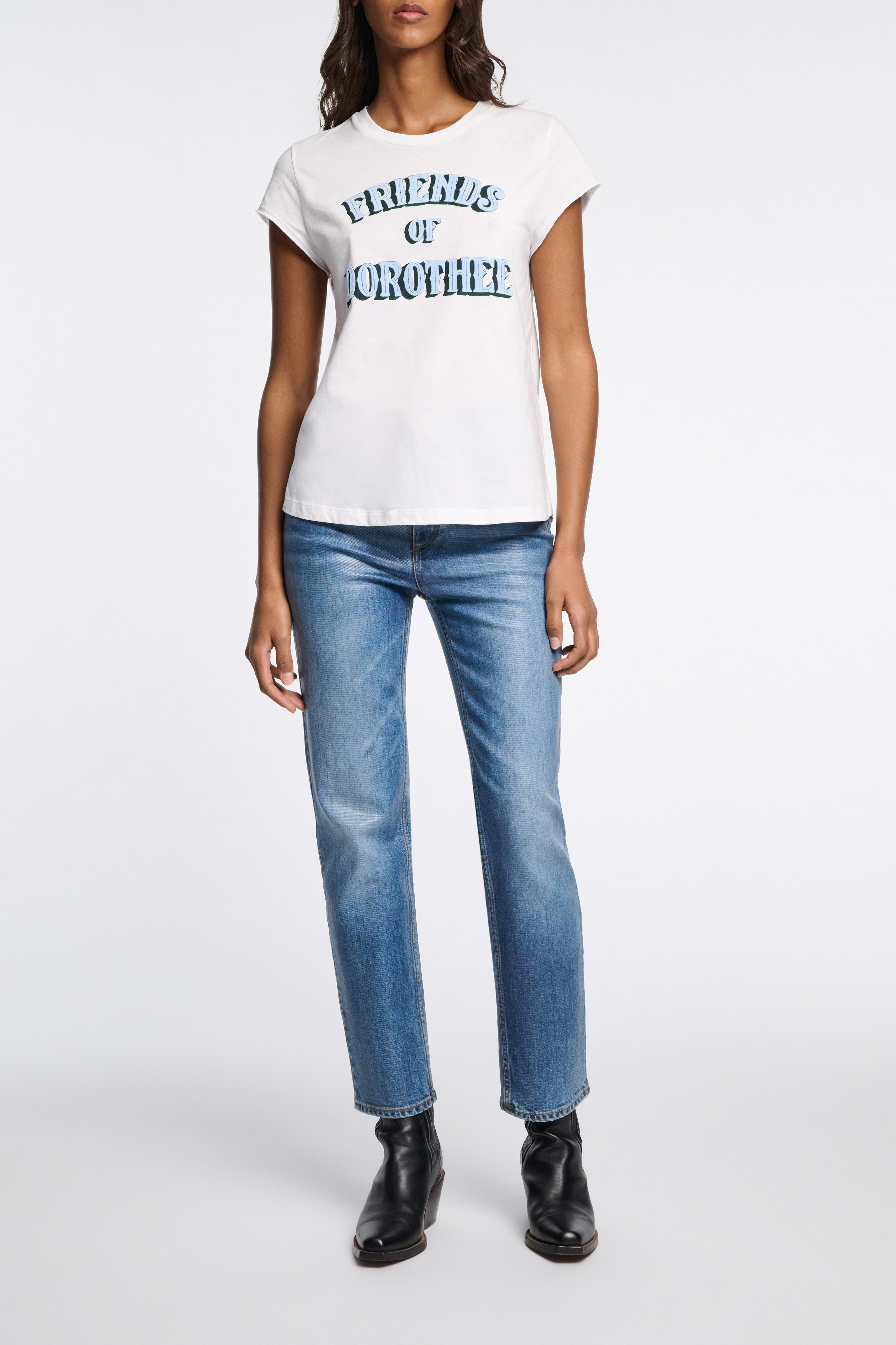 The cotton T-shirt has a lettered print on the front, which is inked and flocked for velvety texture.