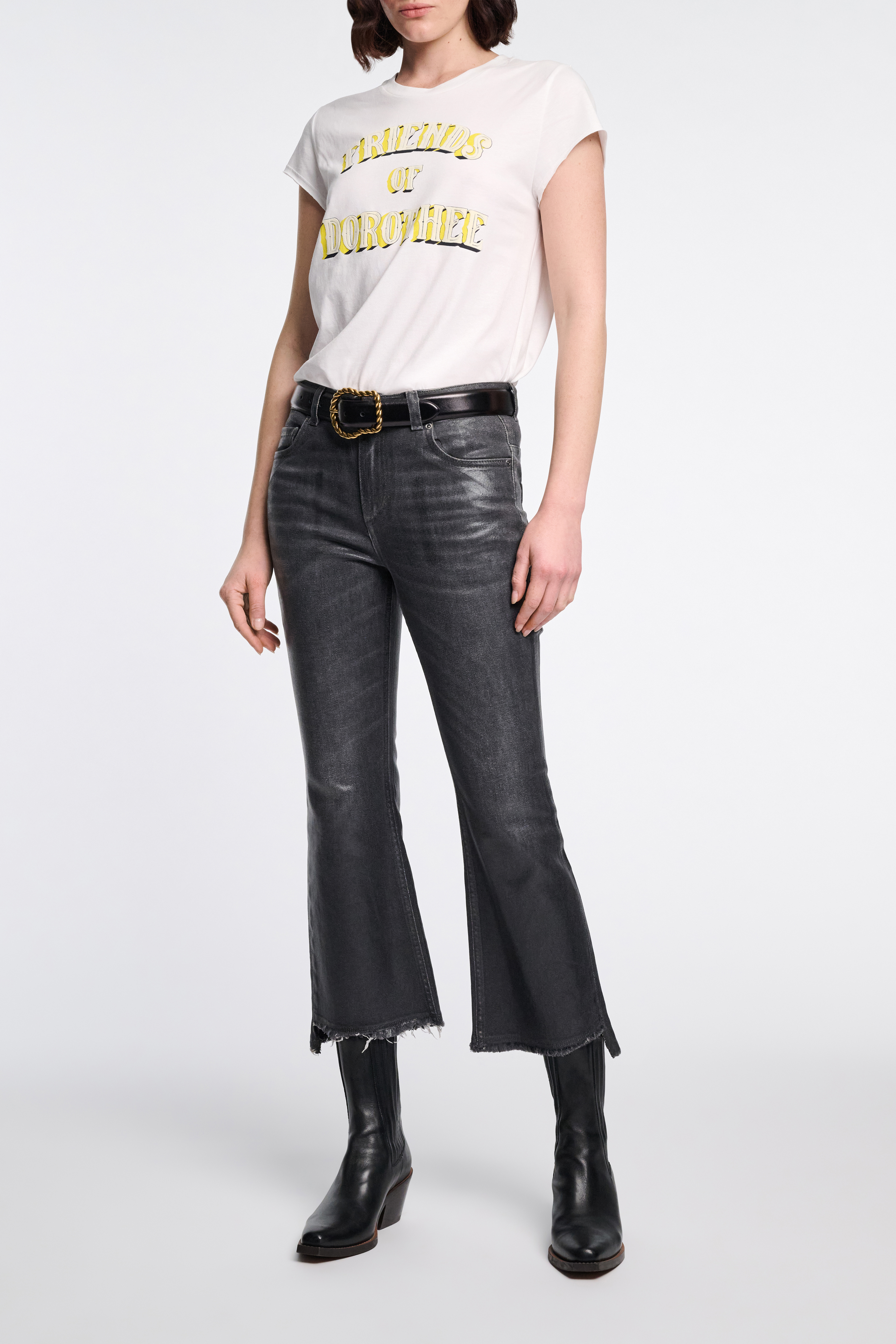 The cotton T-shirt has a lettered print on the front, which is inked and flocked for velvety texture.