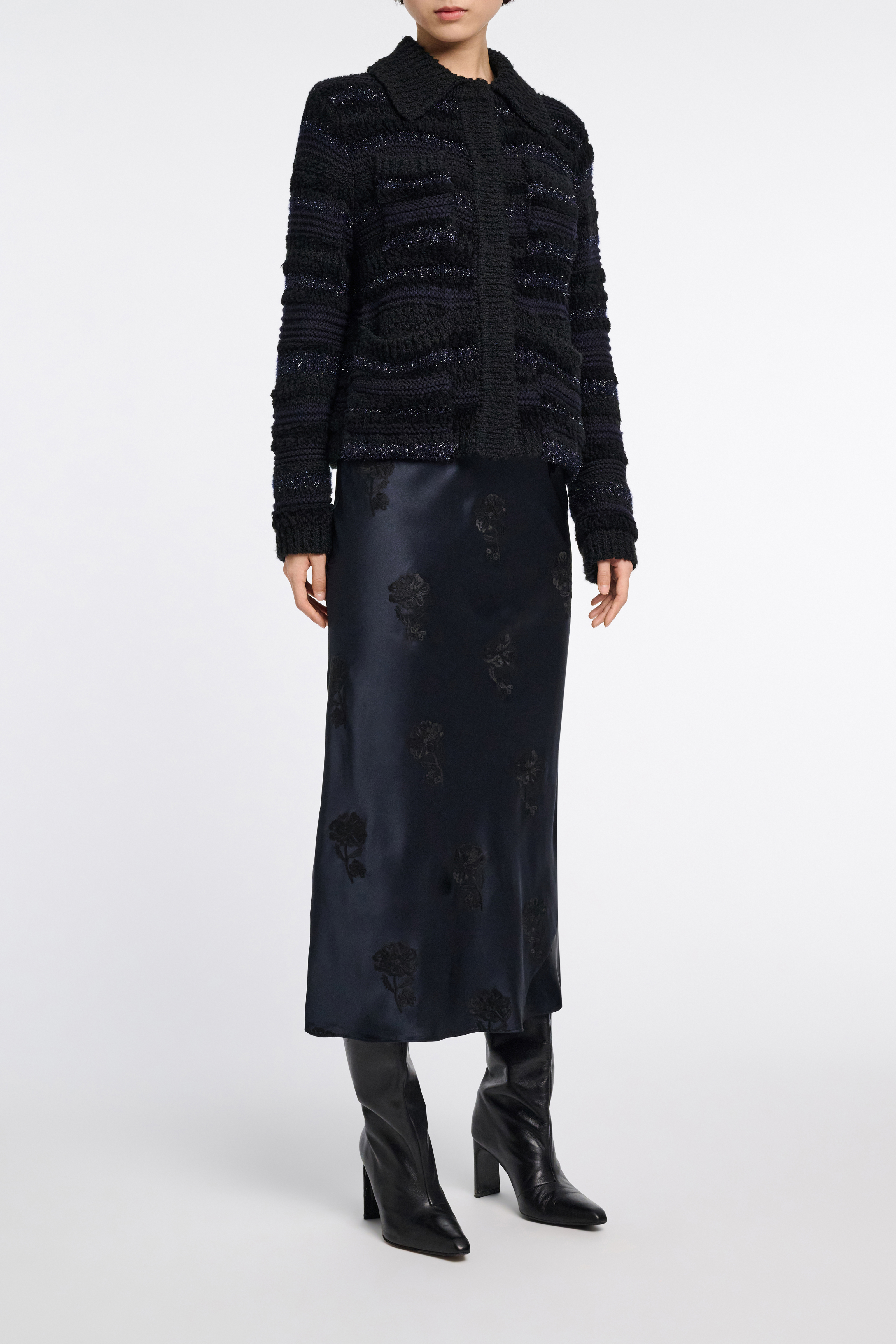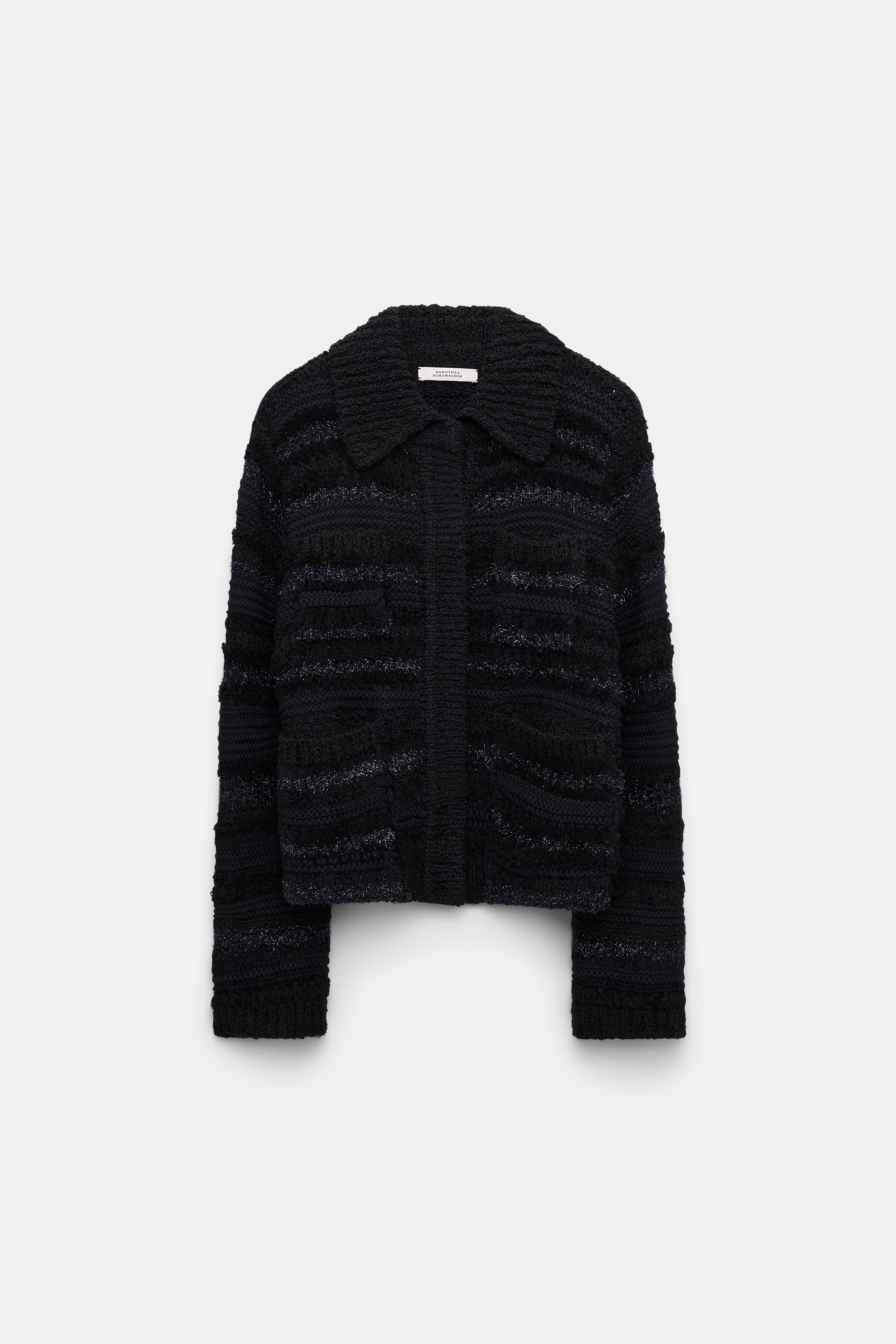 The cropped cardigan-jacket is knit with a tonal mix of textured and shimmering stripes.
