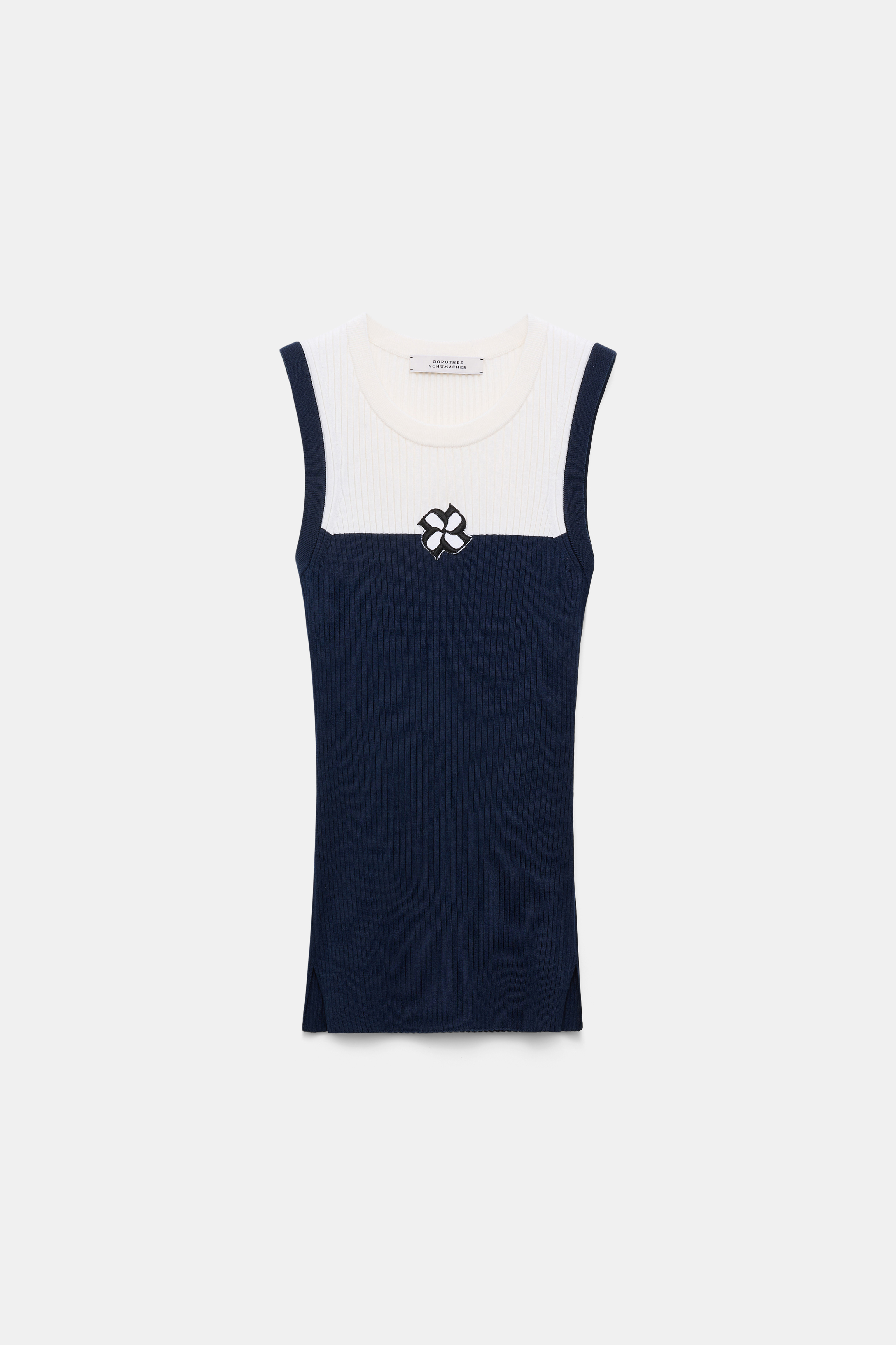 The round neck shell is made from a stretchy ribbed wool-silk blend and has a white colorblock on the top.