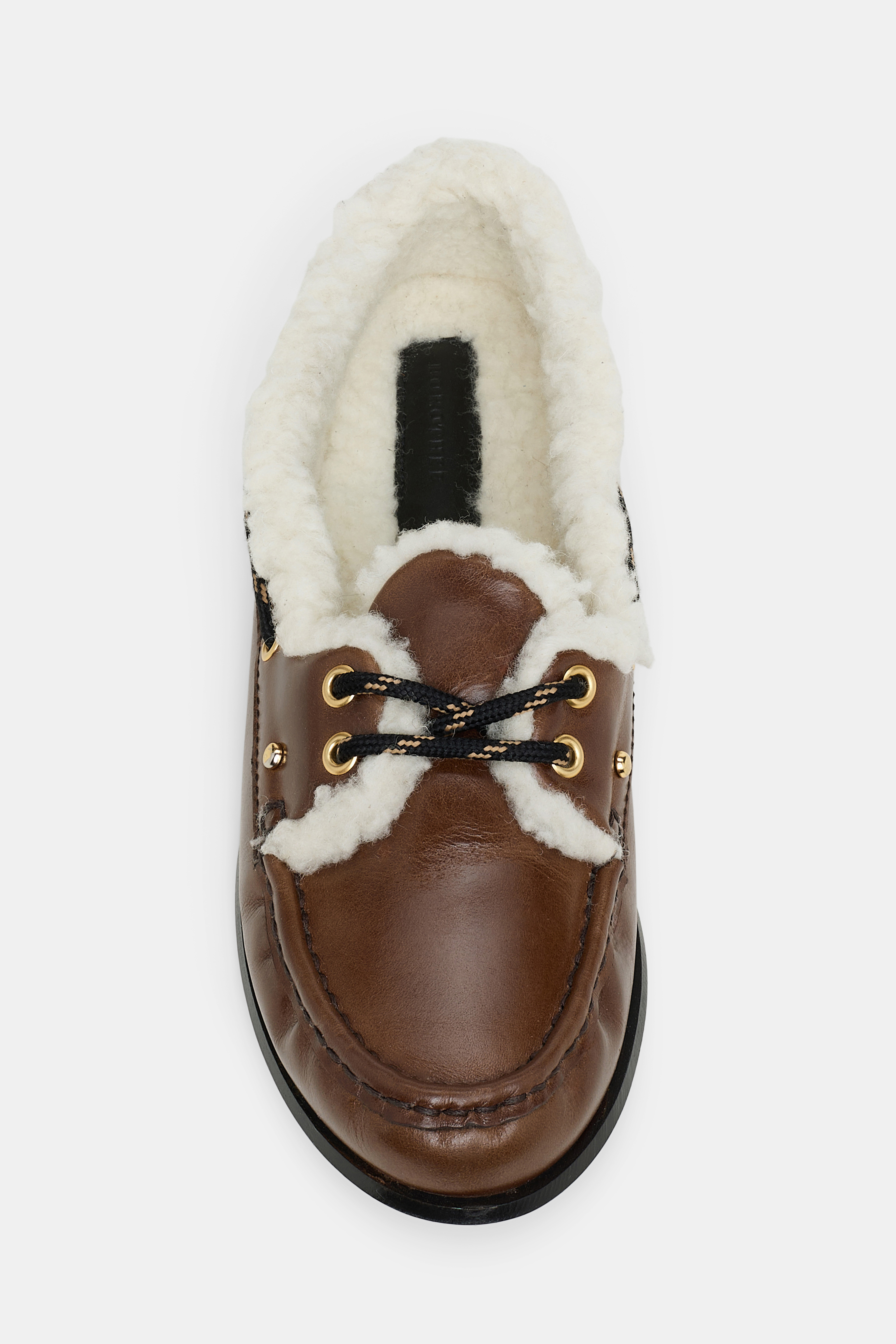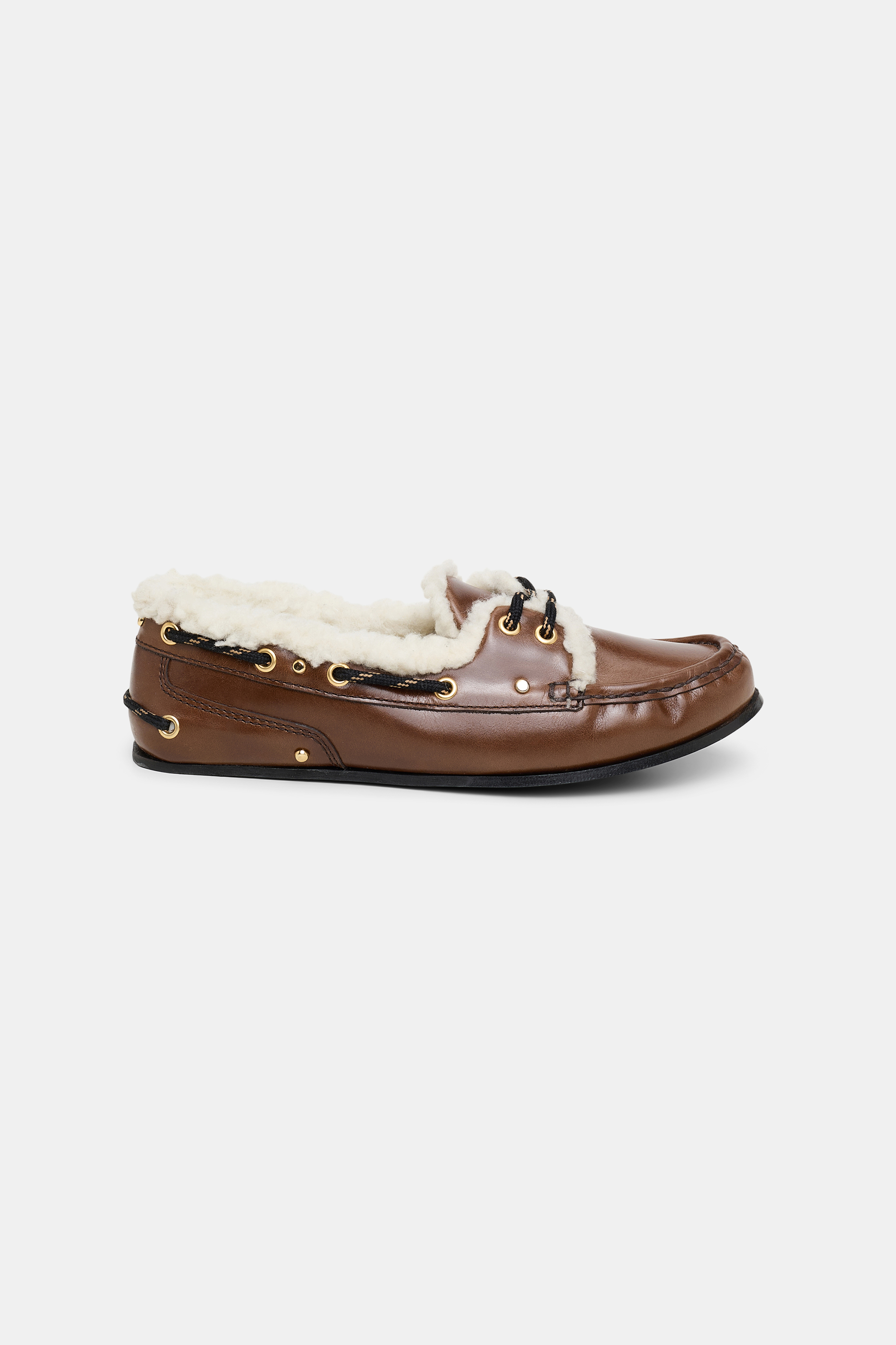 The docksiders are crafted in smooth calfskin and have plush sheepskin lining.