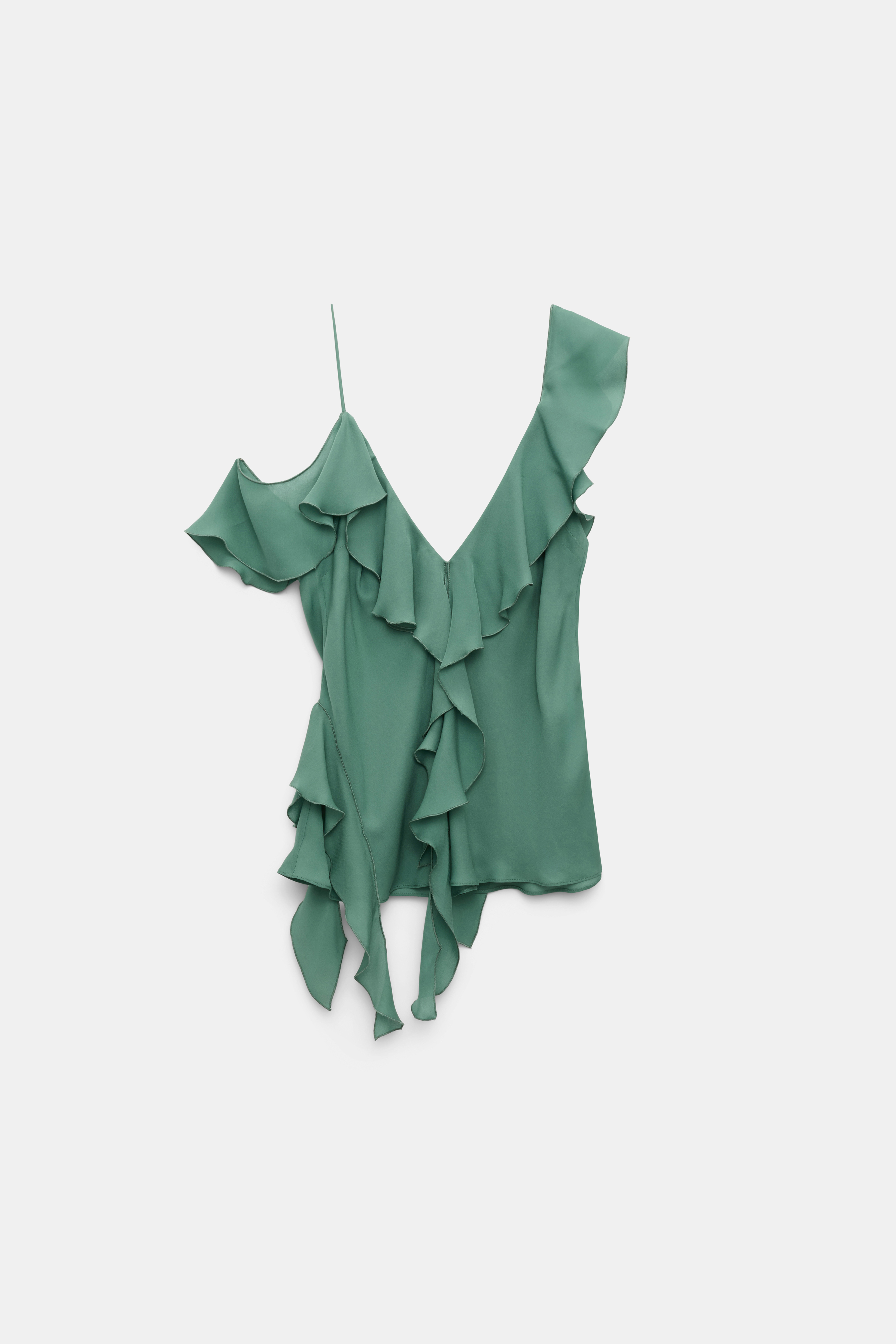 The ruffle top is made from double silk georgette and has spaghetti- and ruffle straps.
