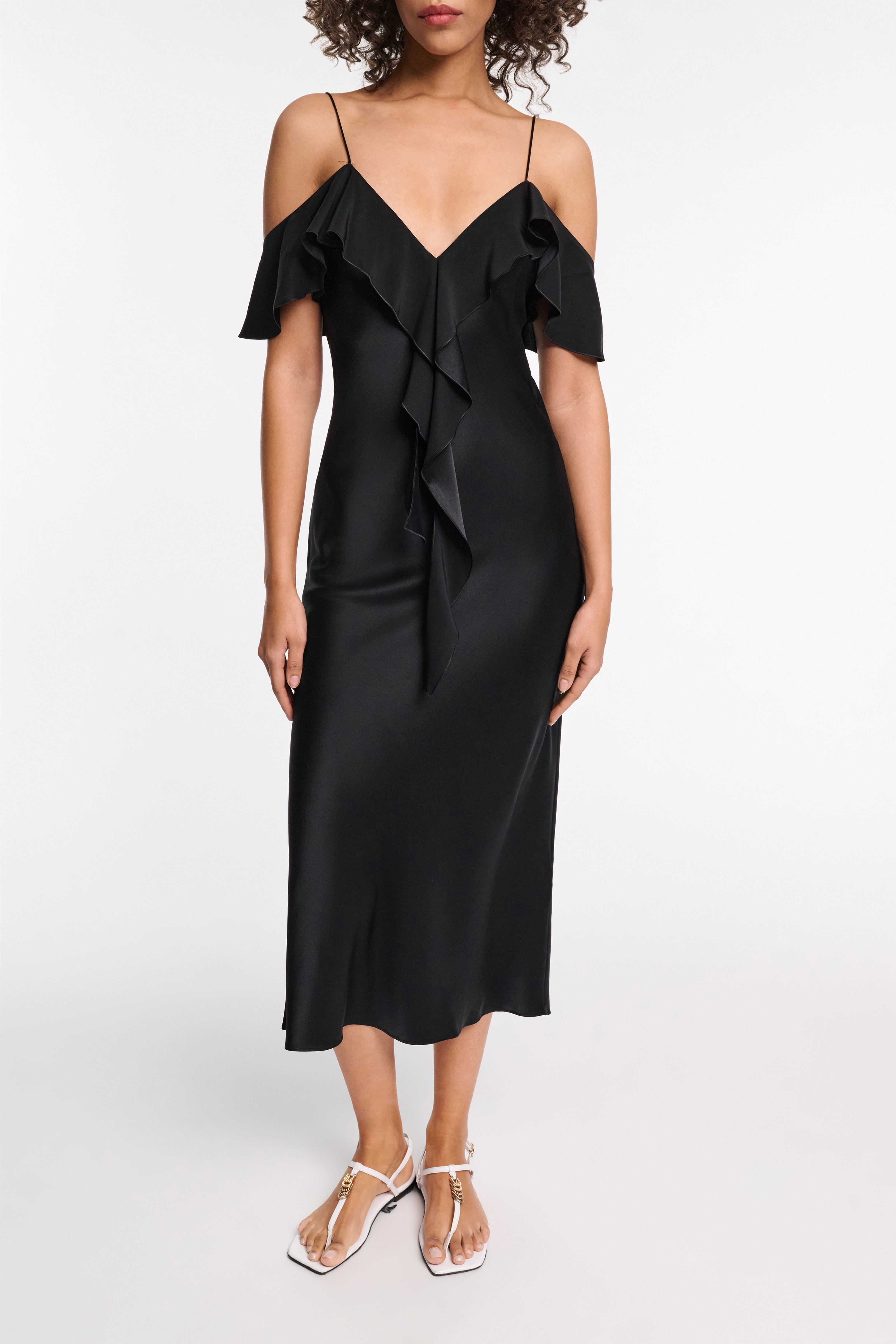 The ruffle dress is made from silk satin and has double straps for multiple ways to wear.
