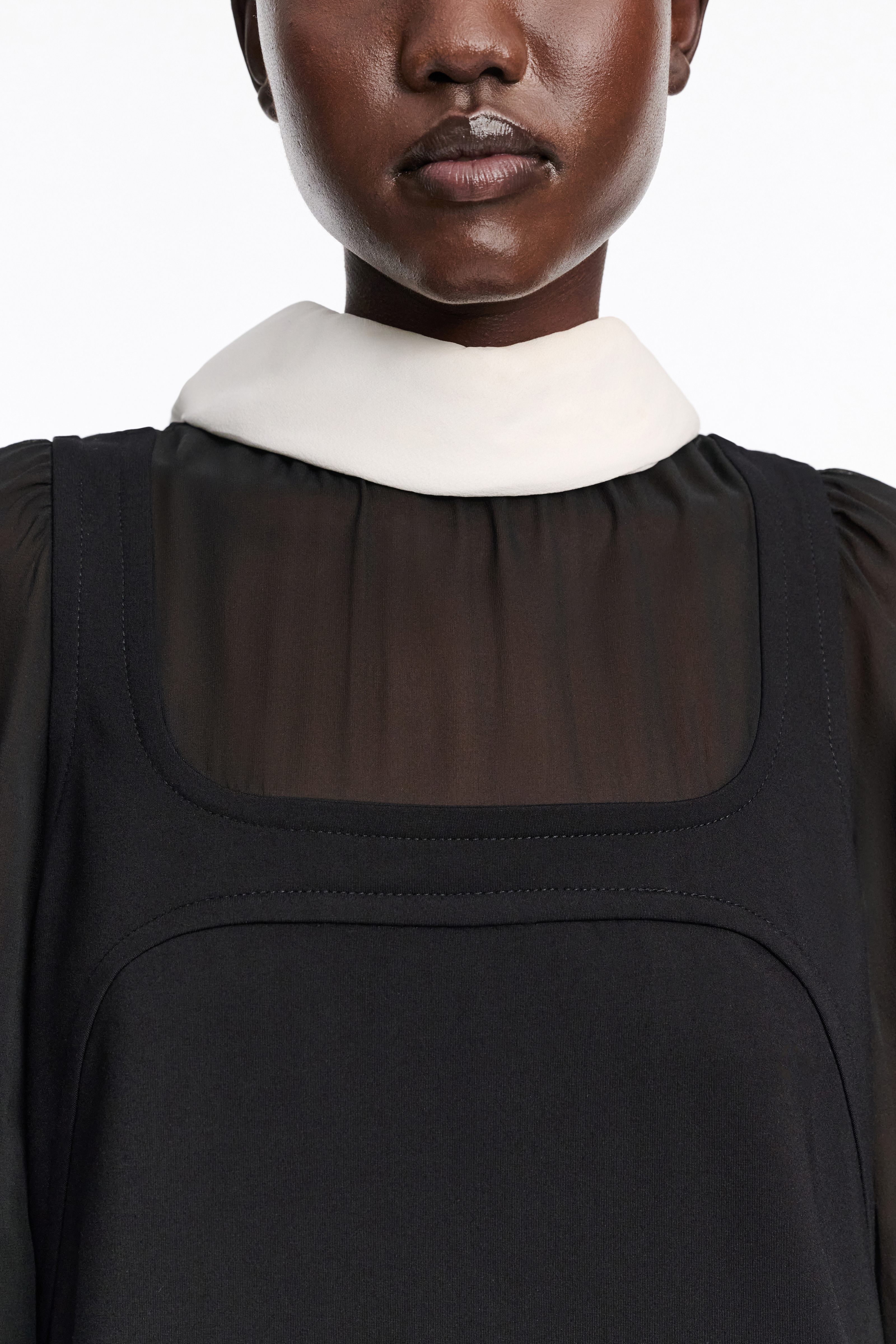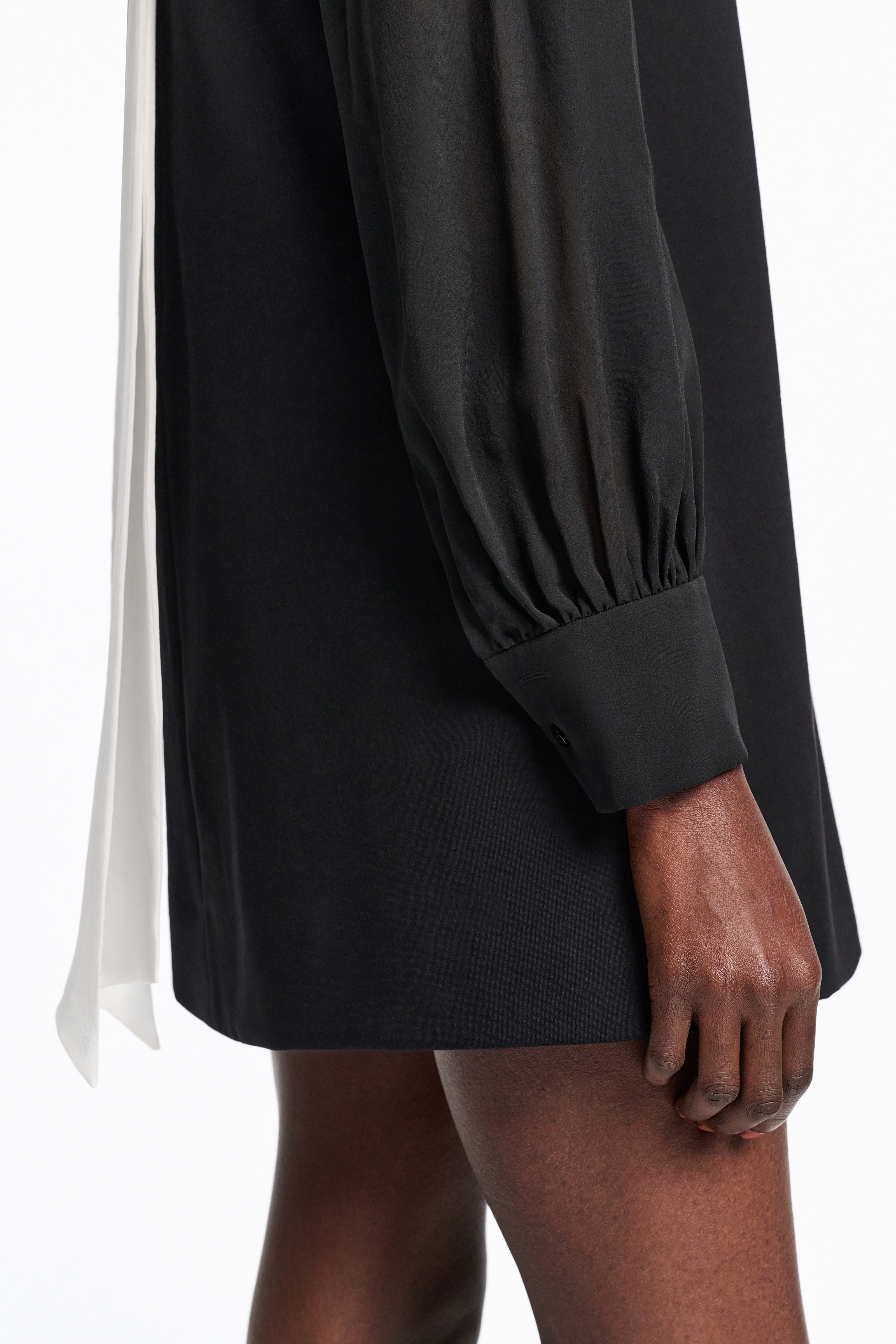 The minidress is detailed in our forever favorite Punto Milano and two-tone silk georgette.
