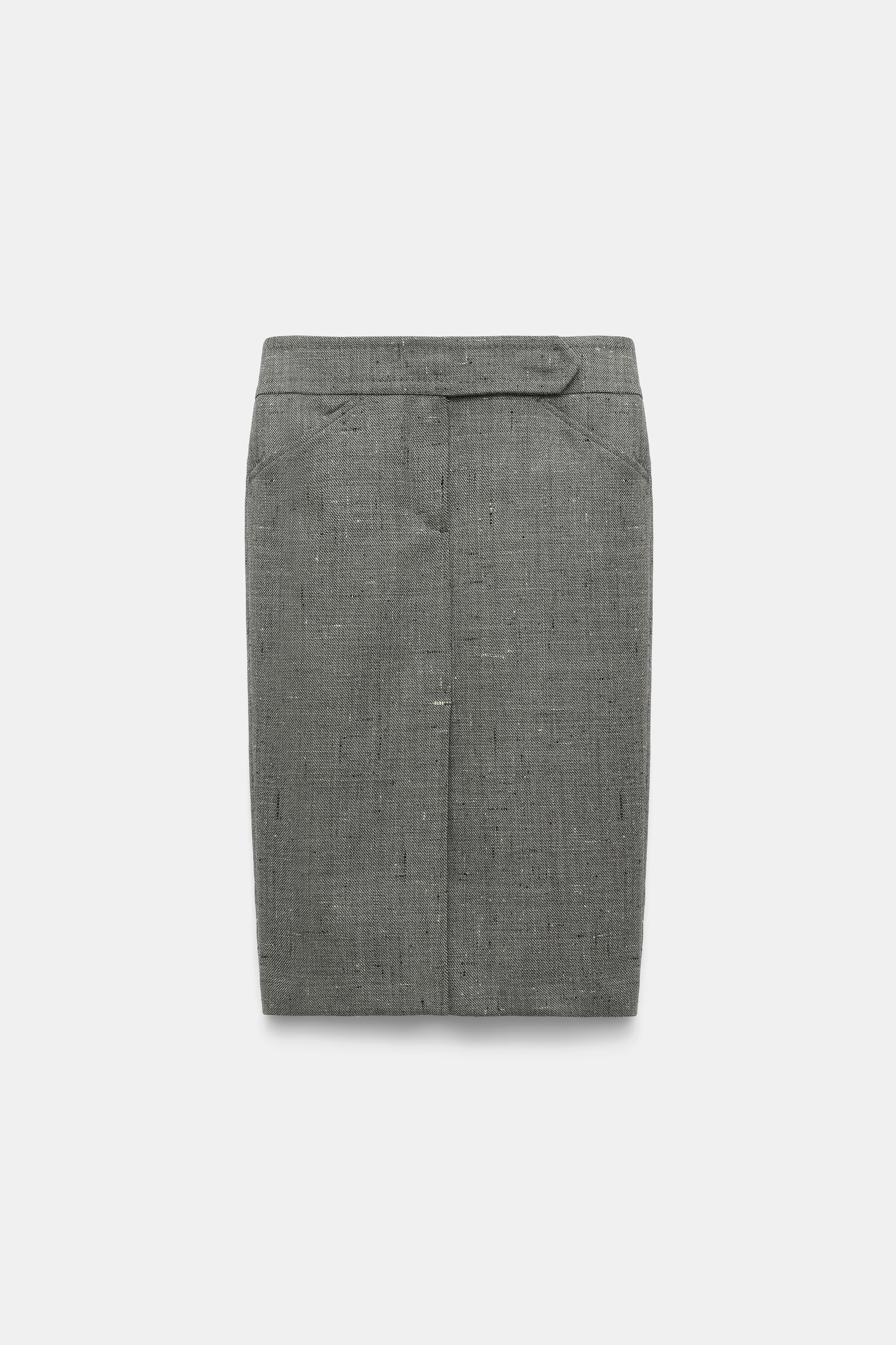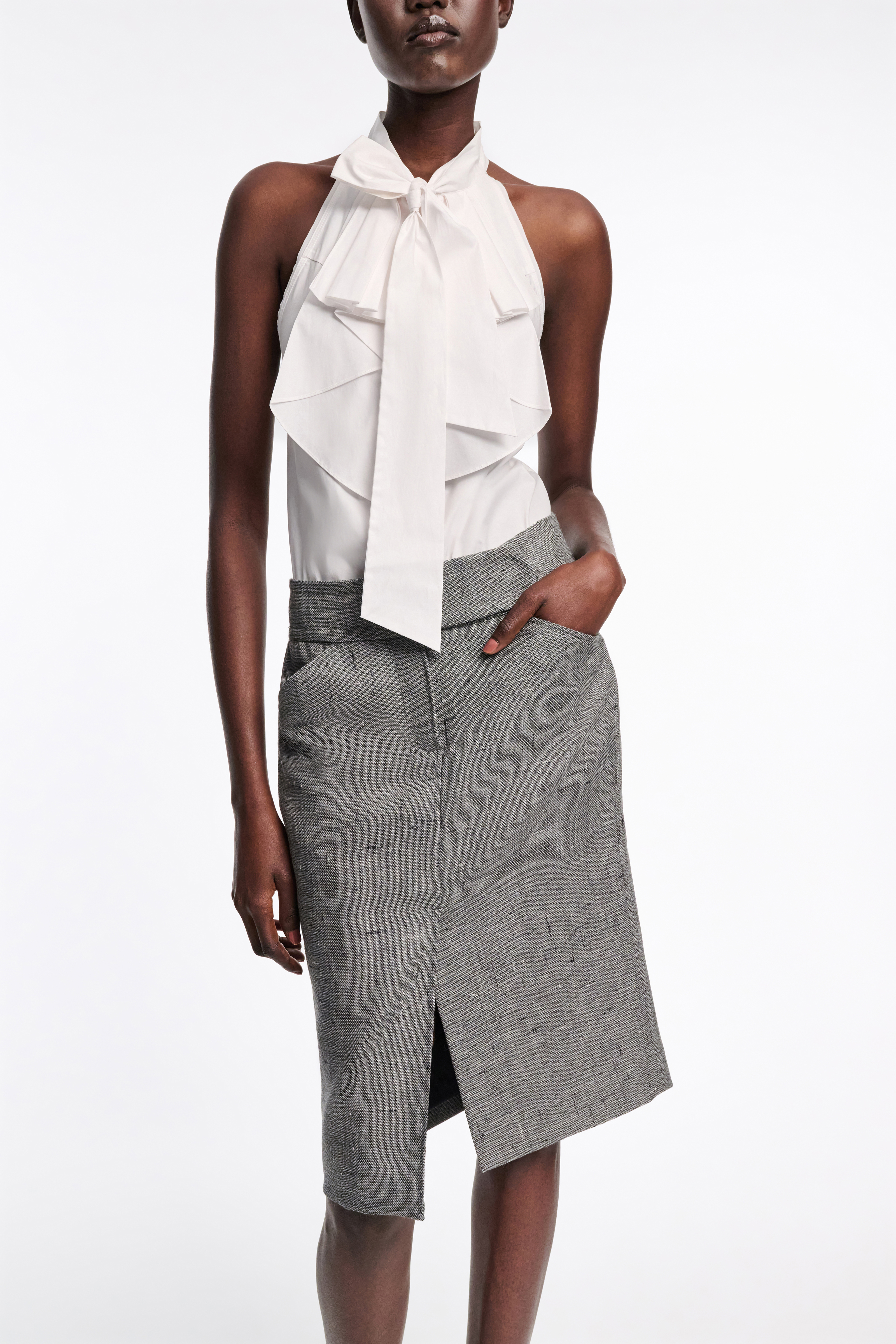 Detailed in salt & pepper virgin wool tweed, the pencil skirt defines our business look this season.
