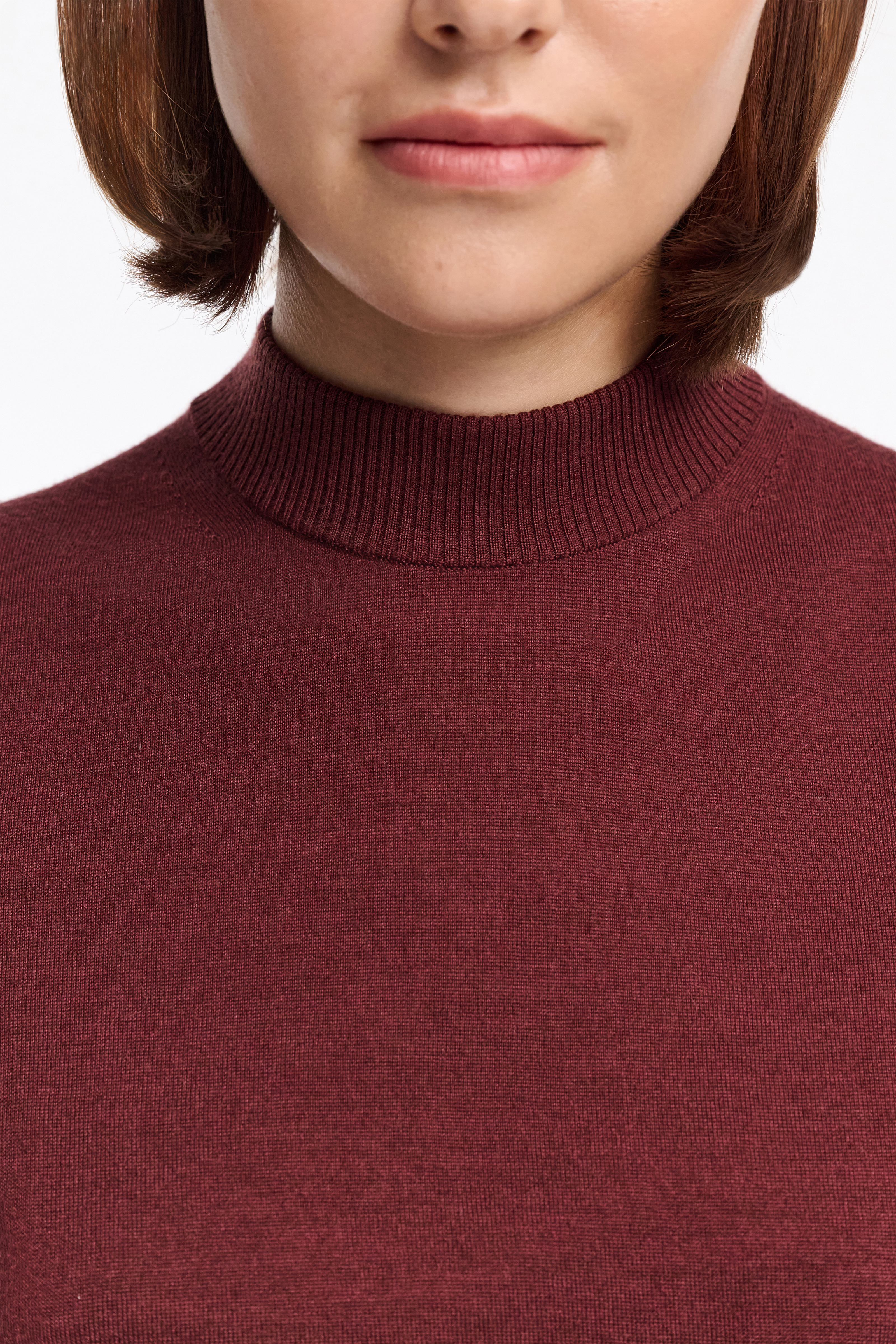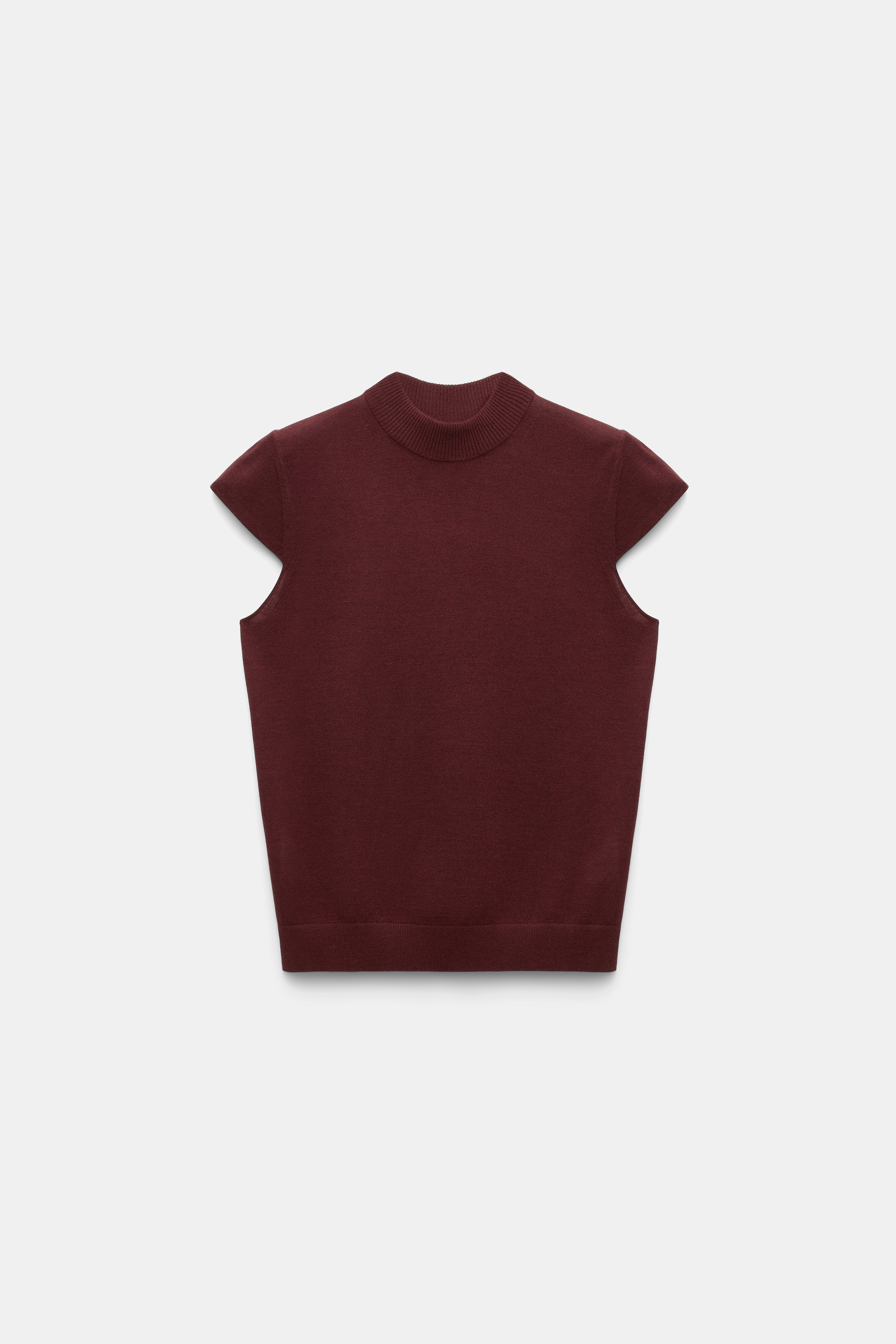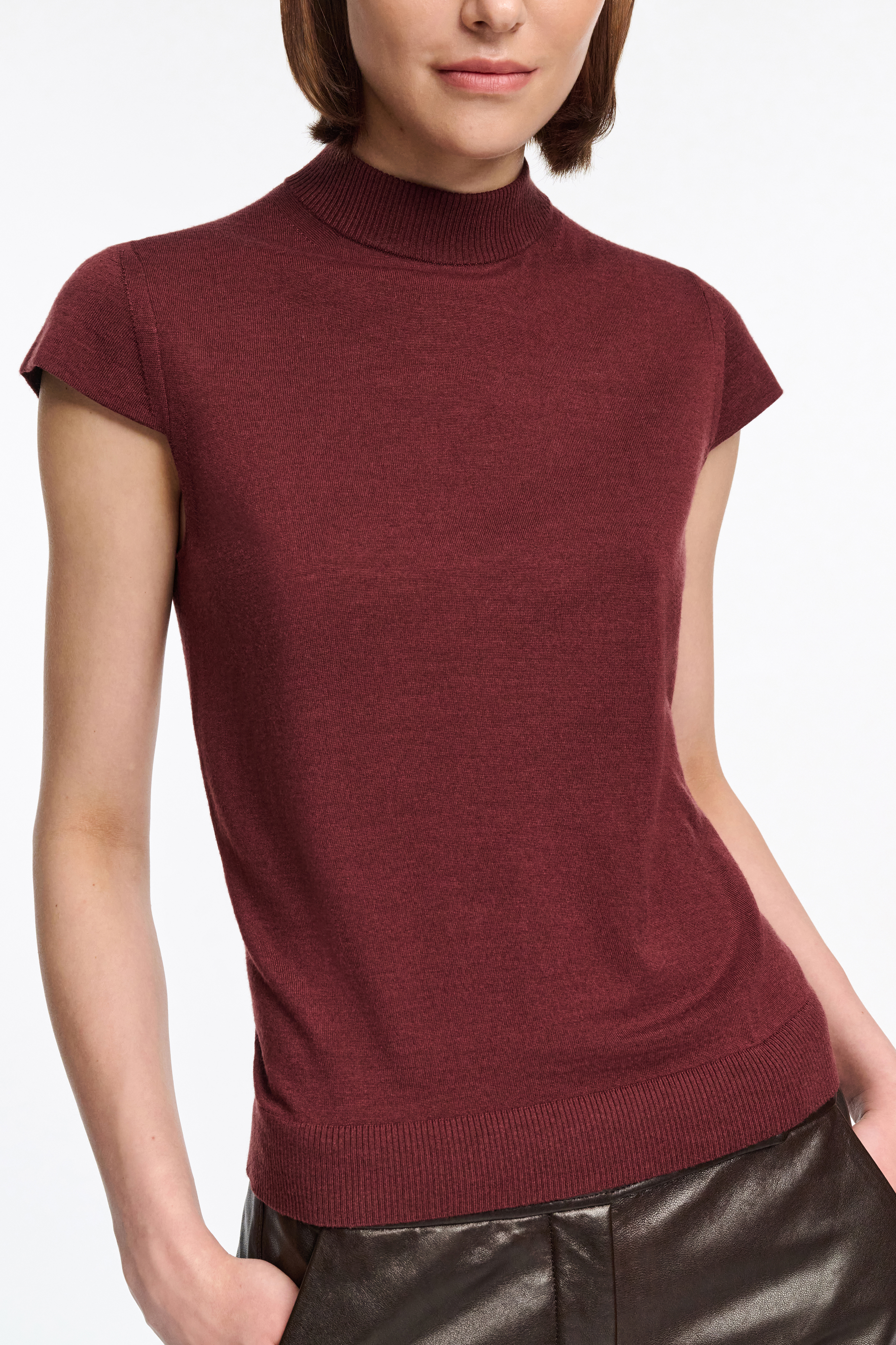 The knit top has a short stand collar and is made from a fine virgin Merino-silk mix.